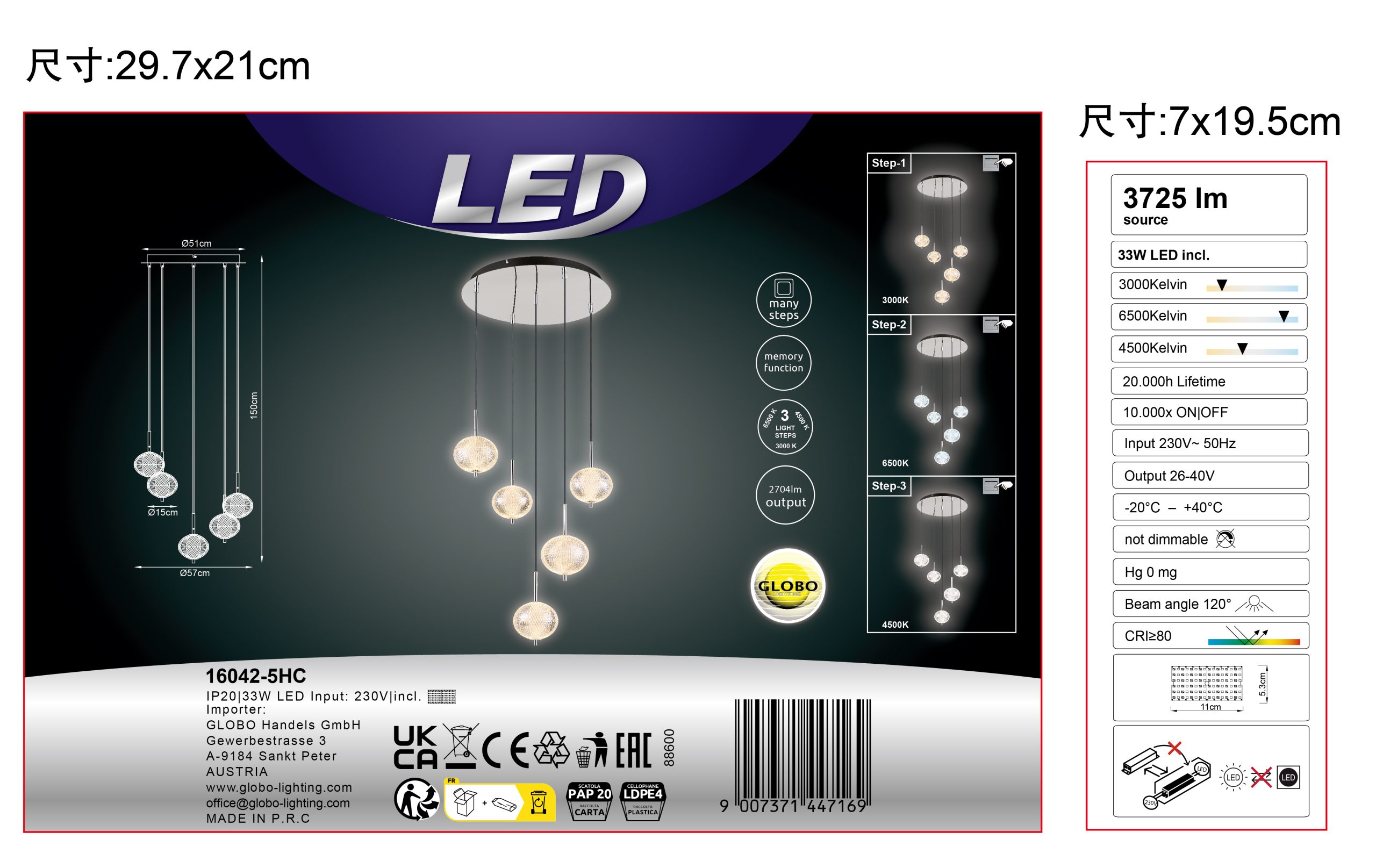 Viseća lampa AIDA je moderna i stilska viseća lampa koja zaista privlači pažnju svojim okruglim dizajnom i 5 držača. Metalno telo lampe je hromirano, što joj daje elegantan izgled. Držači viseće lampe AIDA su napravljeni od akrilnih sfera sa teksturiranom površinom, koje pružaju posebnu difuziju svetlosti. Prozirni akrilni abažur omogućava ravnomernu raspodelu svetlosti, stvarajući prijatnu atmosferu u prostoriji. Poseban vrhunac viseće lampe AIDA je mogućnost fiksiranja boja držača. Ovo vam omogućava da dizajnirate svetiljku prema svojim individualnim željama i podesite željeni spektar boja. Pored toga, viseća lampa ima funkciju memorije, tako da se vaša podešavanja čuvaju. Sa izlazom od 2704 lumena, viseća lampa AIDA pruža jako osvetljenje. Temperatura boje je promenljiva i može se podesiti od 3000K do 4500K. Otkrijte viseću lampu AIDA i dozvolite sebi da vas inspiriše njena moderna estetika i individualna igra boja. To je savršen izbor za stilsko osvetljavanje vašeg prostora i stvaranje ugodne atmosfere.
