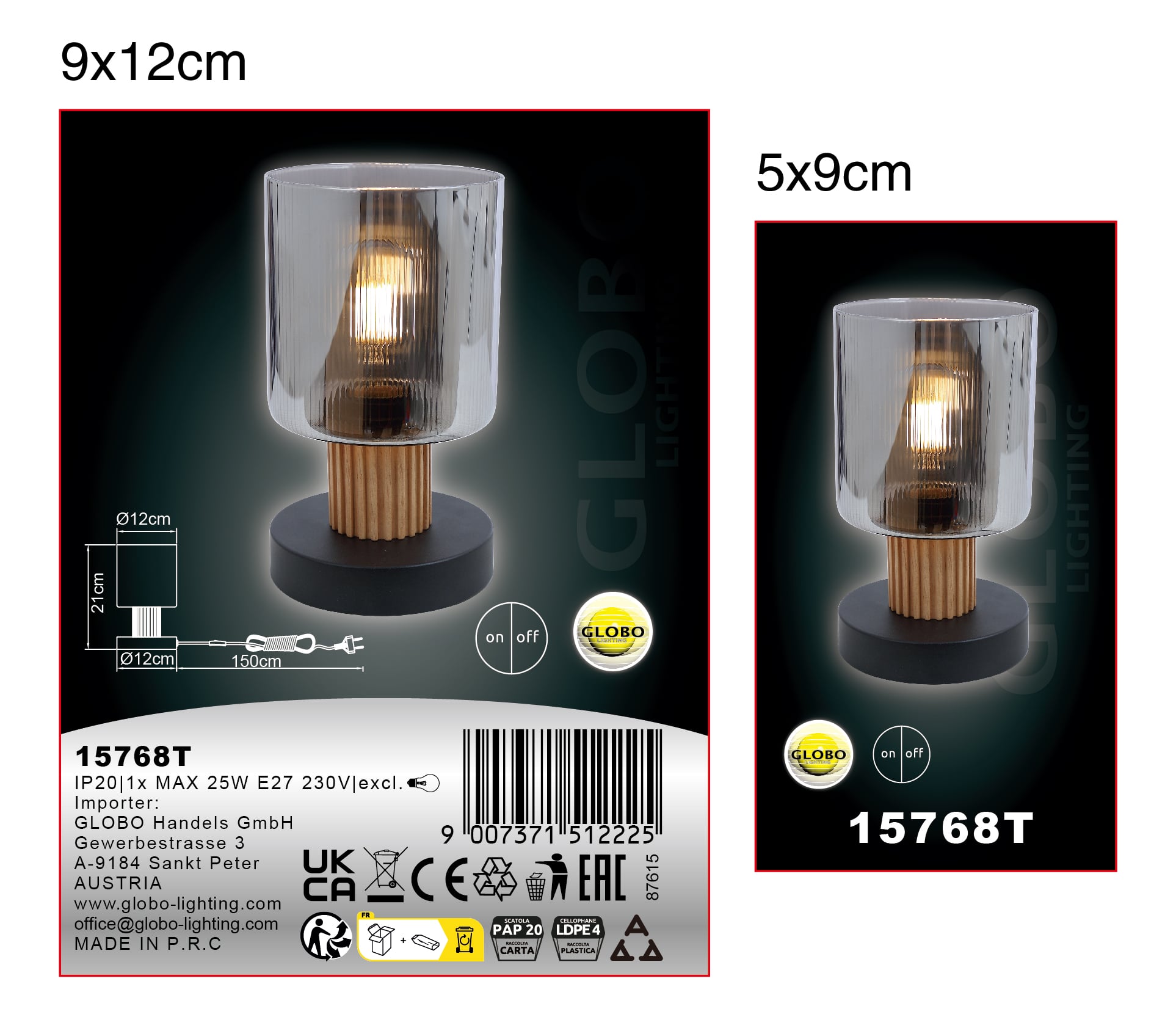 Stona lampa ALEIDIS impresionira svojim dizajnom u obliku šolje i drvenim aplikacijama. Abažur od dimljenog stakla i crno, mat metalno kućište čine harmoničnu kombinaciju zajedno sa tamnosmeđim drvetom. Prekidač na kablu omogućava jednostavno rukovanje. Pogodno za sijalicu E27 (ekskluzivno).