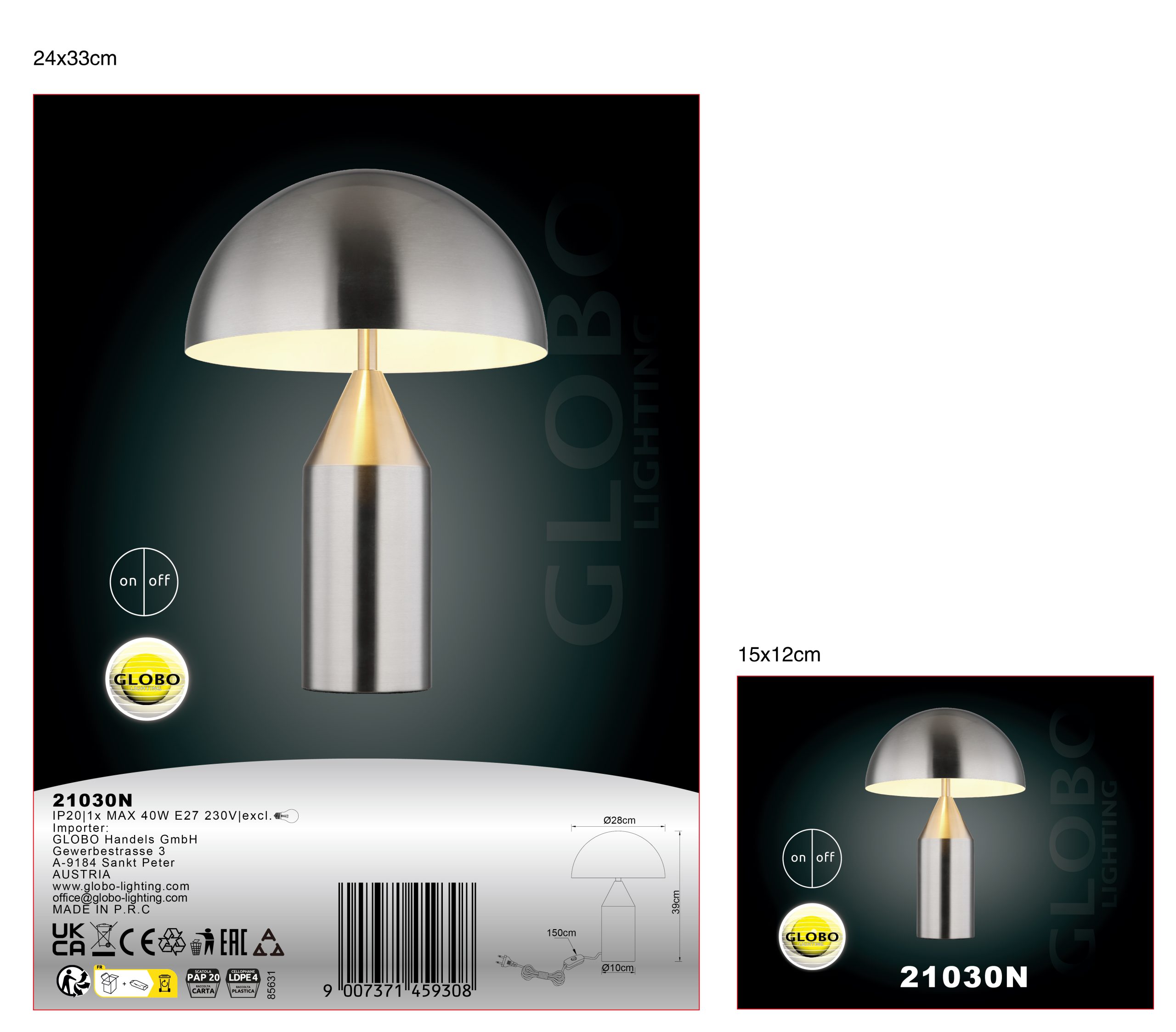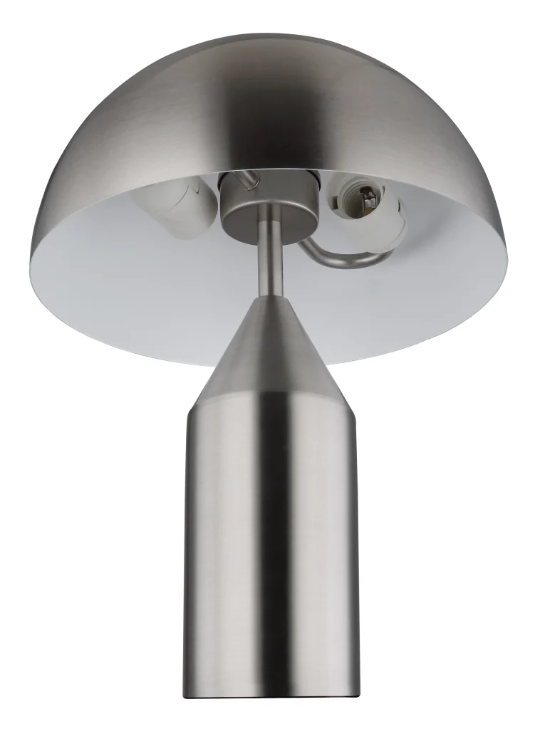 Stona lampa sa cilindričnom osnovom i polukružnim abažurom je moderno i stilsko rešenje za osvetljenje svake prostorije. Napravljena od mat niklovanog metala, stona lampa se predstavlja u šik i bezvremenskom dizajnu. Abažur od mat nikla i belog mat metala obezbeđuje prijatnu difuziju svetlosti i skladan izgled. Sa dva E27 grla, ova stona lampa nudi fleksibilnost u izboru sijalica. Sa prečnikom od 280 mm i ukupnom snagom od 40 W, ova svetiljka pruža dovoljnu osvetljenost za različite primene. Praktični prekidač na kablu olakšava upotrebu. Ova stona lampa kombinuje funkcionalnost i estetiku, što je čini atraktivnim dodatkom svakoj dnevnoj sobi ili radnoj sobi.