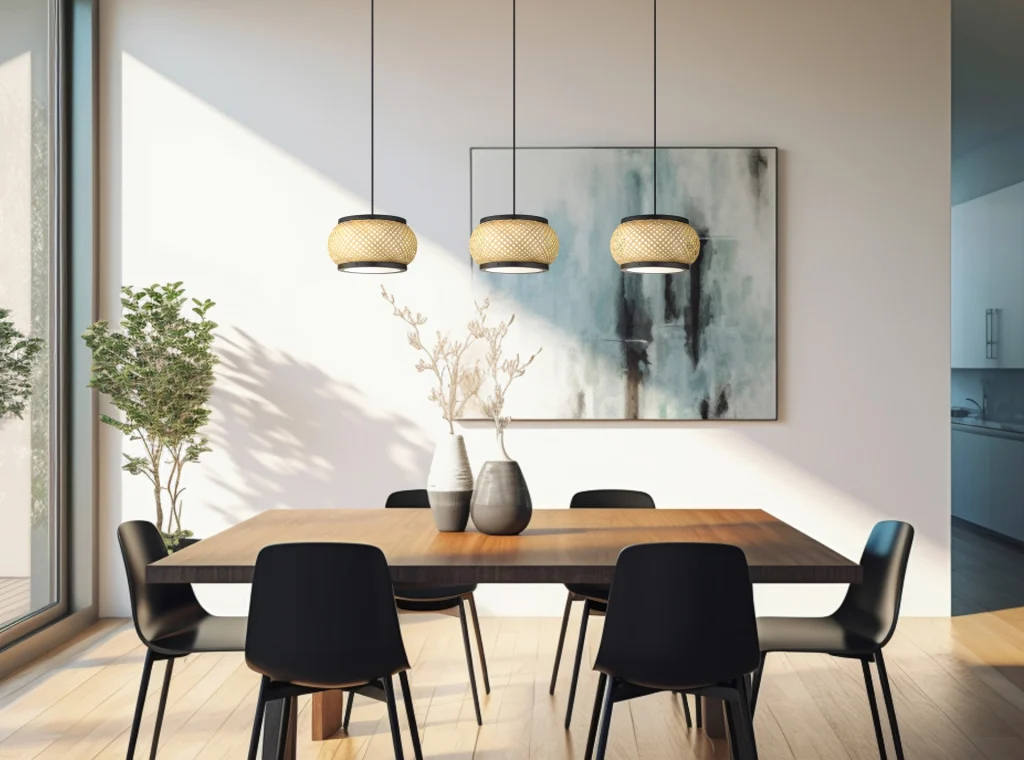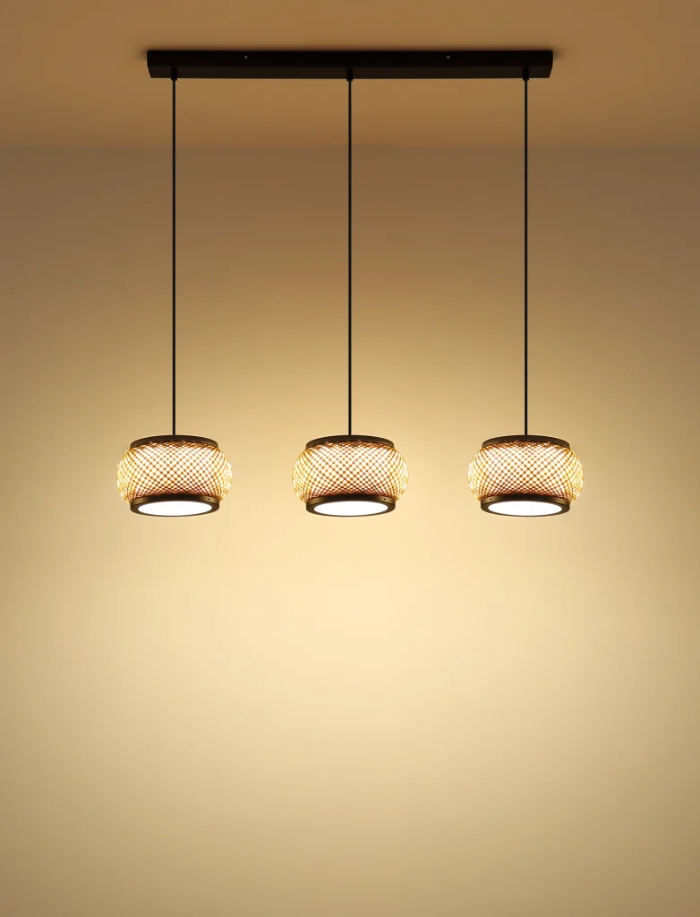 Viseća lampa BAMBORA elegantno kombinuje vintage šarm sa modernom tehnologijom. Ravna šina drži tri lukovičasta abažura napravljena od prirodnog bambusovog tkanja, upotpunjena belim tekstilnim oblogama – stvarajući toplu, organsku fokusnu tačku iznad trpezarijskog stola ili u kuhinji. Mat crni metalni okvir pruža stilski kontrast prirodnoj estetici bambusa, dajući svetiljci premium osećaj. Sa dimenzijama 1000 × 220 mm i snagom od 2340 lumena, BAMBORA pruža svetlo, ali atmosfersko osvetljenje. Njena integrisana LED tehnologija obezbeđuje efikasno i dugotrajno osvetljenje. Zahvaljujući CCT funkciji, temperatura boje se može glatko podešavati između 3000 K (toplo bela) i 6000 K (dnevno bela). Pojedinačne boje se mogu fiksirati, a funkcija memorije bez napora poziva poslednje podešavanje.