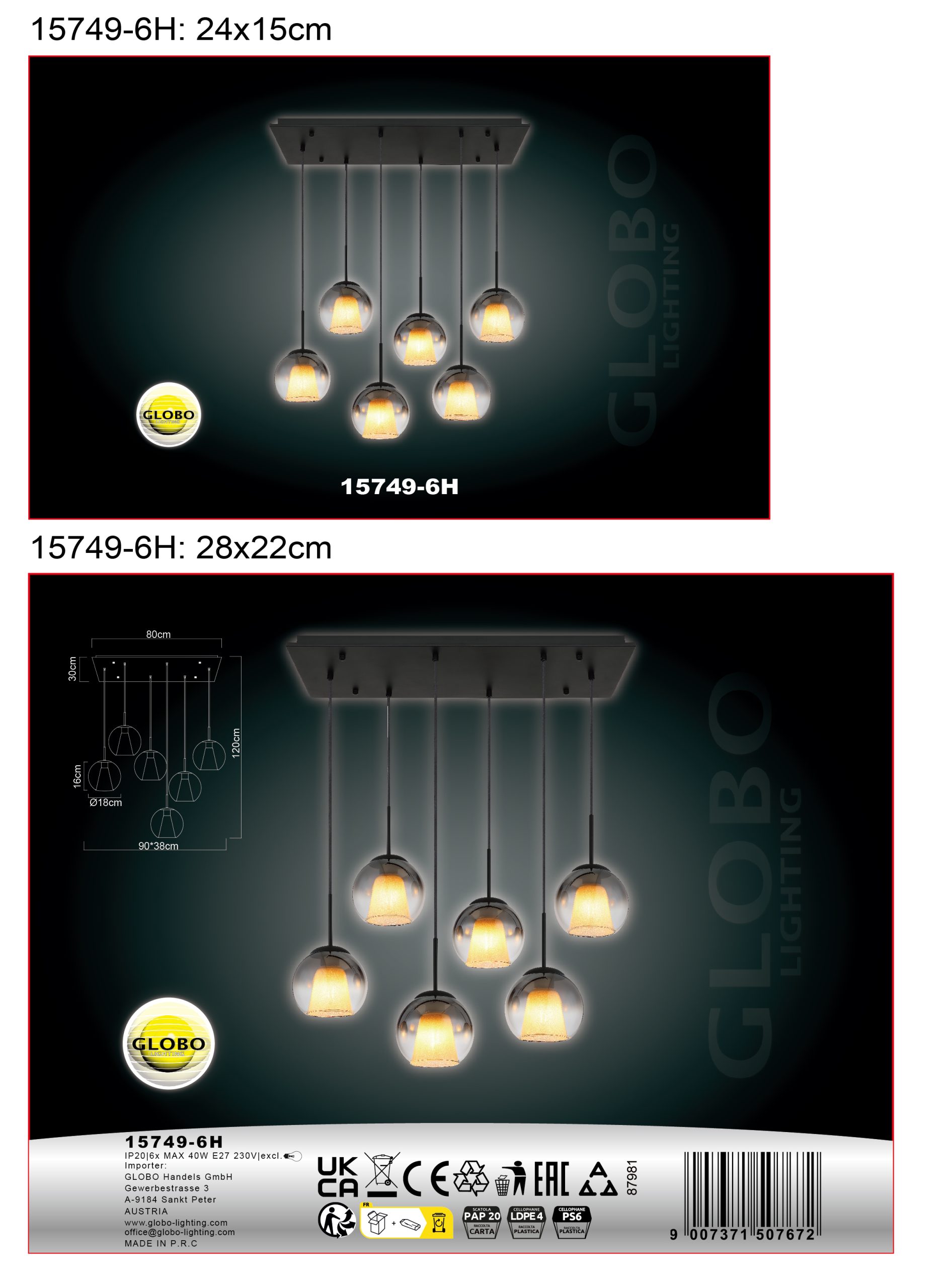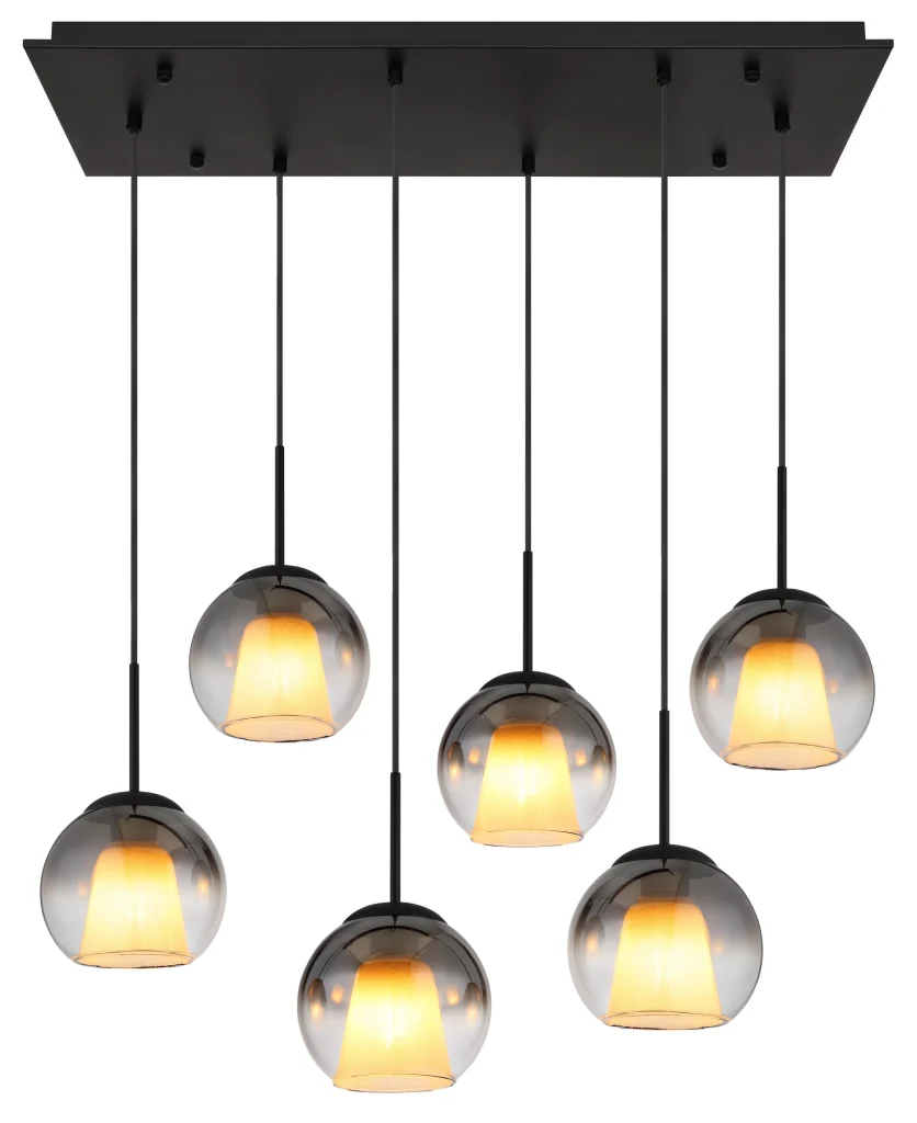 Pravougaona viseća lampa BARRY sa šest staklenih sfera je impresivan element osvetljenja koji će svaku prostoriju učiniti sjajnom. Telo napravljeno od mat crnog lakiranog metala pruža moderan izgled, dok dimljene staklene sfere sa providnim gradijentom i unutrašnjim kristalnim staklom daju plemenit izgled. Sa dimenzijama od 900 mm dužine i 380 mm širine, ova viseća lampa je idealna za velike trpezarije ili otvorene kuhinje. Providni stakleni kristali unutar sfera pružaju blistave svetlosne efekte i stvaraju privlačnu atmosferu. Sa grlom E27, viseća lampa BARRY nudi fleksibilne opcije osvetljenja i može se savršeno integrisati u vaš individualni koncept životnog prostora.