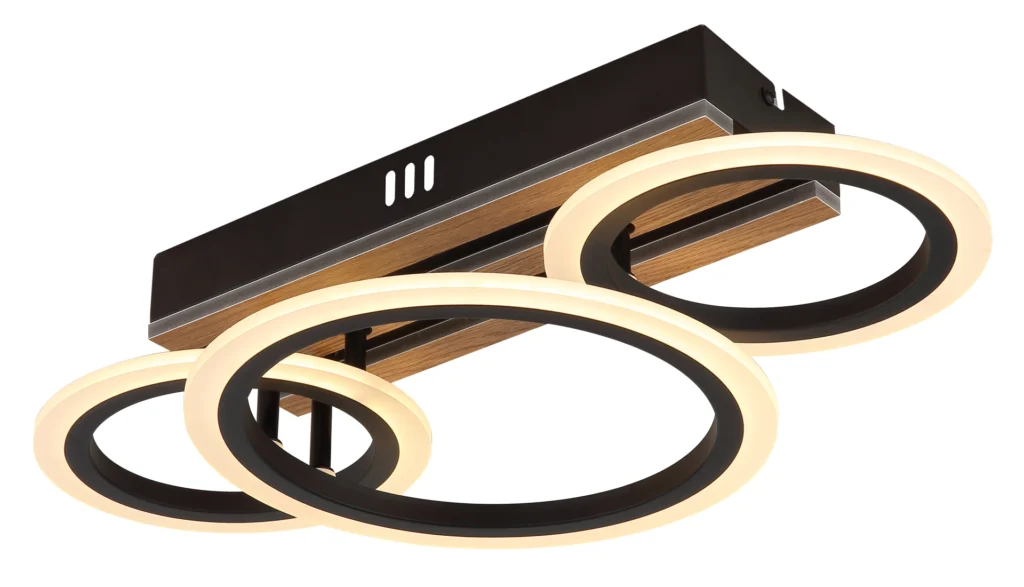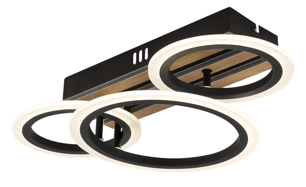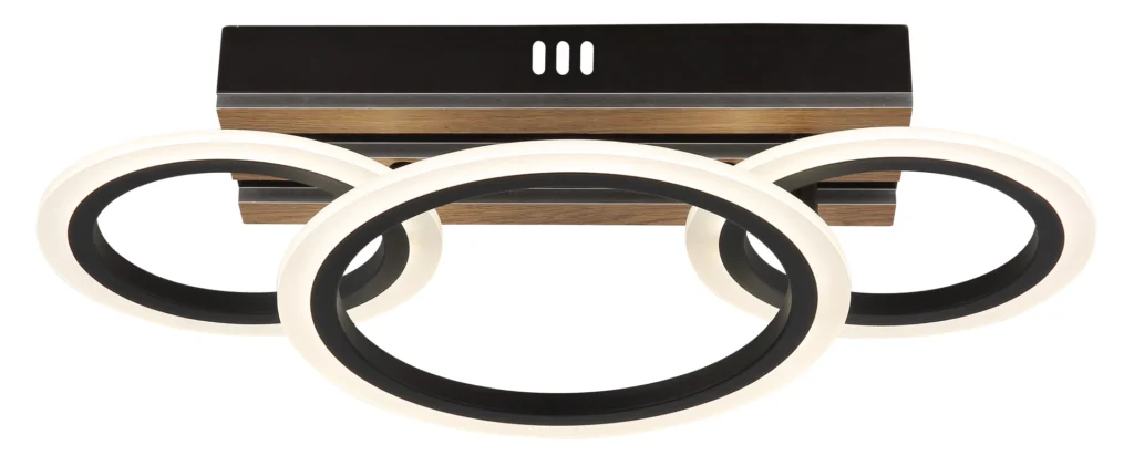 Plafonska lampa BLEVINS impresionira svojim modernim dizajnom i funkcionalnim karakteristikama koje ulepšavaju svaki dom. Pravougaono telo napravljeno od mat crnog metala zaokruženo je elegantnim MDF aplikacijama sa izgledom drveta, koje lampi daju topao i prirodan izgled. Tri vešto postavljena prstena obezbeđuju dinamičan izgled i čine lampu pravim vrhuncem u vašoj sobi. Abažur napravljen od opal plastike obezbeđuje ravnomernu, prijatnu raspodelu svetlosti. Sa CCT od 3000K do 6500K, temperatura boje se može individualno podešavati, dok funkcija memorije čuva vaša željena podešavanja. Plafonska lampa BLEVINS nudi snaga lumena od 1210 lumena, što obezbeđuje efikasno osvetljenje. Uključujući LED sijalice, ne samo da nudi odličnu osvetljenost, već i visoku energetsku efikasnost i idealna je za moderne, stilski osveštene prostorije.