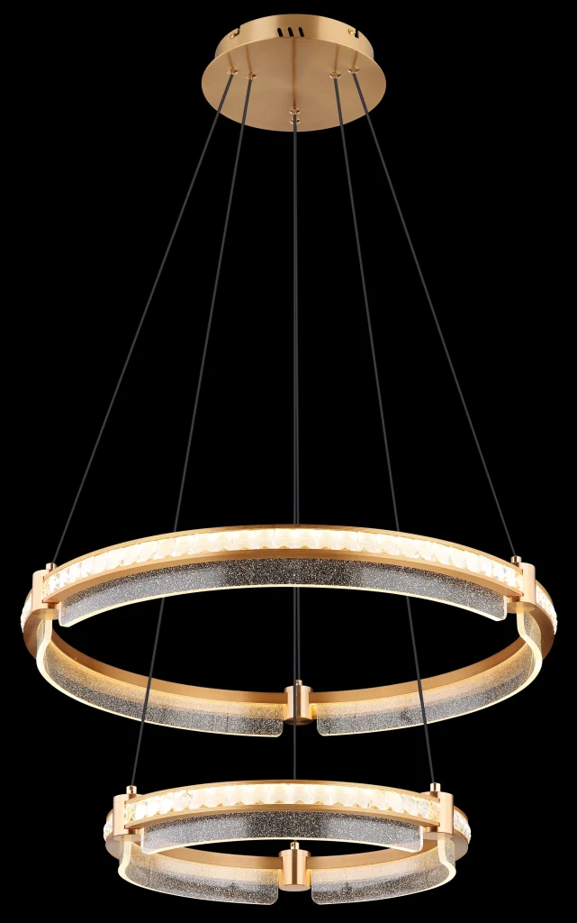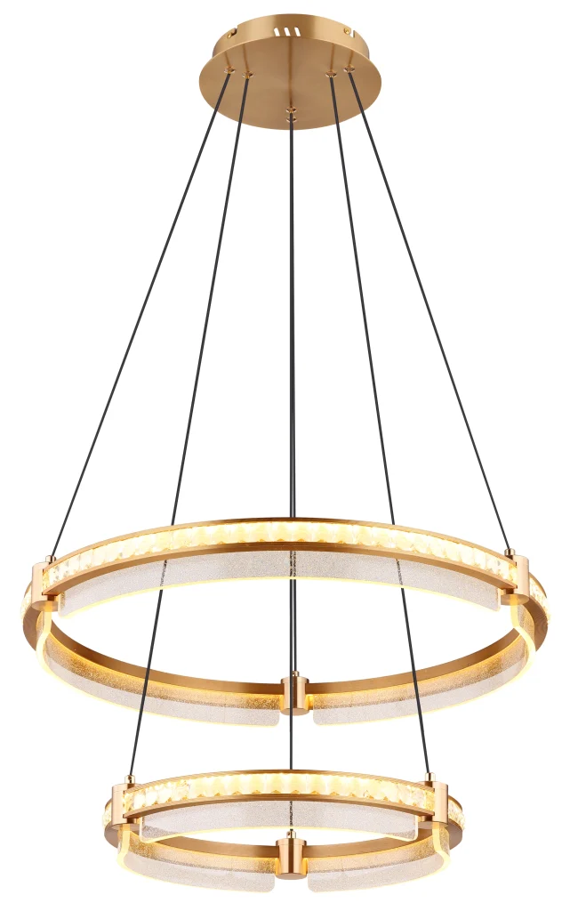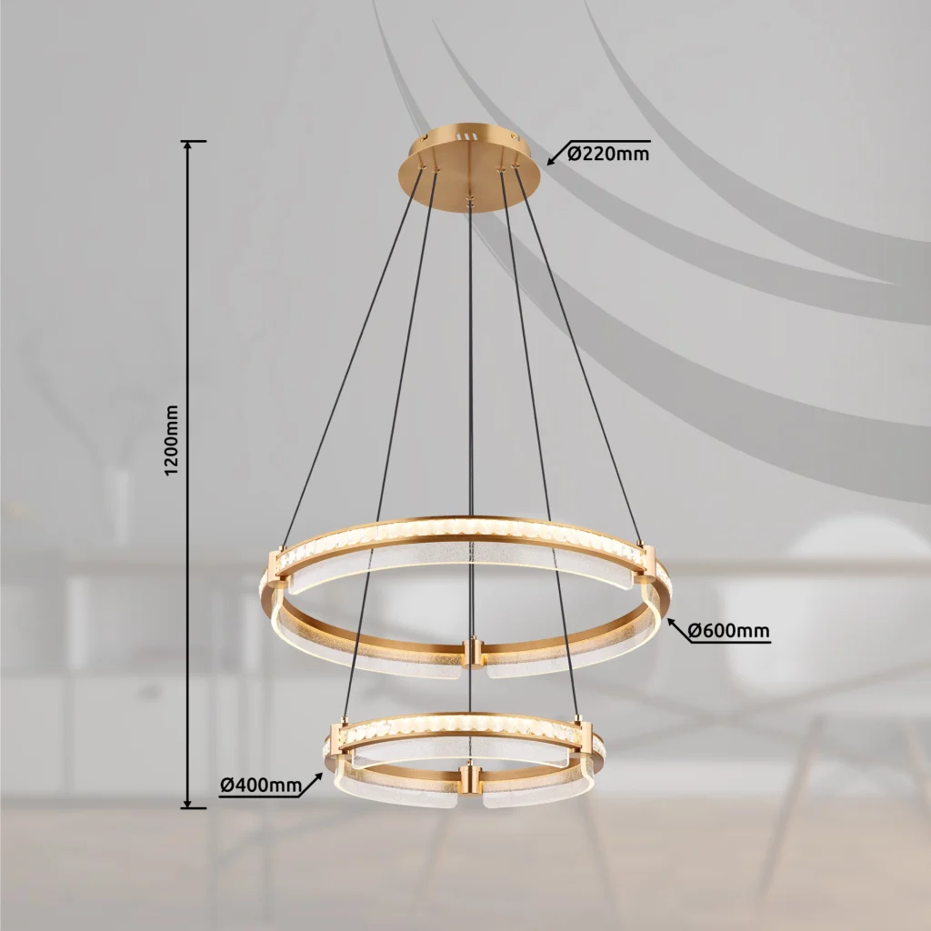 Okrugla viseća lampa BLONDI je apsolutni vrhunac za svaku prostoriju. Sa jedinstvenim dizajnom i visokokvalitetnim materijalima, dodaće dašak luksuza i elegancije vašem domu. BLONDI je sastavljena od dva prstenasta elementa napravljena od brušenog aluminijuma u zlatnim bojama. Abažur je napravljen od providnih K5 kristala i providnog akrila, što stvara fascinantnu igru svetlosti i senke. Pomoću priloženog daljinskog upravljača možete prilično praktično kontrolisati osvetljenje. Viseća lampa se može prigušiti, tako da možete pojedinačno podešavati osvetljenost. Pored toga, imate mogućnost da fiksirate svoju omiljenu boju, a integrisana funkcija memorije čuva vaša podešavanja. Viseća lampa BLONDI ima prečnik od 600 mm i proizvodi impresivan snaga lumena od 4143. Zahvaljujući podesivoj CCT od 2700K do 6000K, možete odabrati boju svetlosti po želji. Sa visećom lampom BLONDI, možete se osloniti na izvanredan dizajn i visokokvalitetnu izradu. Stvorite luksuznu atmosferu u svom domu i uživajte u blistavom sjaju koji ova rasveta zrači.