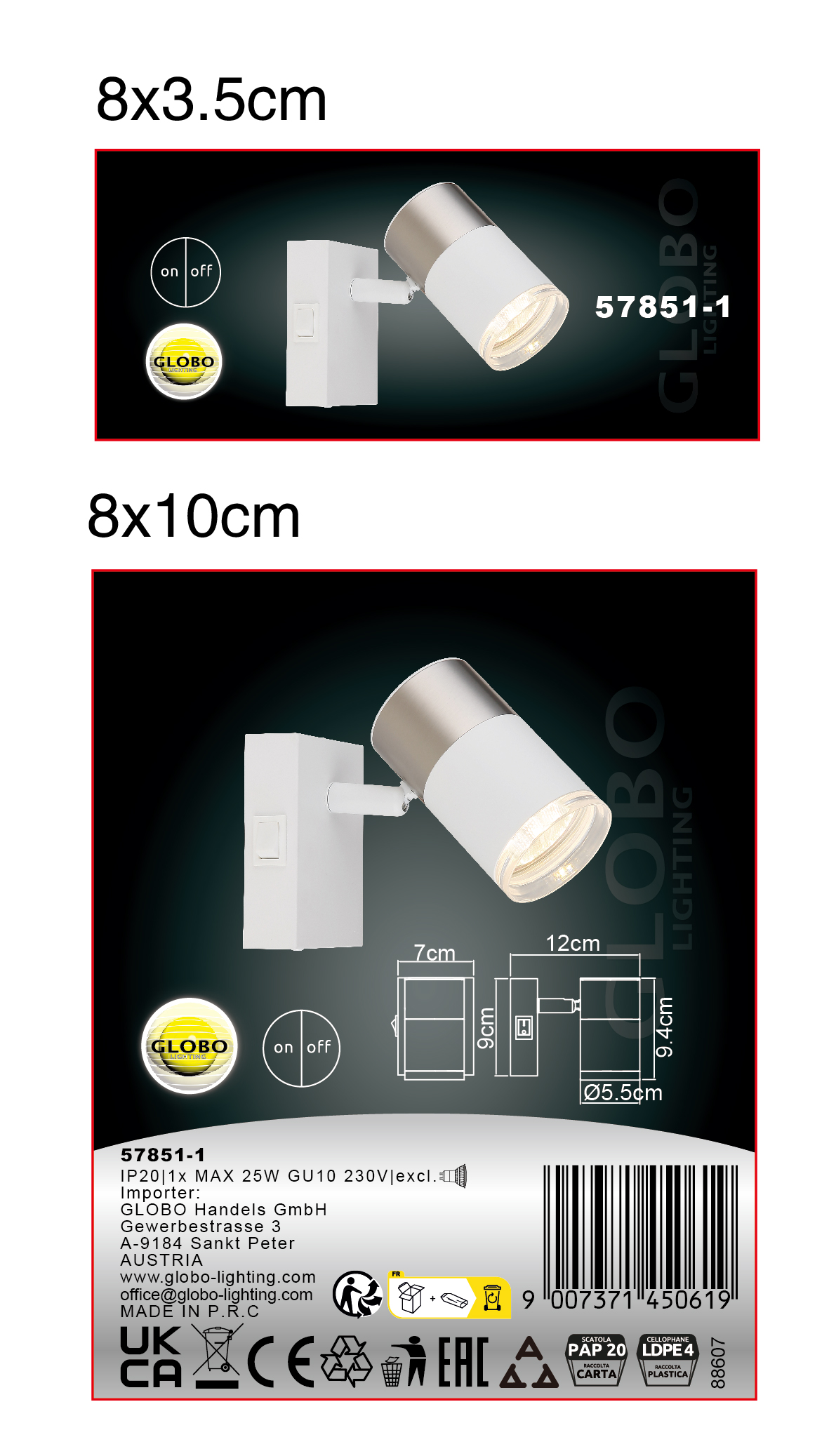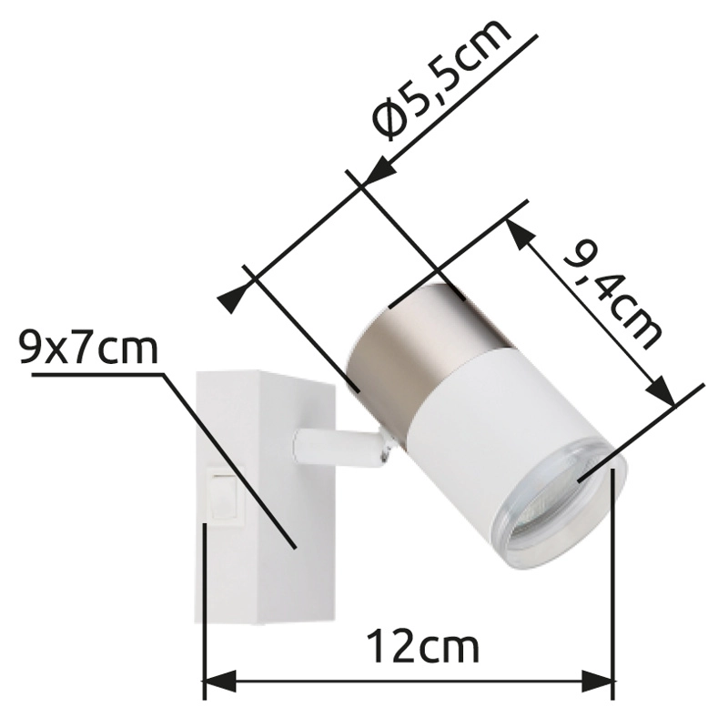 Bela zidna lampa sa pravougaonim zidnim znakom i cilindričnim reflektorom sa dekorativnim prstenom je moderan i bezvremenski element osvetljenja za vaš dom. Reflektor je napravljen od mat belog metala i kombinuje elegantni nikl aluminijum, beli aluminijum i providnu plastiku za stilski izgled. Sa GU10 reflektorom i snagom od 25W, ova zidna lampa nudi svetlo i efikasno osvetljenje za svaku prostoriju. Sa širinom od 70 mm i dužinom od 120 mm, svetiljka se savršeno uklapa na svaki zid i obezbeđuje prijatnu raspodelu svetlosti. Praktični prekidač na artiklu olakšava rukovanje svetiljkom. Postavite stilske akcente u svojoj dnevnoj sobi pomoću ove visokokvalitetne i moderne zidne lampe i stvorite ugodnu atmosferu.