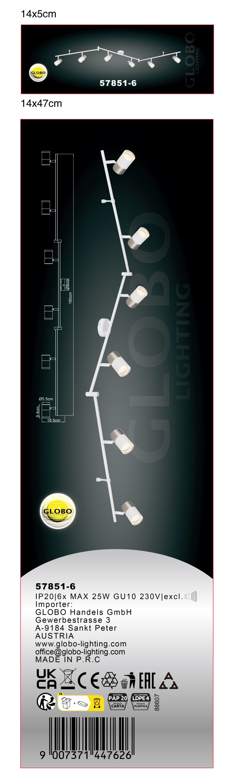Sistem reflektora sa pravim rasporedom i cilindričnim reflektorima sa dekorativnim prstenom je idealan izbor za moderno i stilsko osvetljenje u vašem domu. Izduženi reflektor je napravljen od mat belog metala i sadrži šest GU10 reflektora ukupne snage 25W. Kišobrani su napravljeni od visokokvalitetnog aluminijuma u mat niklu i beloj boji, kao i od providne plastike, što sistemu daje elegantan izgled. Sa impresivnim dimenzijama od 1800 mm dužine i 80 mm širine, ovaj sistem reflektora pruža veliko i efikasno osvetljenje u svakoj prostoriji. Unesite stil i funkcionalnost u svoj dom pomoću ovog sistema reflektora od belog metala i uživajte u prijatnoj atmosferi uz privlačan dizajn.
