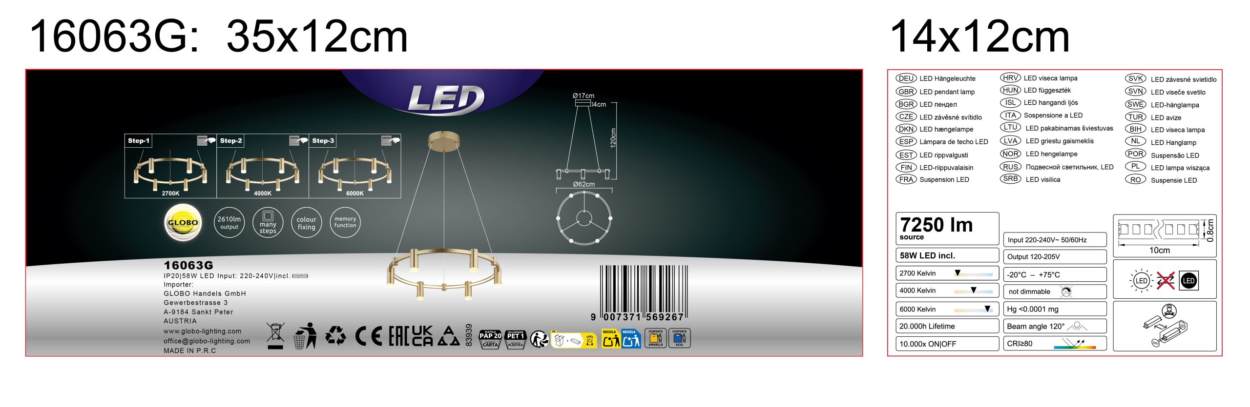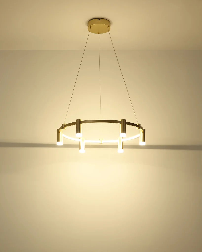 Okrugla viseća lampa CASTELA kombinuje moderan dizajn sa visokokvalitetnom tehnologijom. Zlatna boja, mat metalno kućište, zajedno sa okruglim prstenom i integrisanim reflektorima, stvara stilski akcent za svaku prostoriju. Abažur je napravljen od mat aluminijuma zlatnog izgleda, u kombinaciji sa opalnim akrilom i belim silikonom – harmonična kombinacija materijala za ravnomernu, prijatnu raspodelu svetlosti. Sa prečnikom od 620 mm i impresivnim svetlosnim snagama od 2610 lumena, CASTELA pruža svetlo, ali atmosfersko osvetljenje. Integrisana LED dioda nudi CCT temperaturu boje od 2700 K do 6000 K, omogućavajući glatko podešavanje svetlosti između toplo bele i dnevne bele. Zahvaljujući funkciji memorije i fiksnim bojama, vaša željena podešavanja ostaju trajno sačuvana. Viseća lampa CASTELA je svestrani izvor svetlosti – elegantan, funkcionalan i tehnički sofisticiran. Idealna za moderne dnevne prostore, trpezarije ili reprezentativne sobe.