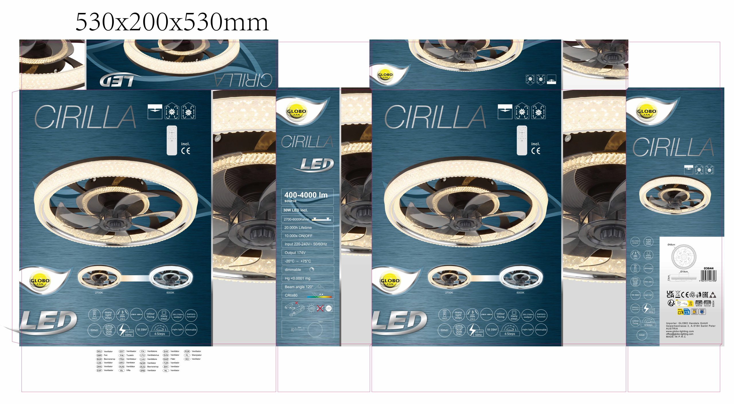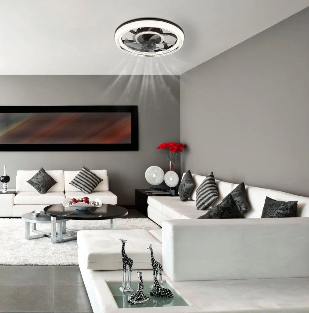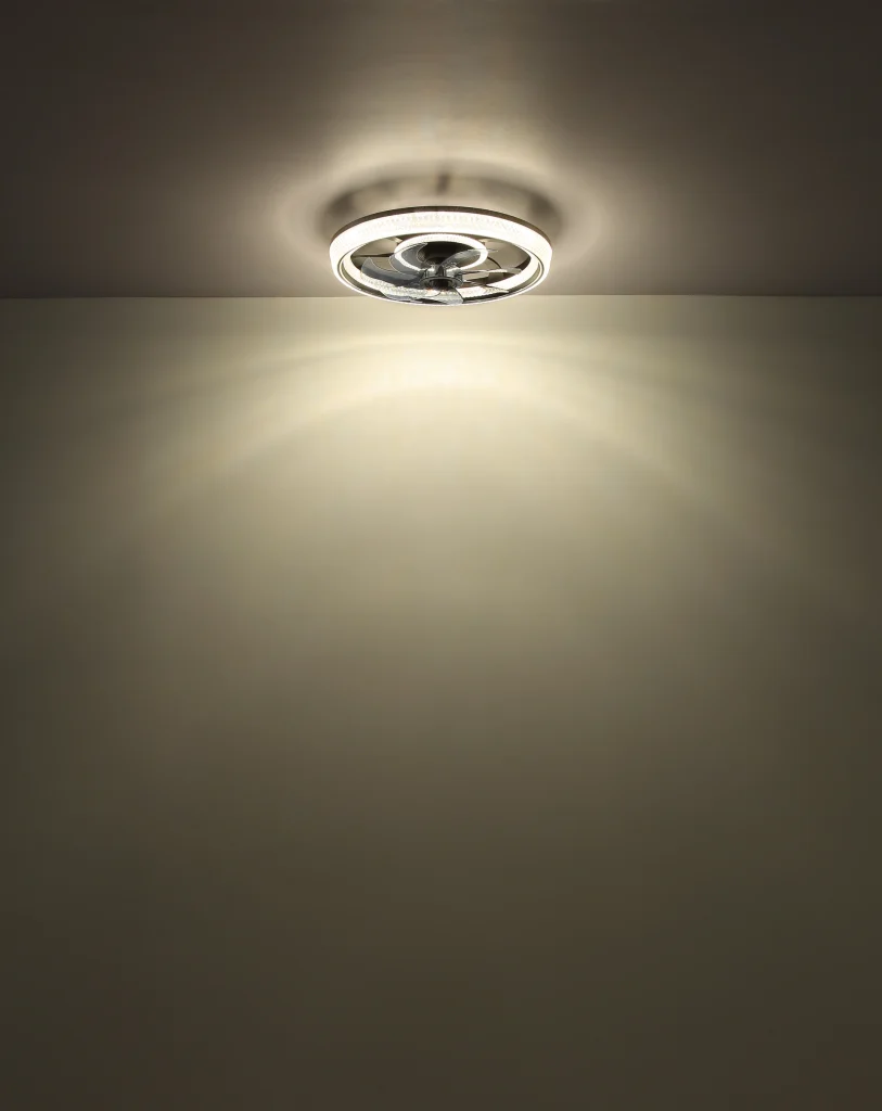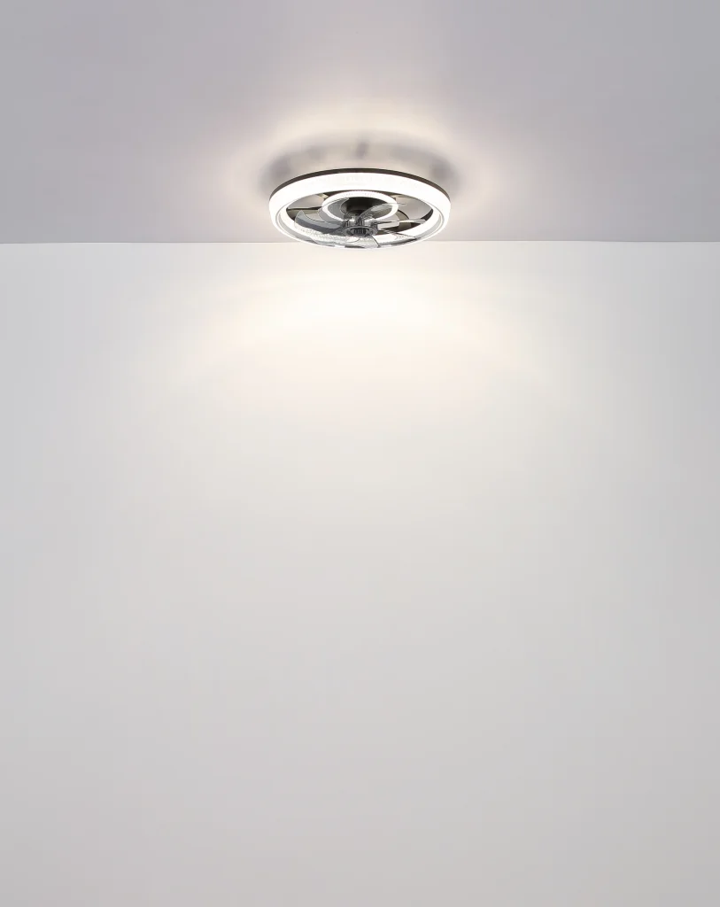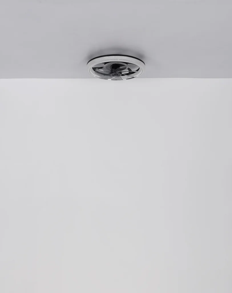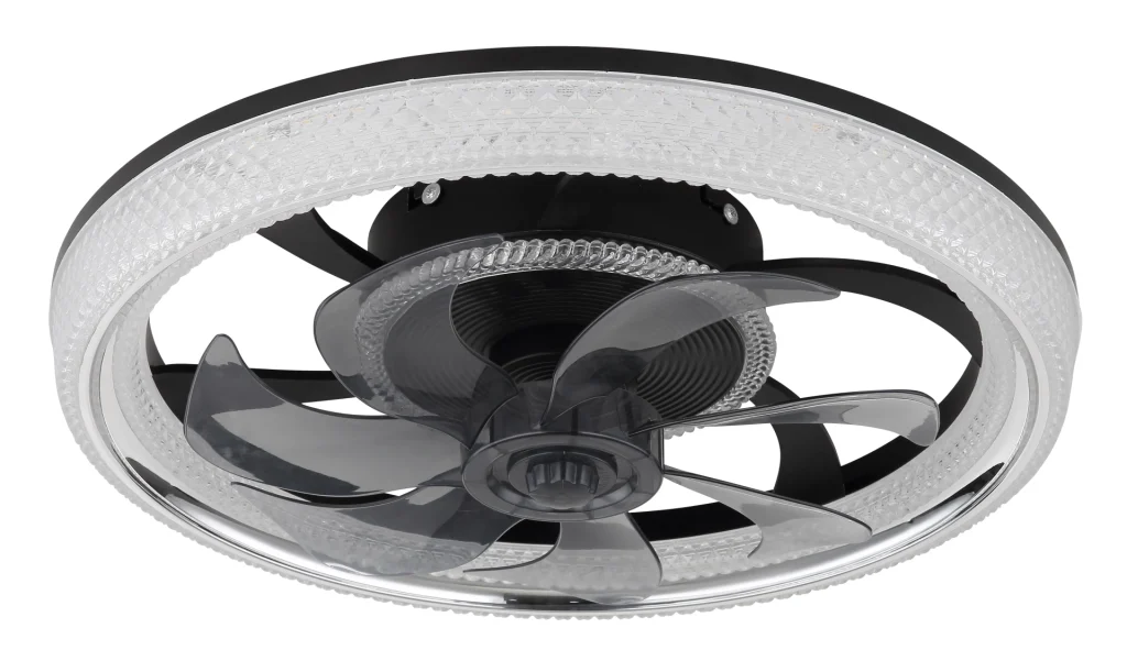 Okrugli plafonski ventilator u mat crnoj boji ne samo da nudi prijatnu cirkulaciju vazduha, već i stilski dizajn sa 7 unutrašnjih lopatica. Telo napravljeno od crne mat plastike i abažur od providnog akrila sa akrilnim kristalima daju ventilatoru moderan izgled. Sa prečnikom od 500 mm i snagom od 30 W, ventilator proizvodi impresivan svetlosni fluks od 2700 lumena na temperaturi boje od 2700K do 6000K. Ovaj plafonski ventilator je opremljen praktičnim daljinskim upravljačem koji se može koristiti za kontrolu dimabilnog LED izvora svetlosti i brzine ventilatora. Boje se mogu fiksirati, funkcija memorije i integrisano noćno svetlo zaokružuju funkcionalnost ovog ventilatora. Stilan i praktičan element za svaku prostoriju.