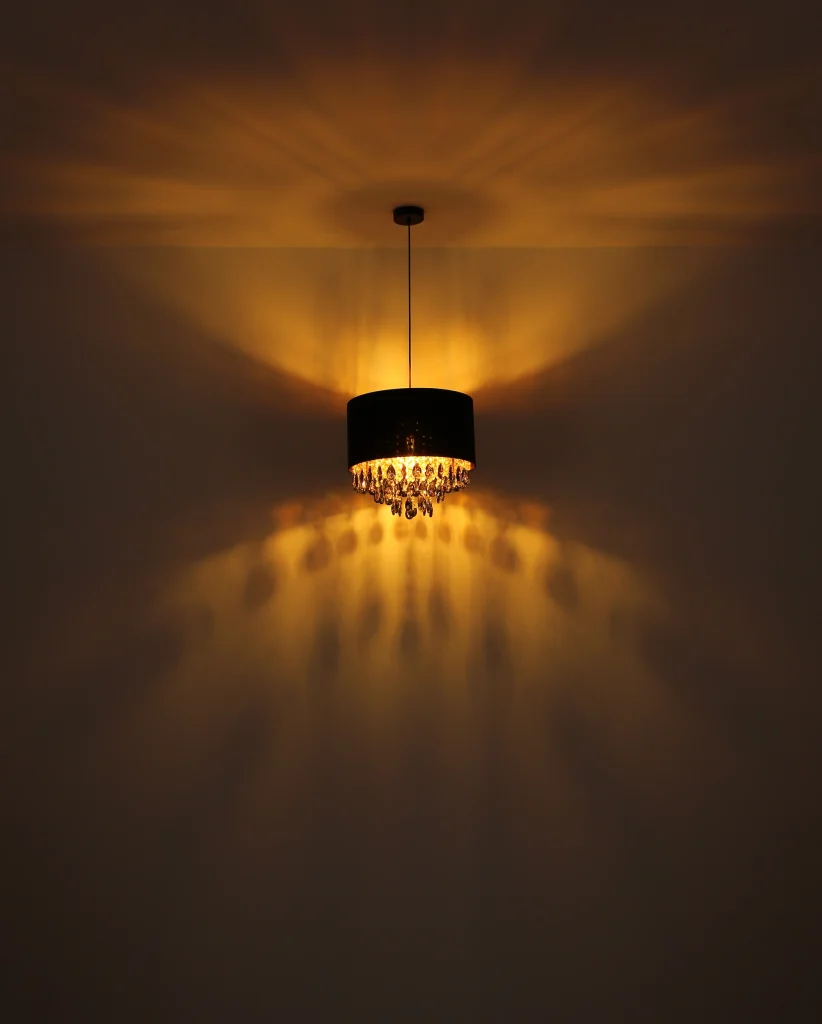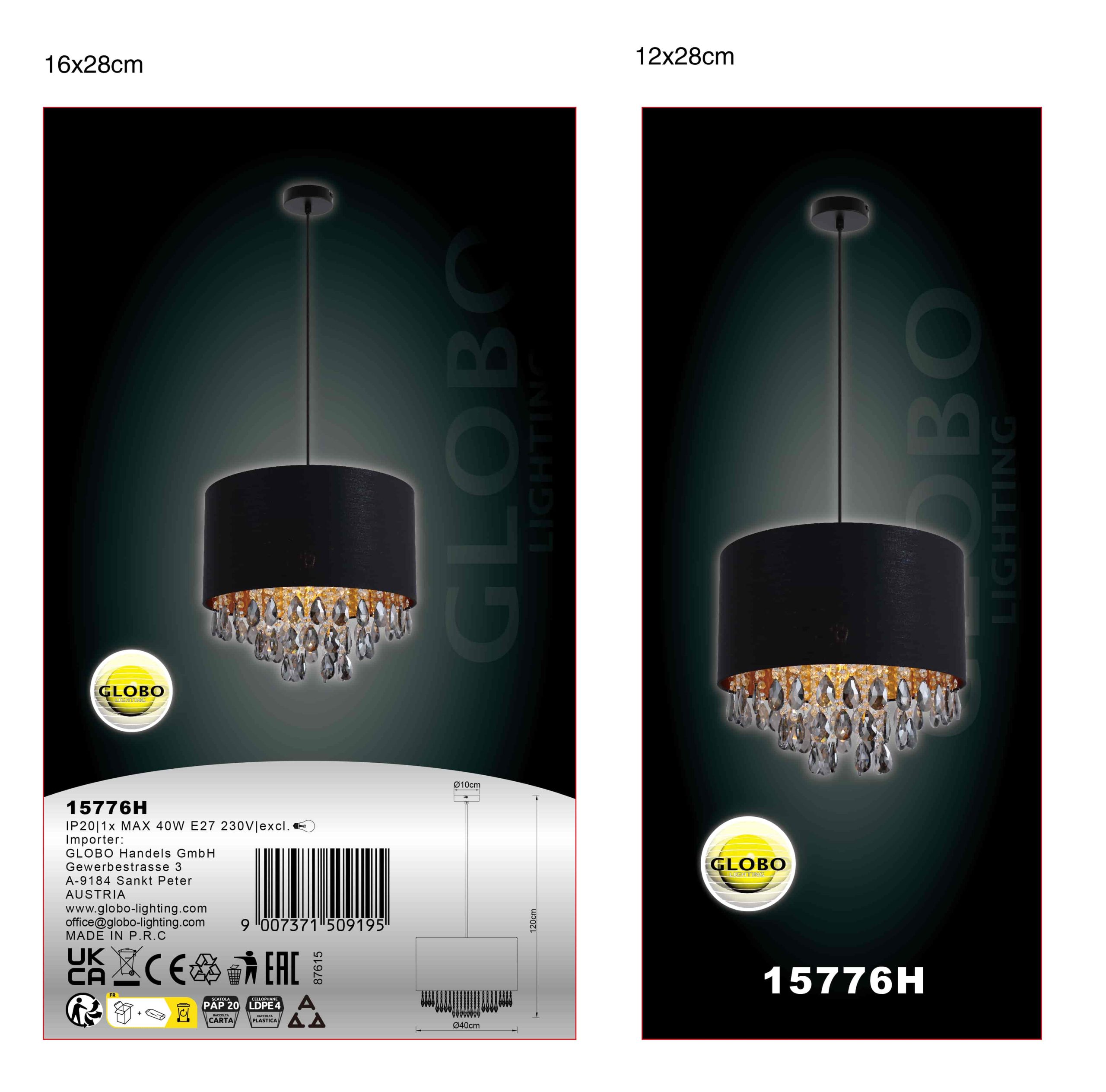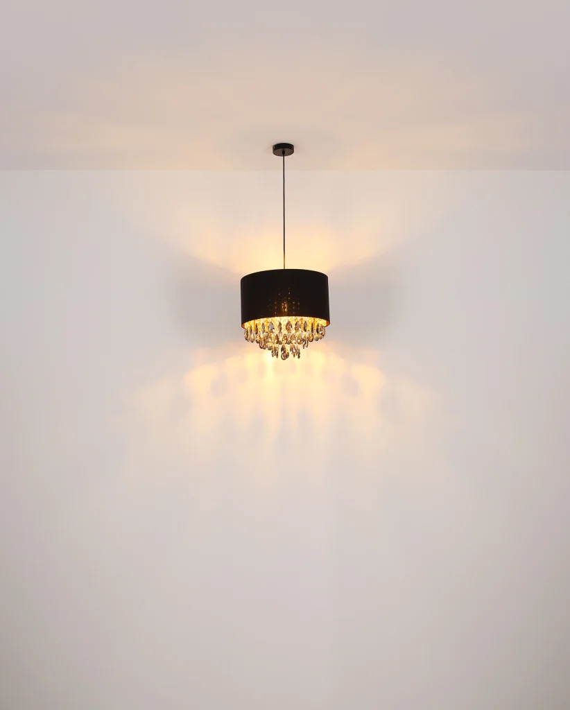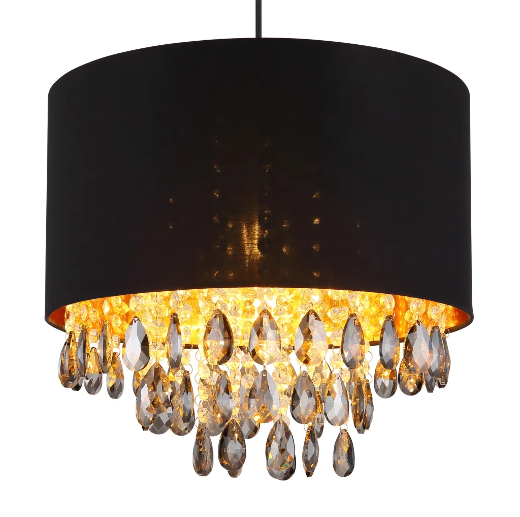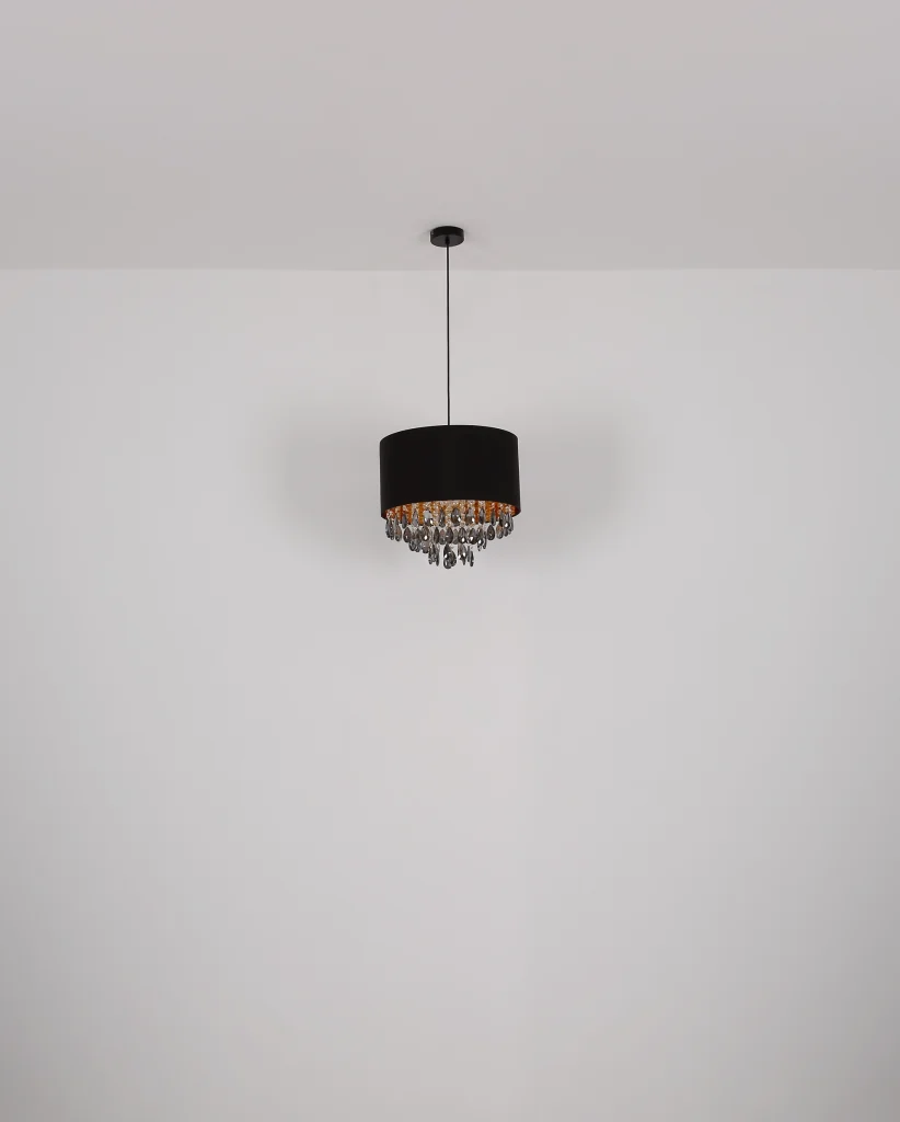 Viseća lampa COLETTA unosi dašak luksuza u vaše sobe. Crni tekstilni abažur i blistavi, providni kristali unutra postavljaju stilske akcente. Crno, mat kućište sa zlatnim akcentima upotpunjuje elegantan izgled. Pogodno za sijalicu E27 (ekskluzivno).