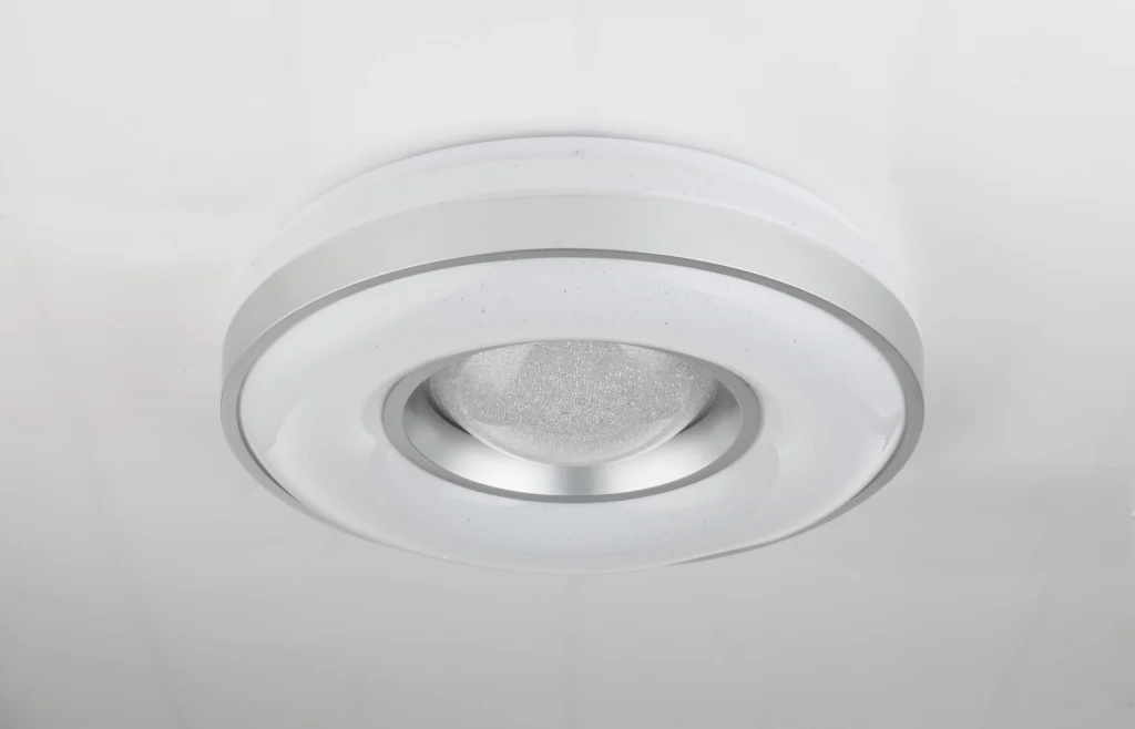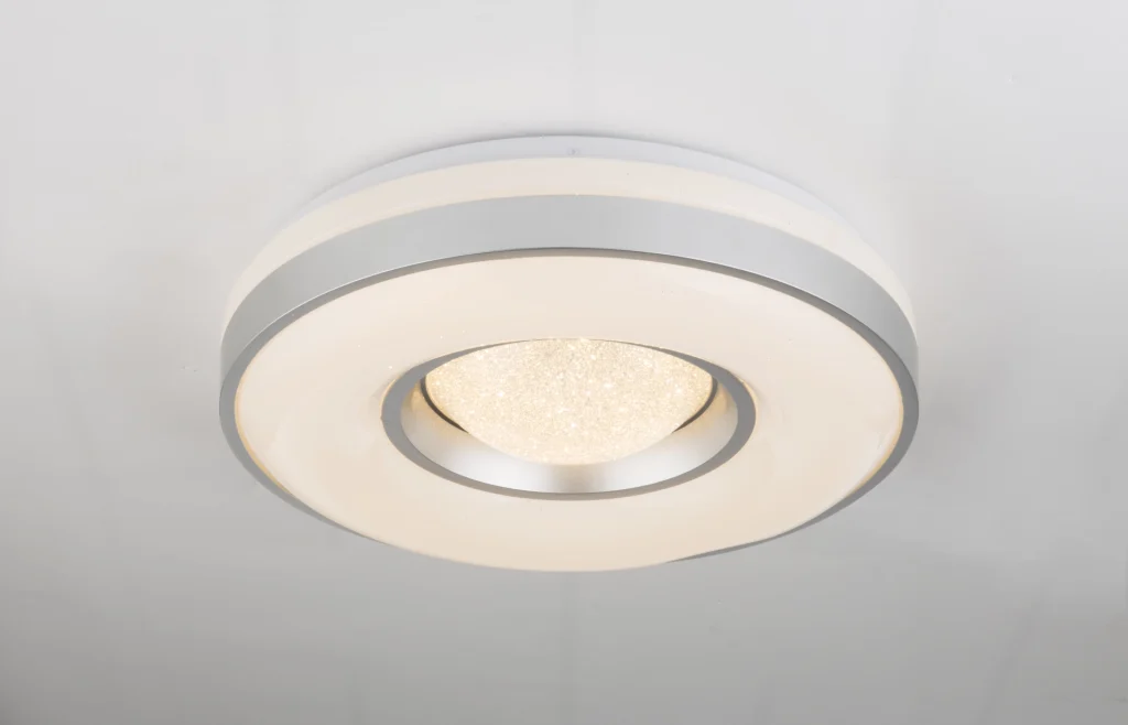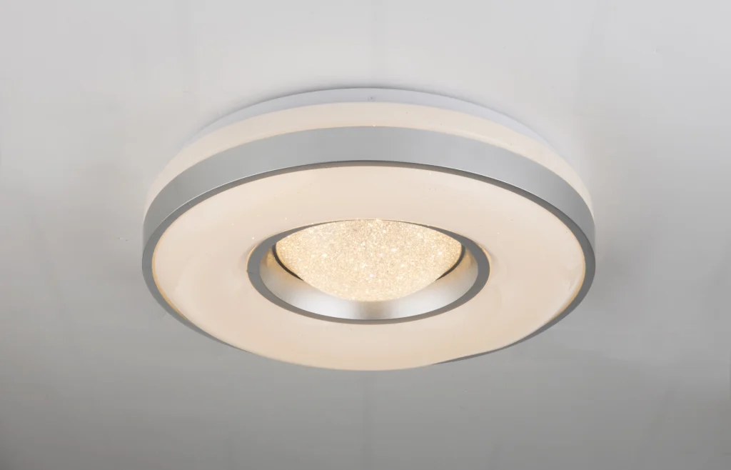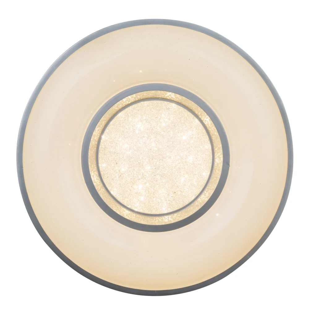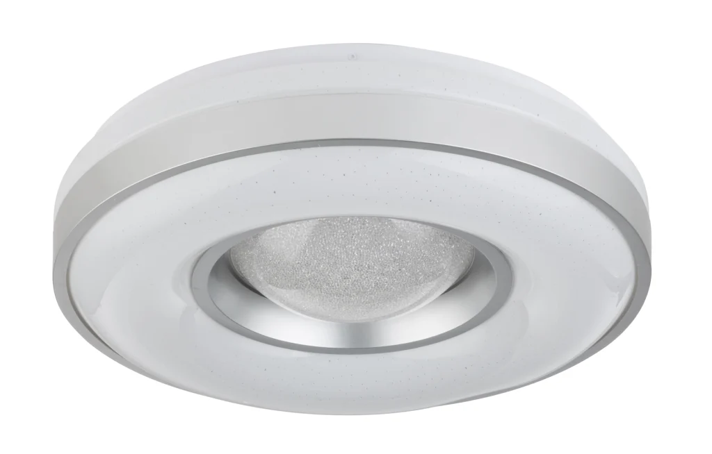 The Colla ceiling lamp follows the ubiquitous metal trend. The lamp made of opal acrylic glass is framed by a narrow, silver metal frame. The successful combination of solid metal and translucent acrylic glass makes the article particularly exciting. Due to the lowered middle section, the luminaire also gains a spatial effect. With a diameter of 41cm, the luminaire has a size that can be used in many places, which fits into smaller rooms, but does not look lost in larger ones. The integrated 24W LEDs emit brilliant warm white light with an intensity of 1000lm.