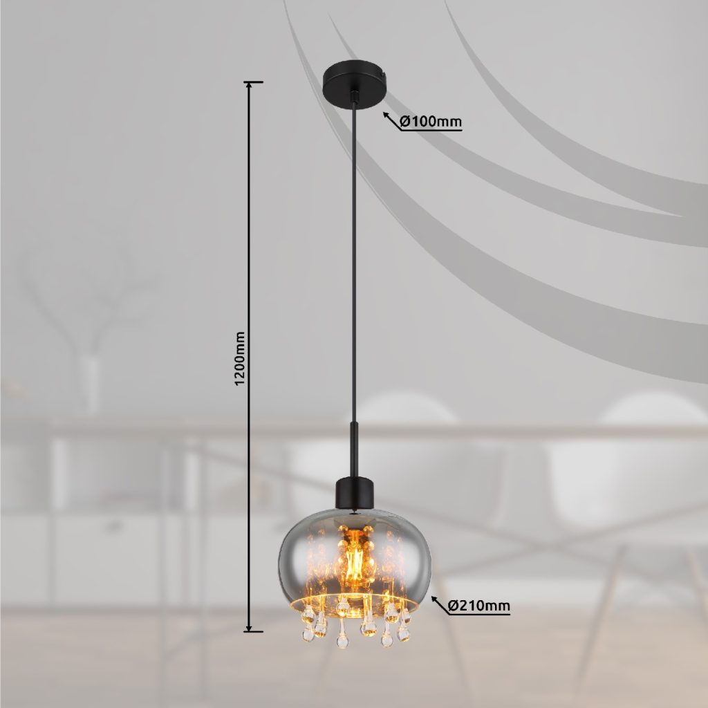 Ova prelepa visilica serije CORRY inspiriše prelepim dizajnom. Od okruglog plafonskog nosača vodi crni kabl dužine od 1.2 m do grla E27, koje je prekriveno staklenim abažurom u boji dima sa ukrasima od staklenih kristala (Ø 21 cm). Grlo E27 vam omogućava da da sami odredite boju svetla i jačinu do maksimalne snage od 6W. Zbog dugovečnosti i uštede energije preporučujemo vam LED sijalice.