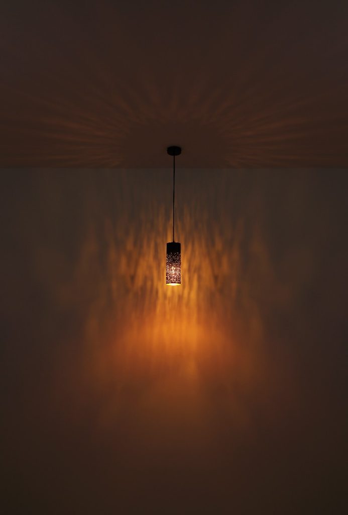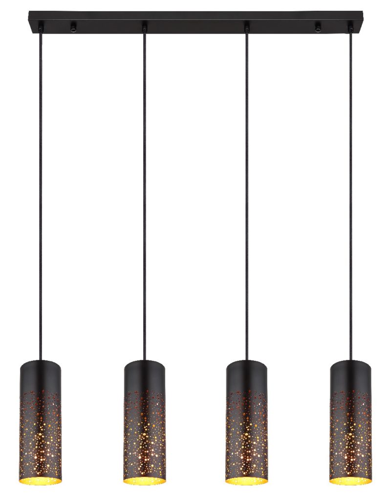 Ova visilica serije CROCKY izrađena je od crnog metala i cilindričnih stakala sa ukrasnim perforacijama (Ø 10). Četiri kabla dužine 1.5 m idu od plafonskog nosača dužine 80 cm, svaki sa grlom E27, koja su prekrivena oblikovanim abažurima. E27 grlo vam omogućava da sami odredite boju svetla i jačinu do maksimalne snage od 40W. Zbog dugovečnosti i uštede energije preporučujemo vam LED sijalice.
