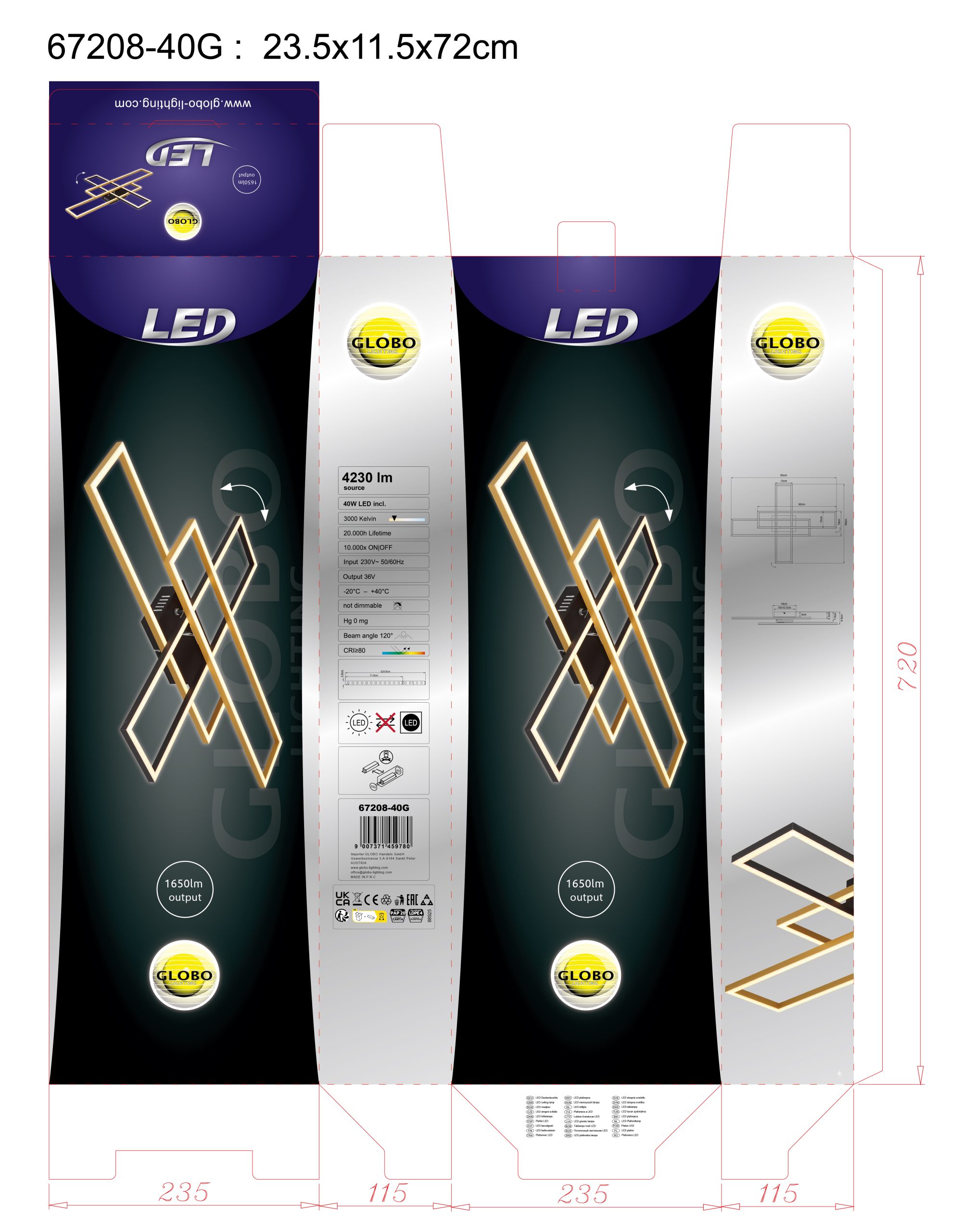 Moderna plafonska lampa napravljena od crnog mat metala, aluminijuma u crnoj i zlatnoj boji, kao i opal plastike, prava je atrakcija u svakoj prostoriji. Sa veličinom od 800x600x95 mm i pravougaonim dimenzijama od 13×60 cm, savršeno se uklapa u moderne koncepte življenja. Opremljena snažnim LED sijalicama, ova svetiljka pruža izvor svetlosti od 4230 lm i izlaz od 1650 lm sa toplo belom bojom svetlosti od 3000K. Energetski štedljivo LED osvetljenje od 40 W i 230 V obezbeđuje prijatnu osvetljenost i toplu atmosferu. Bilo da je u dnevnoj sobi, trpezariji ili hodniku – ova plafonska lampa postavlja stilske akcente i uverava svojim ekskluzivnim dizajnom. Naručite ovu visokokvalitetnu plafonsku lampu sada i uživajte u modernom konceptu osvetljenja za vaš dom.