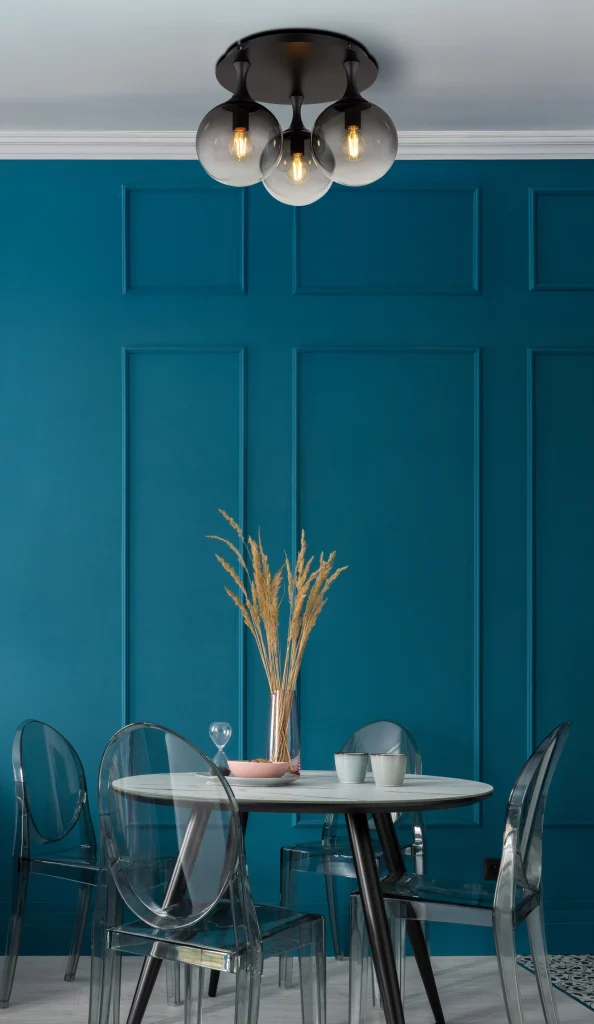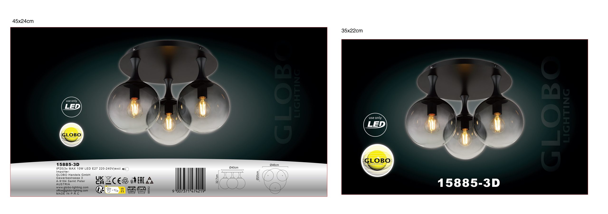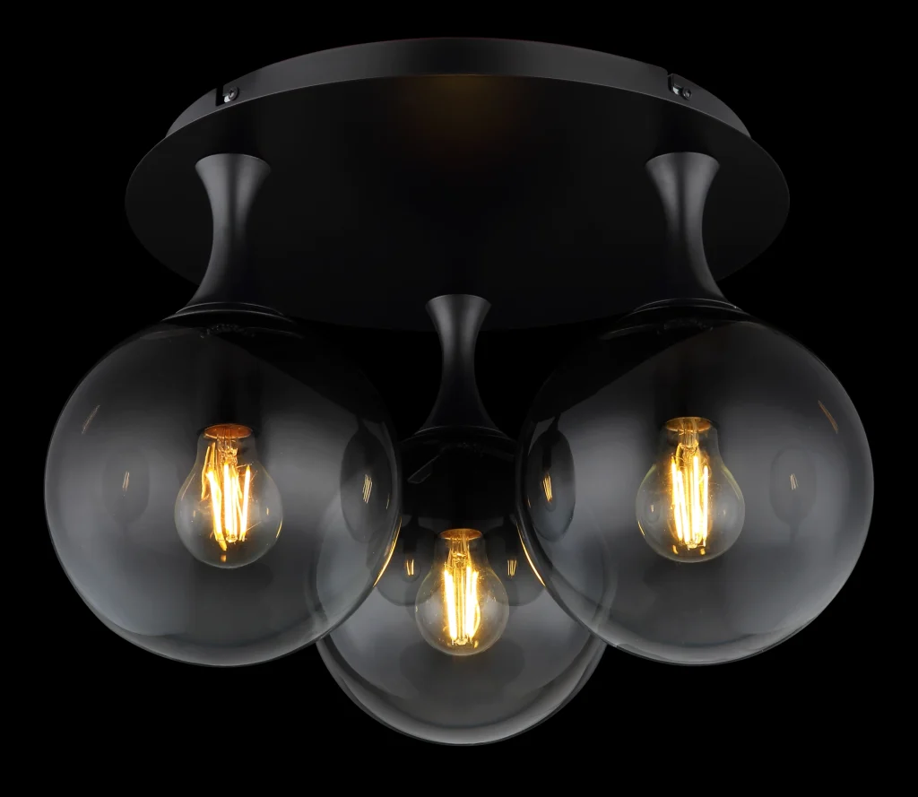 Plafonska lampa DALTON nudi okrugli dizajn sa tri elegantne staklene sfere u dimljenoj boji. Crno, mat metalno kućište i staklene kuglice stvaraju moderan i stilski ambijent. Pogodno za E27 LED sijalice (ekskluzivno).