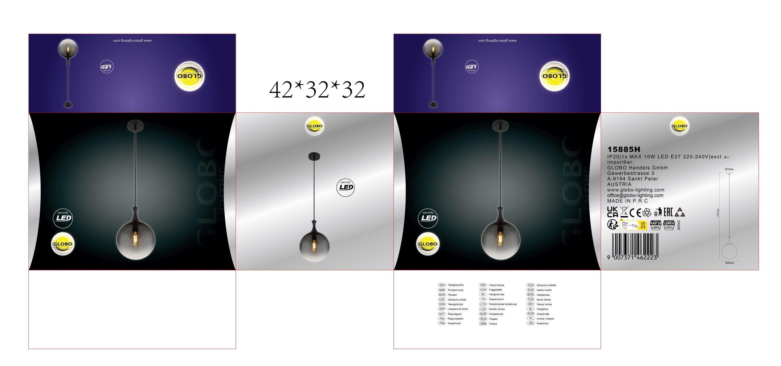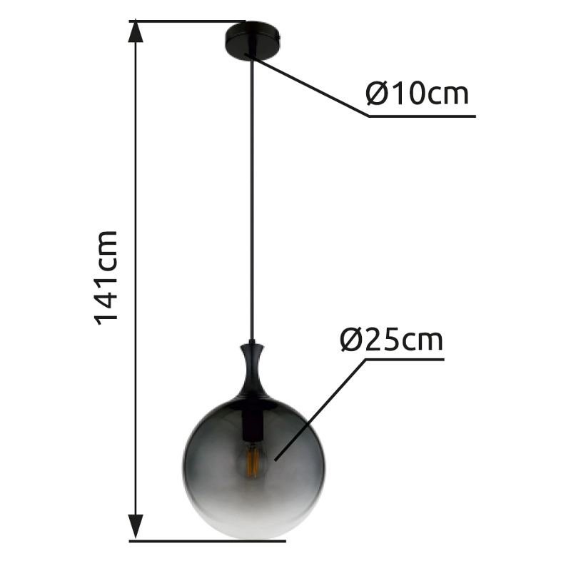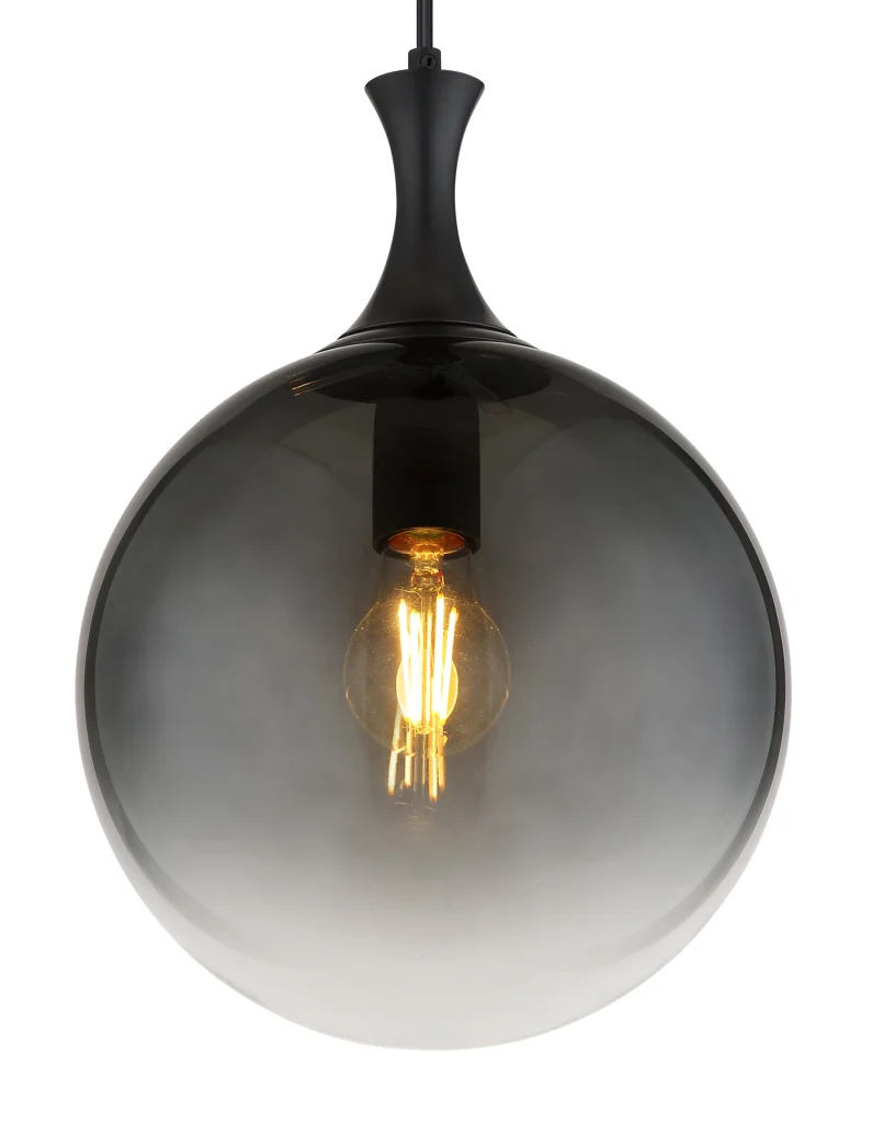 Viseća lampa DALTON sa elegantnom staklenom kuglom dimljenog izgleda i crnim, mat metalnim kućištem je stilski dodatak modernim sobama. Pogodna je za E27 LED sijalice (ekskluzivno).