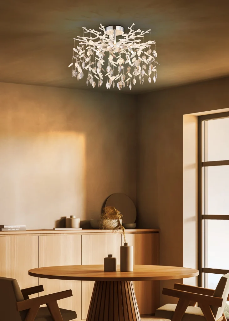 Okrugla plafonska svetiljka DANNA kombinuje klasični šarm sa elegantnom sofisticiranošću, što je čini zapanjujućim vrhuncem i u tradicionalnim i u modernim enterijerima. Visokokvalitetni hromirani metalni okvir uparen sa providnim plastičnim elementima daje svetiljci prefinjen, uglađen izgled. Prava atrakcija je raskošni kristalni dekor napravljen od dimljenih i providnih staklenih kristala, koji prelepo prelamaju svetlost i stvaraju blistave efekte po celoj prostoriji. Sa velikodušnim prečnikom od Ø 610 mm, DANNA je idealna za dnevne i trpezarijske boravke, ulazne hodnike ili spavaće sobe gde je poželjna stilska i luksuzna atmosfera. Dizajnirana za G9 sijalice, snaga lumena se može pojedinačno odabrati, što omogućava savršeno podešavanje željenog nivoa osvetljenosti. DANNA dodaje kristalnu eleganciju i bezvremensku prefinjenost svakom domu, kupajući sobu sofisticiranim sjajem.
