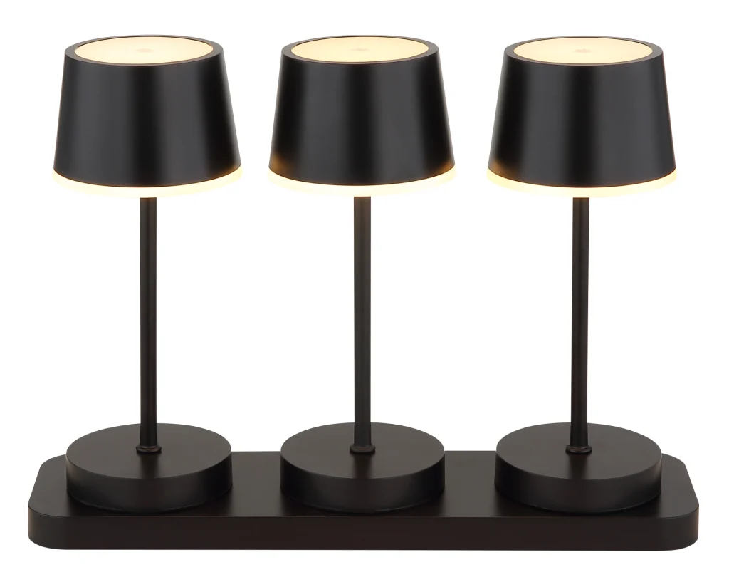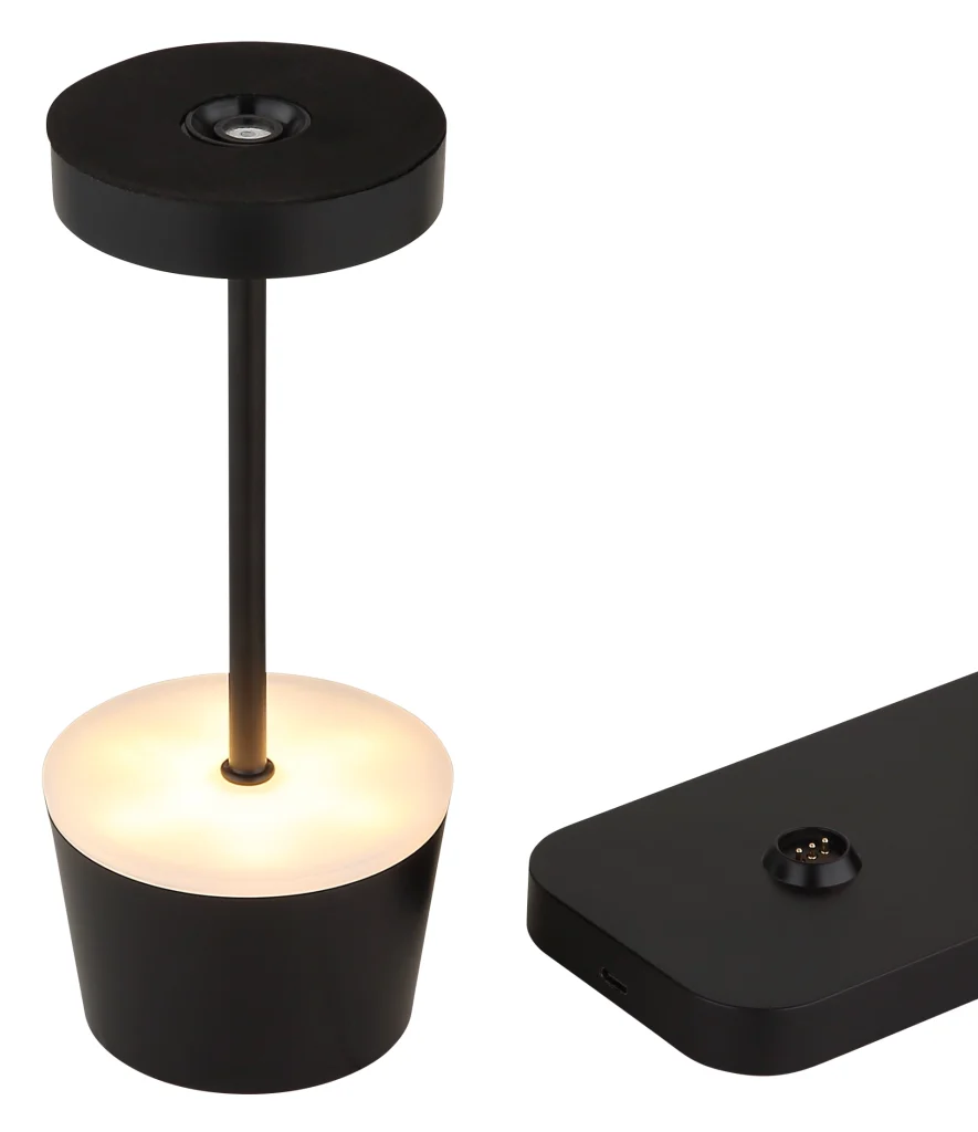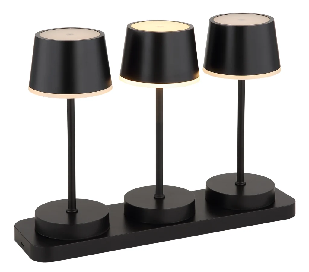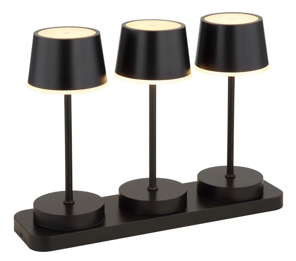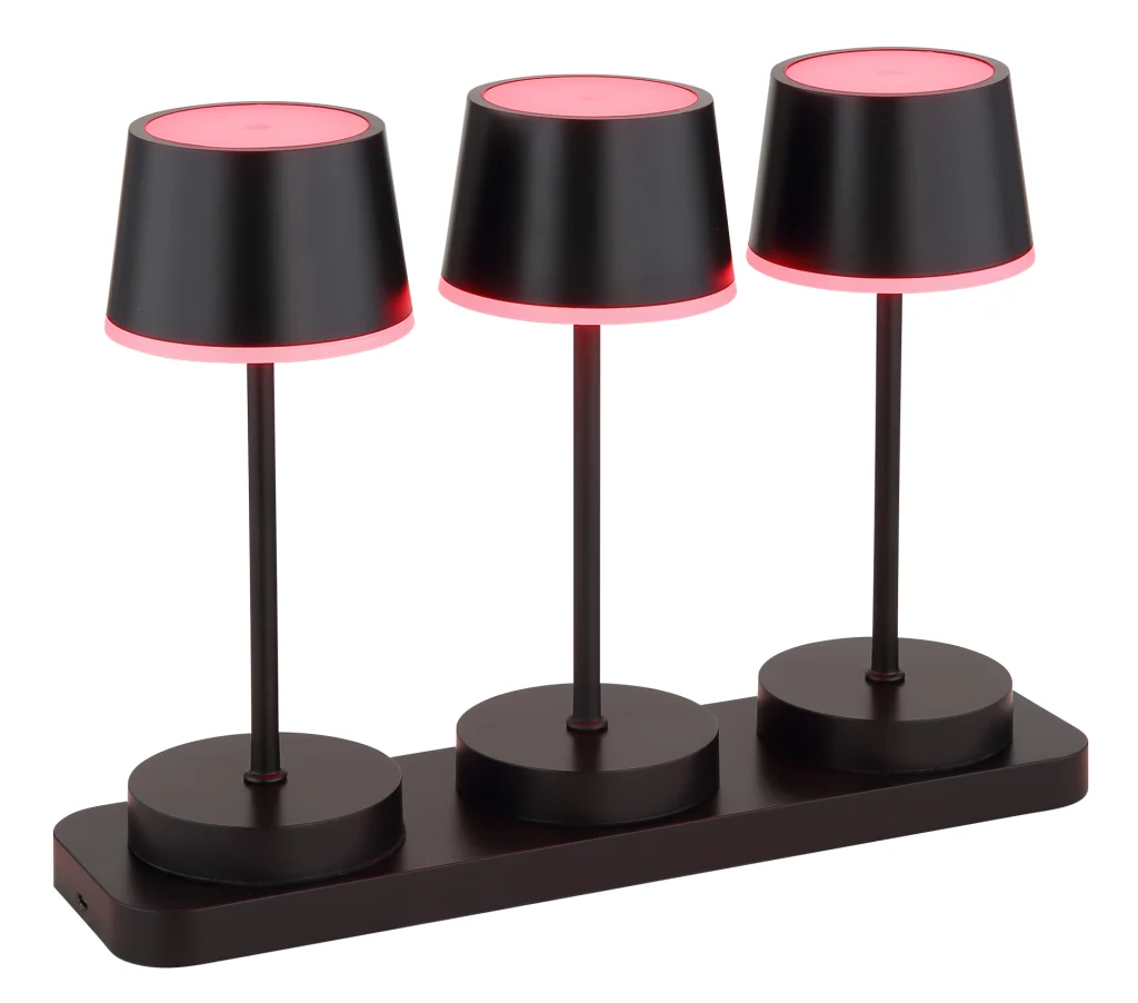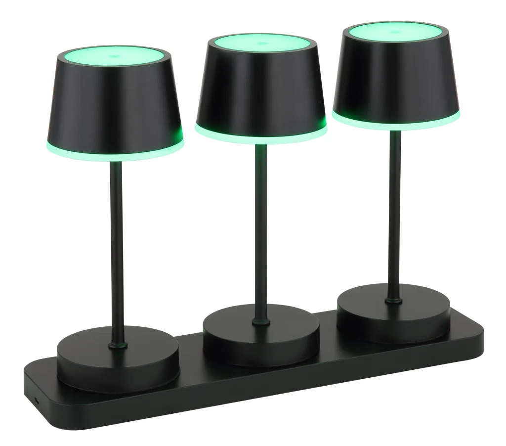 Komplet stonih lampi DAWSON od 3 dela impresionira modernim dizajnom, inovativnom tehnologijom i praktičnom doking stanicom za istovremeno punjenje sve tri lampe. Okrugle lampe imaju mat crno metalno kućište sa crnim i opalnim plastičnim abažurima, kombinujući stilski izgled sa visokom funkcionalnošću. Svaka lampa isporučuje 210 lumena i može se bezstepeno prigušiti pomoću dodirnog dimera, što vam omogućava da kreirate personalizovane raspoloženja osvetljenja u kratkom roku. Ugrađena RGB promena boja nudi različite boje svetlosti koje se mogu fiksirati po želji. Funkcija memorije pamti vaše poslednje podešavanje. Kontrola je jednostavna putem daljinskog upravljača ili direktno pomoću dodirnog uključivanja/isključivanja. Sa IP54 zaštitom, lampe su pogodne i za zaštićenu upotrebu na otvorenom. Uključeni su praktična doking stanica za sve tri lampe, adapter i USB kablovi za punjenje. Ugrađena RGBW LED dioda pruža žive boje i prijatno belo svetlo. DAWSON je savršen izbor za moderan dizajn osvetljenja – u zatvorenom ili na otvorenom.