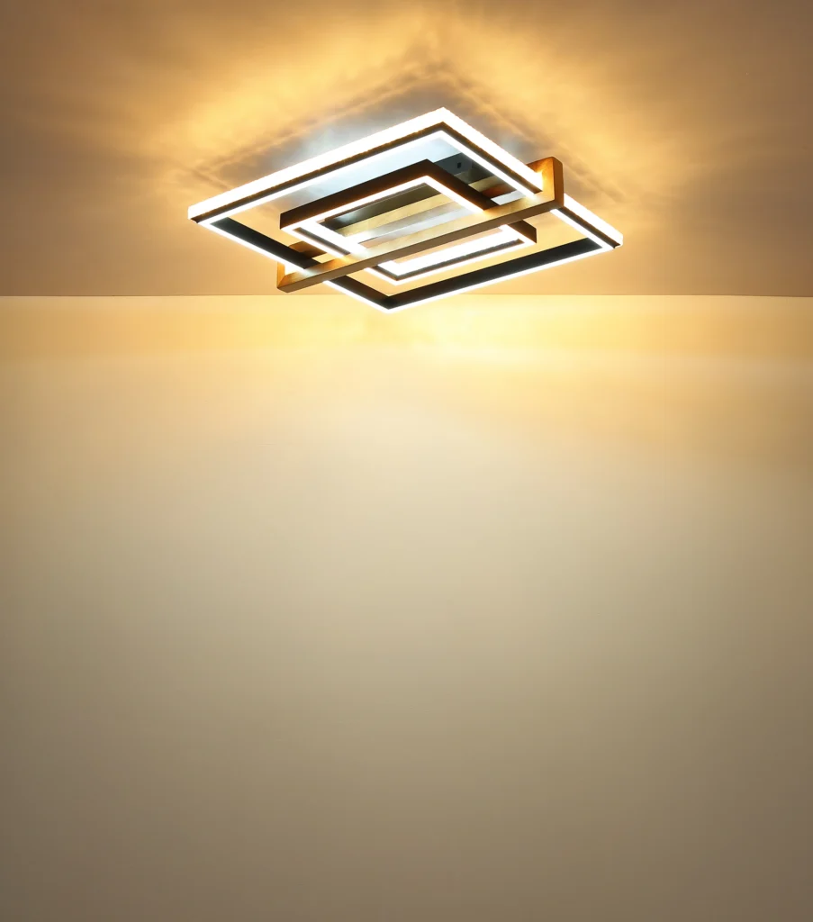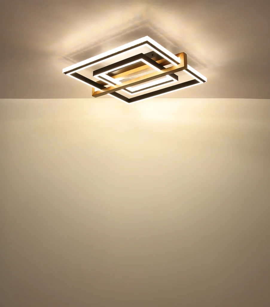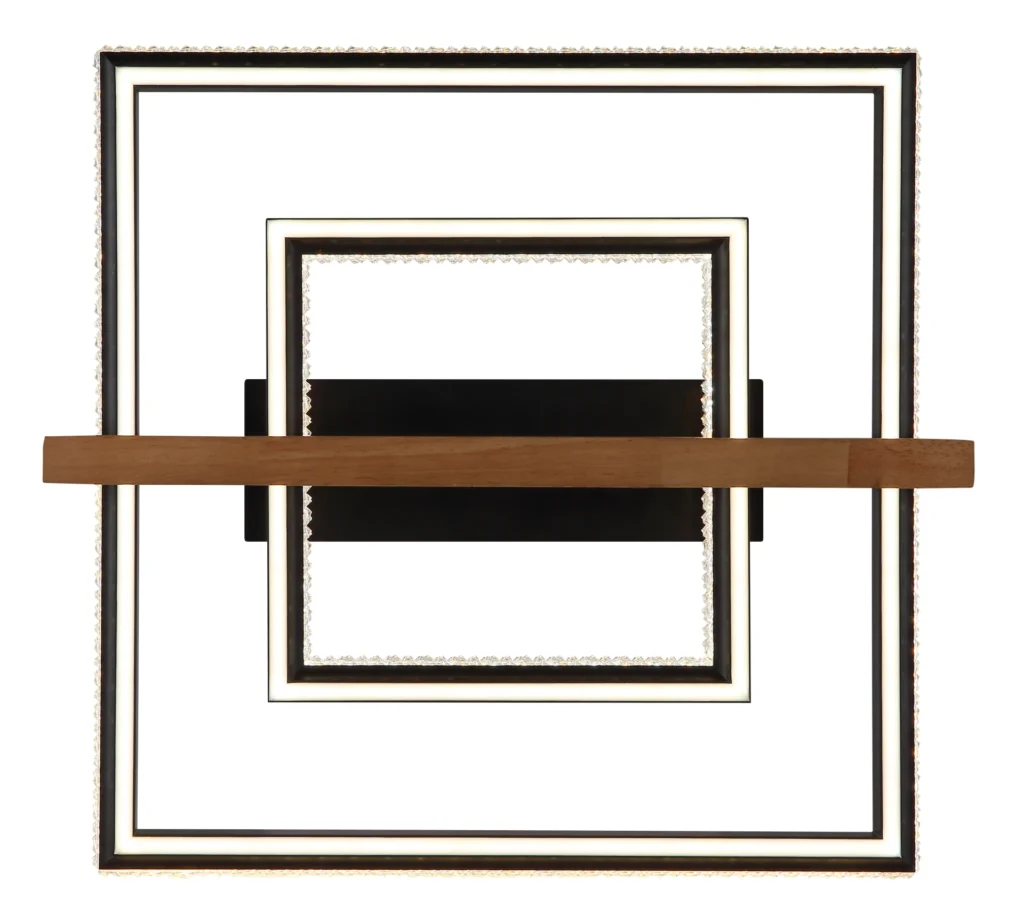 Pravougaona plafonska lampa DELORIS kombinuje moderan dizajn sa prirodnim materijalima i luksuznim kristalnim dekorom. Mat crno metalno kućište se savršeno usklađuje sa tamnosmeđim drvetom, dajući svetlu toplinu i eleganciju. Kvadratni abažur od mat aluminijuma i providnih i opal plastičnih kristala obezbeđuje stilski izgled i prijatnu difuziju svetlosti. Sa svetlosnim izlazom od 1700 lumena, DELORIS nudi svetlo, ali udobno osvetljenje. Temperatura boje se može kontinuirano podesiti od 2700 K do 6500 K i može se pojedinačno podesiti. Svetlo se može prigušiti i ima praktičnu funkciju memorije koja čuva poslednje izabrano raspoloženje osvetljenja. Pored toga, integrisano noćno svetlo pruža meko osvetljenje u mraku. Daljinski upravljač omogućava praktično upravljanje sa daljine. DELORIS je savršena kombinacija dizajna, funkcionalnosti i prijatne atmosfere.
