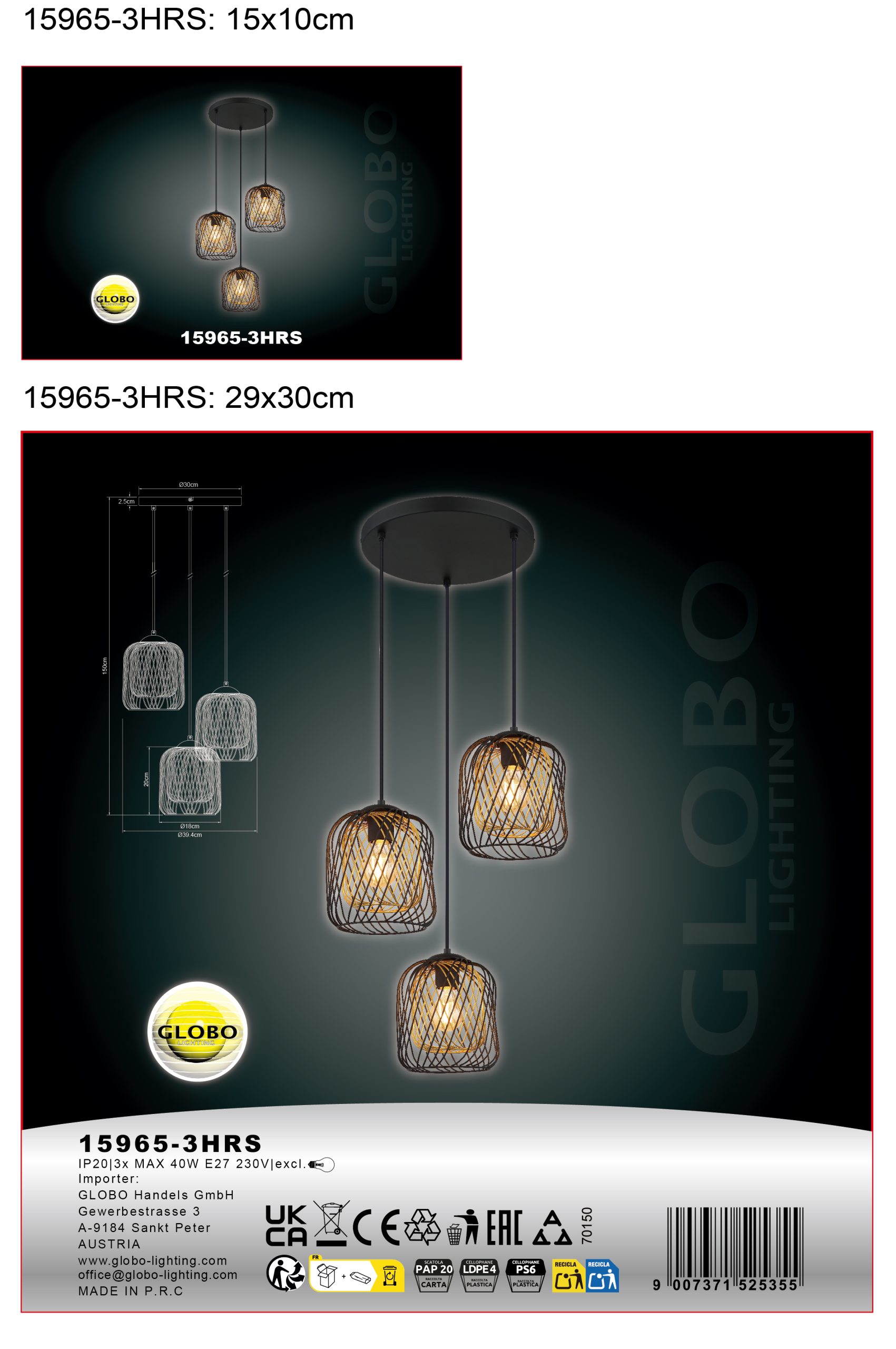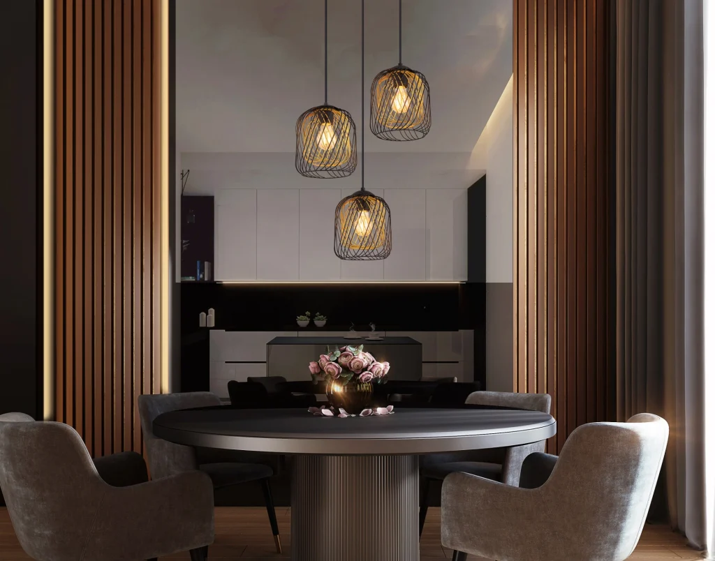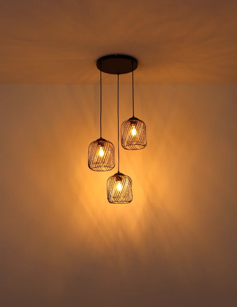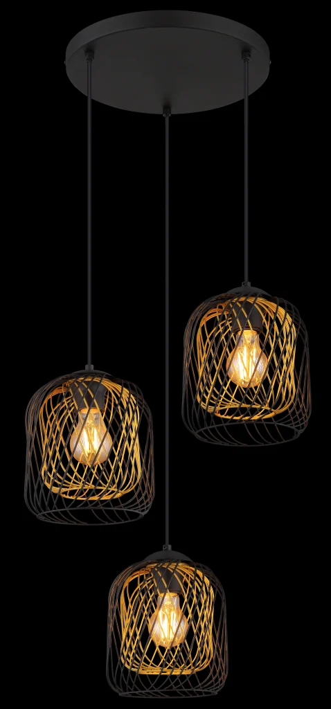 Viseća lampa DICHTI impresionira svojim jedinstvenim dizajnom koji se sastoji od tri lukovičasta metalna abažura od mreže, od kojih svaki sadrži unutrašnji abažur. Lampa kombinuje vintage šarm sa modernim akcentima i savršeno se uklapa u različite stilove enterijera. Telo lampe je napravljeno od visokokvalitetnog, mat crnog metala, dok su abažuri napravljeni od elegantne metalne mreže koja sija u crnom ili zlatnom mat izgledu. Sa prečnikom od 394 mm, lampa pruža ravnomerno i atmosfersko osvetljenje. Viseća lampa je idealna za dnevnu sobu, trpezariju ili iznad trpezarijskog stola i stvara toplu atmosferu. Lampa se isporučuje bez sijalice E27, tako da možete individualno odabrati pravo svetlo. Stilan, funkcionalan dodatak vašem domu.