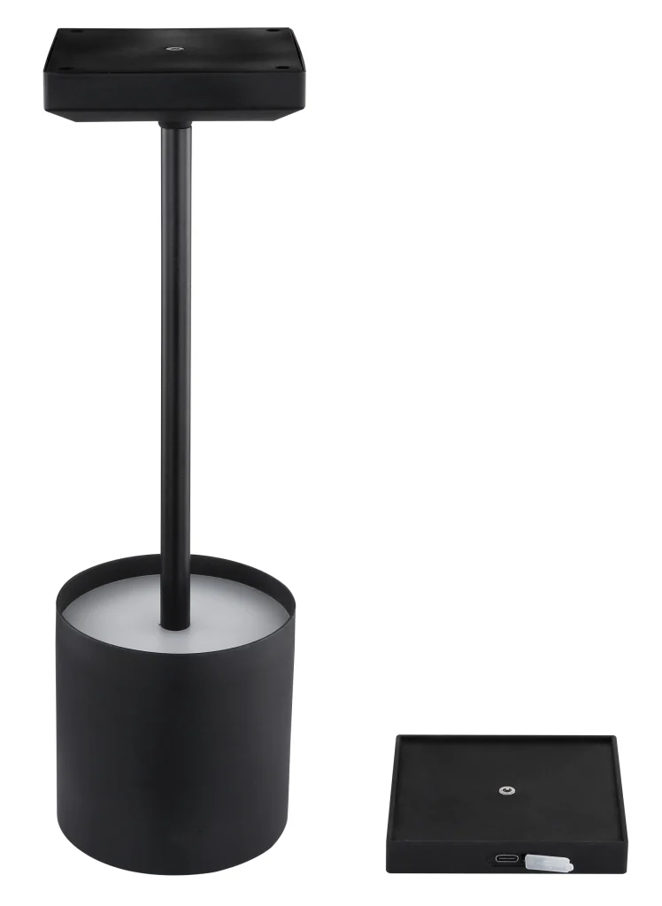 Moderna stona lampa DIXON kombinuje kompaktan dizajn sa promišljenom funkcionalnošću. Njen okrugli abažur napravljan je od mat plastike crne boje sa opalnim dufuzorom pruža meko svetlo bez odsjaja i svara prijatnu atmosferu. Kvadratna osnova opremljena je praktičnom doking stanicom, što omogućava praktično punjenje lampe. telo, napravljano od mat plastike crne boje i metala, deluje moderno i bezvremenski. Sa kompaktnim dimenzijama D:97mm x W:97mm, lampa se lako uklapa na noćne stočiće , stolove ili police, stilski se uklapajući u različite enerijere. Kontinuirani dodirni regulator jačine osvetljenja omogićava individualno podešavanje jačine svetla – od nežnog ambijentalnog do punog svetlosnog izlaza od 30 lumena na prijatnih 2900K. Uključeno u isporuku: adapter, USB kabl za punjenje i USB kabl. Zahvaljujući integrisanoj LED tehnologiji, stona lampa DIXON impresionira izdržljivošću i energetskom efikasnošću.