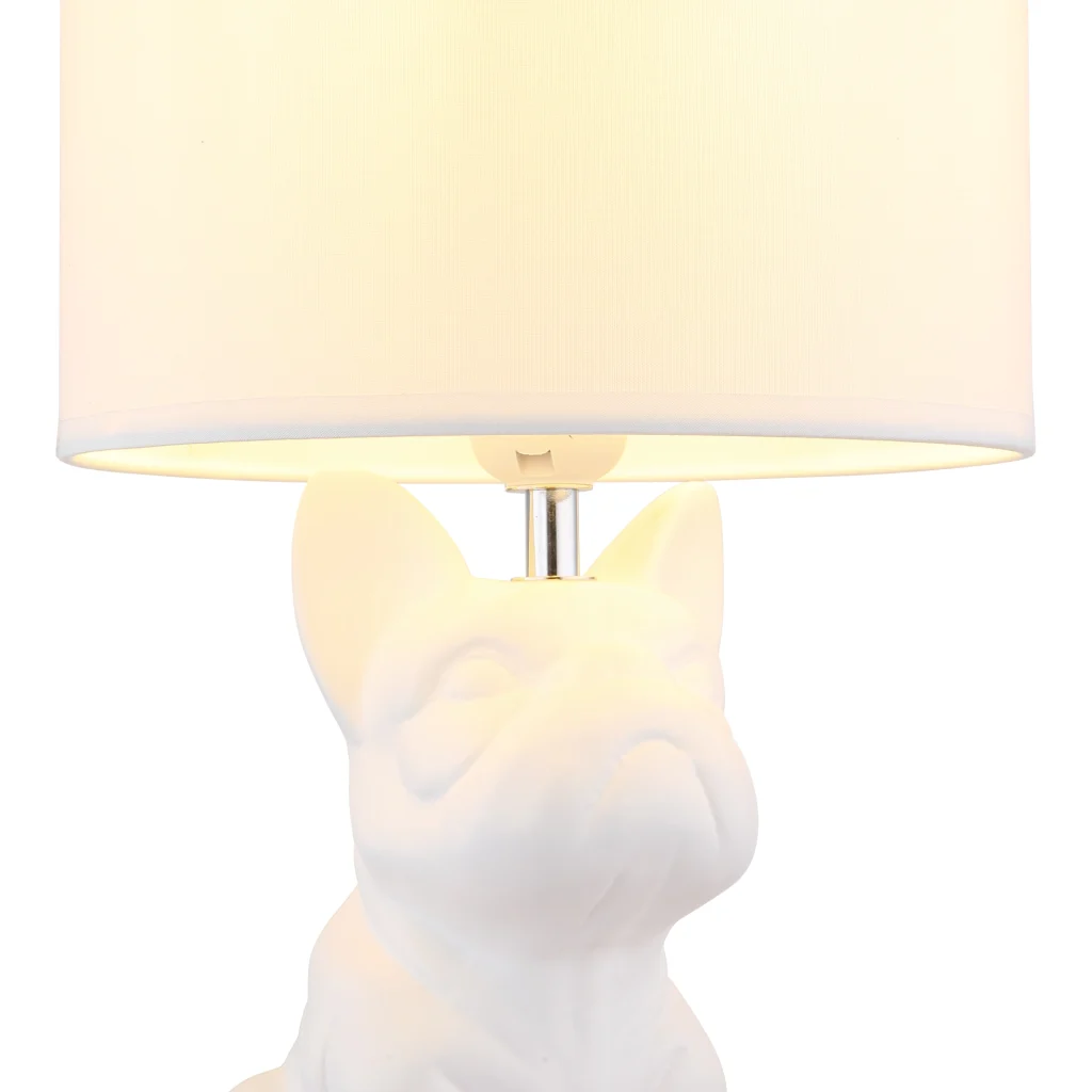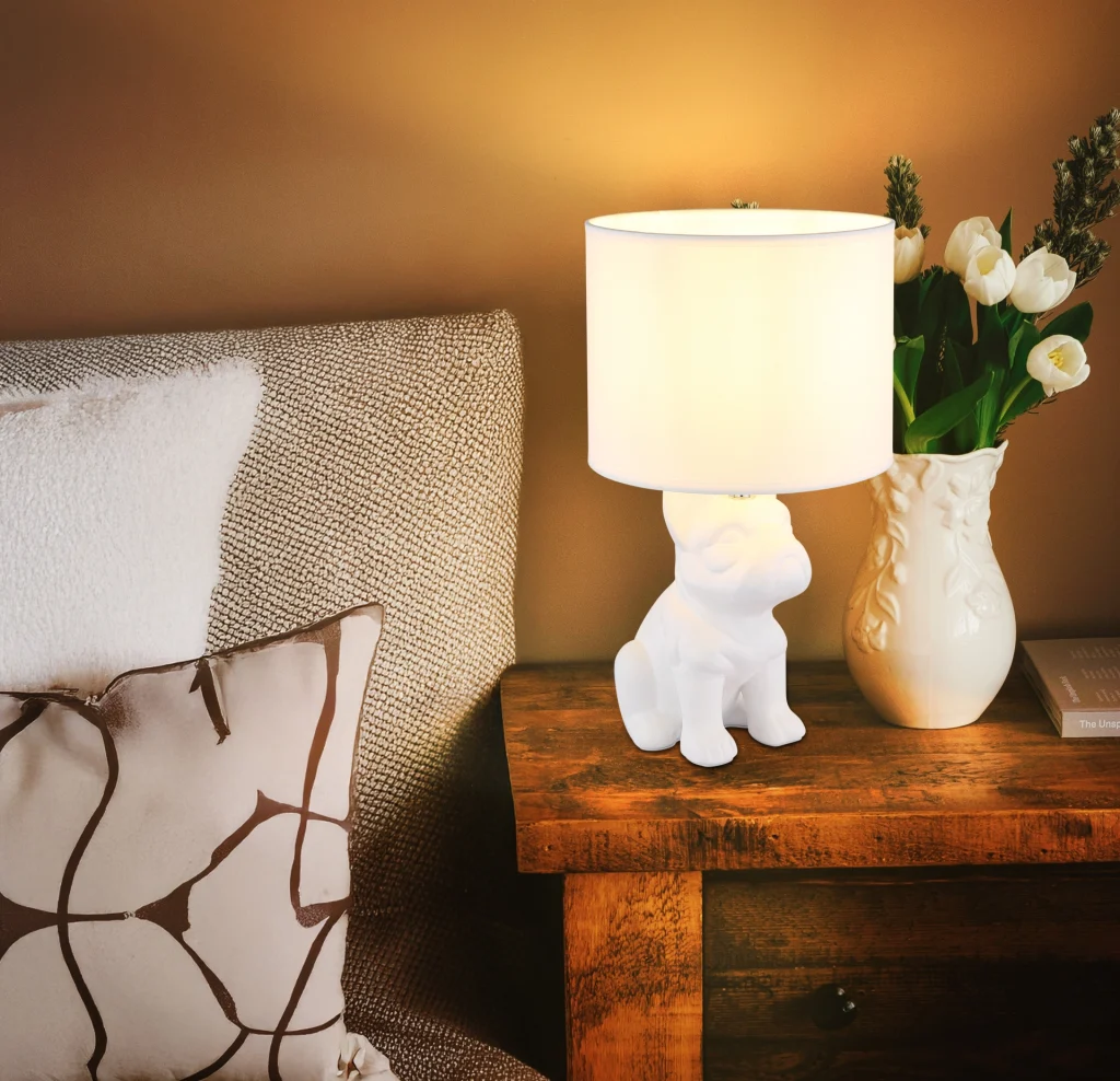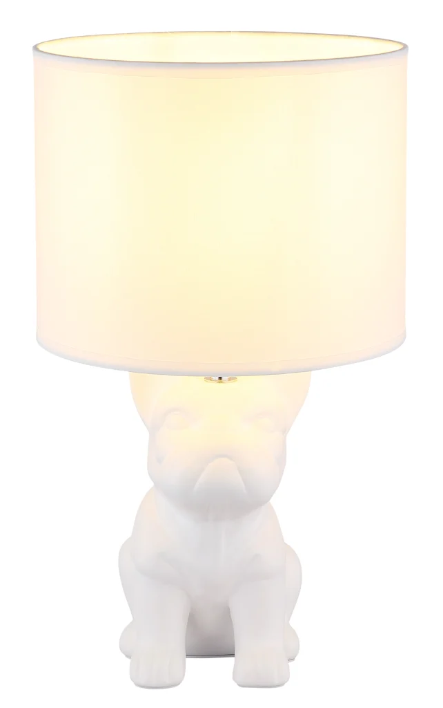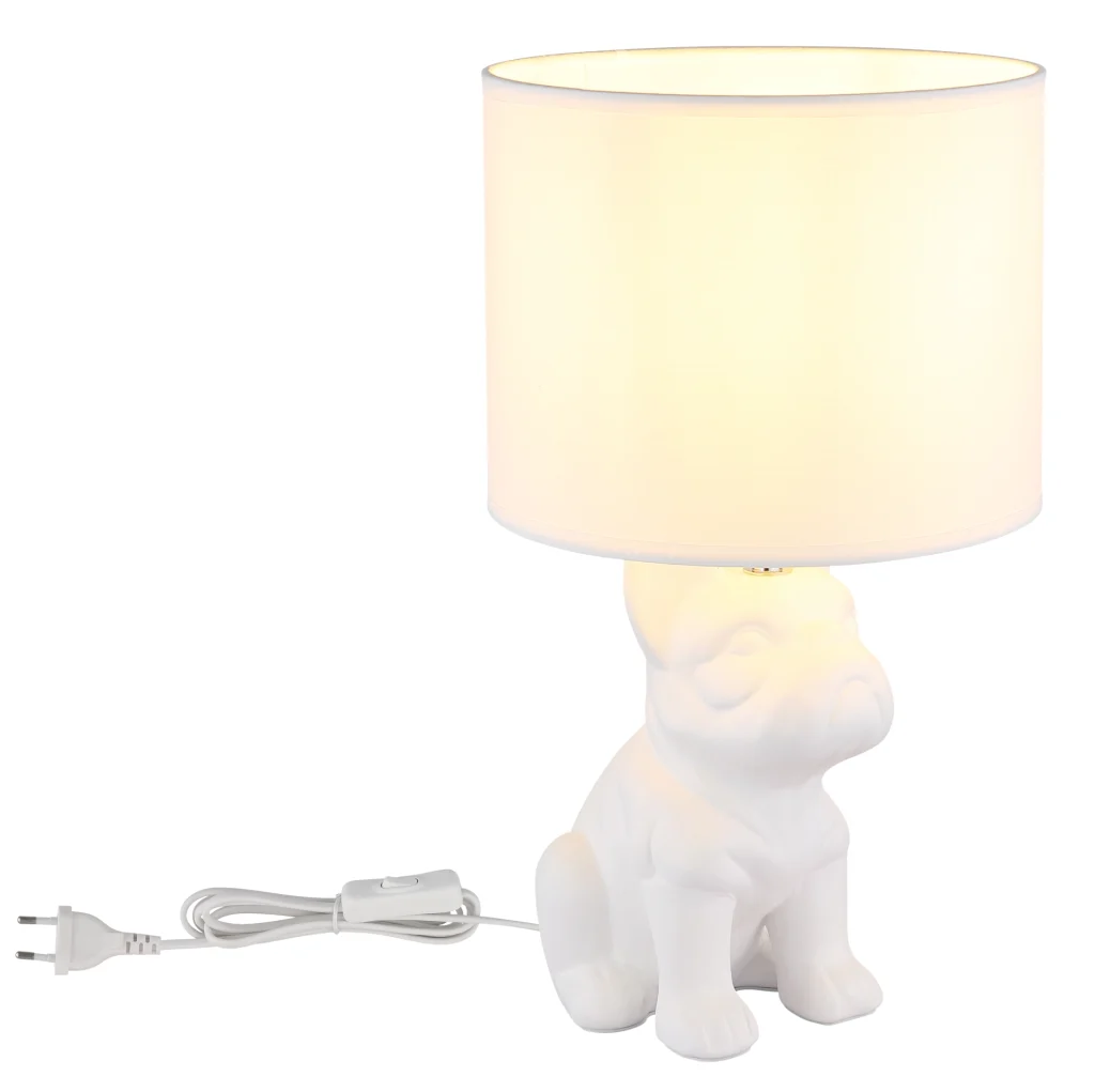 Stona lampa DOGO kombinuje životinjski šarm sa stilskom elegancijom. Centralna tačka je telo, oblikovano kao sedeći francuski buldog, napravljeno od mat bele keramike, koje je s ljubavlju dizajnirano i služi kao atrakcija u svakoj prostoriji. Okrugli abažur od tkanine u usklađenoj beloj boji stvara meku, prijatnu atmosferu osvetljenja i harmonično se uklapa sa širokim spektrom stilova uređenja enterijera. Bilo da je u pitanju noćna lampa u spavaćoj sobi, dekorativni element u dnevnoj sobi ili prijatan akcenat osvetljenja u hodniku – DOGO stvara ugodnu atmosferu svuda. Lampa se lako koristi pomoću prekidača na kablu. Stona lampa je kompatibilna sa sijalicom E27 (nije uključena), što vam omogućava da individualno podesite boju svetlosti i osvetljenost. Sa DOGO, ne samo da unosite funkcionalno osvetljenje u svoj dom, već i šarmantan kućni dodatak.