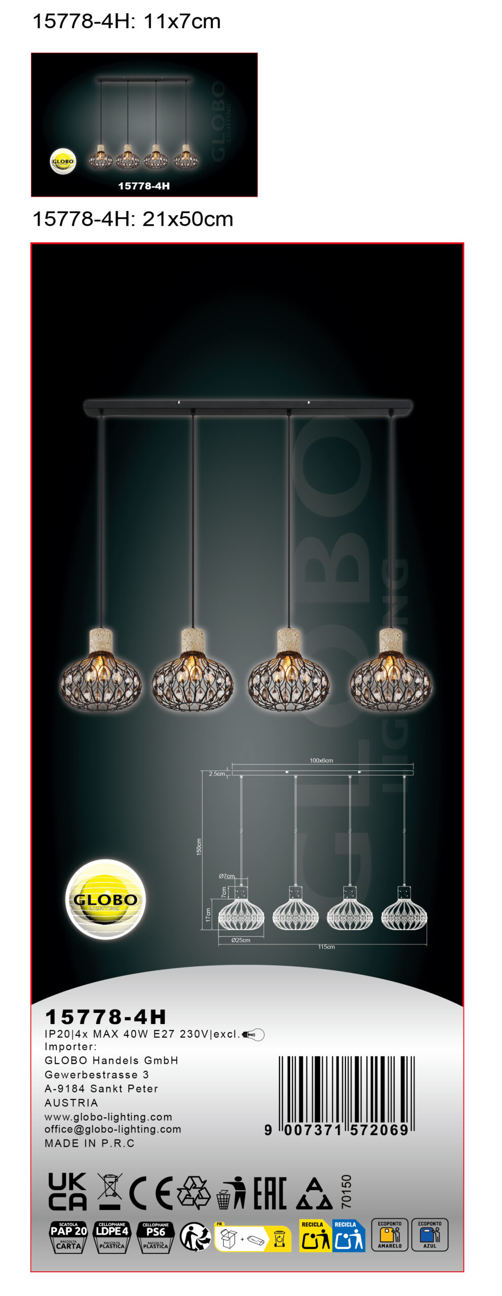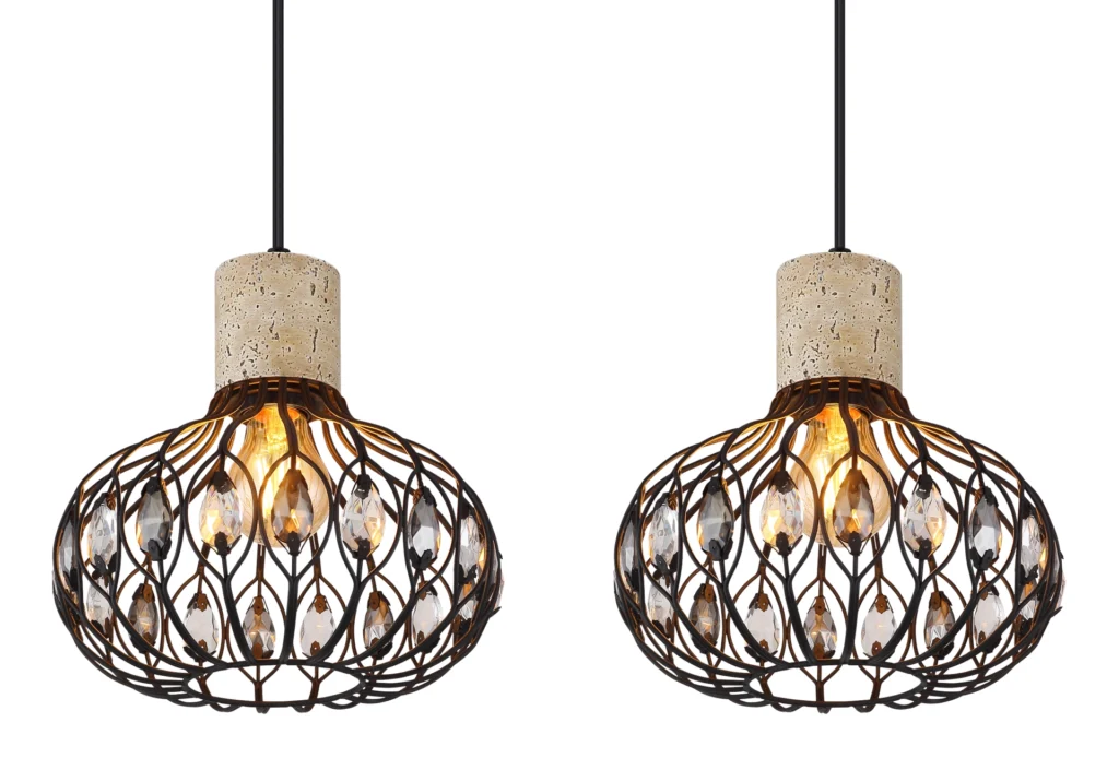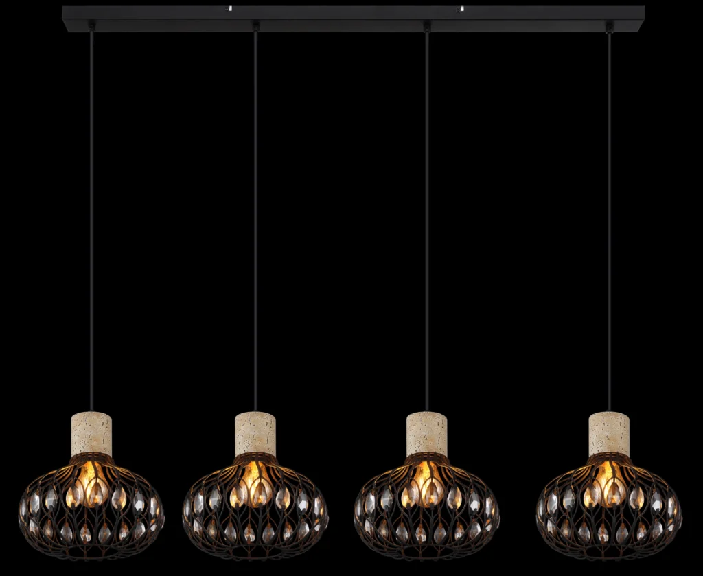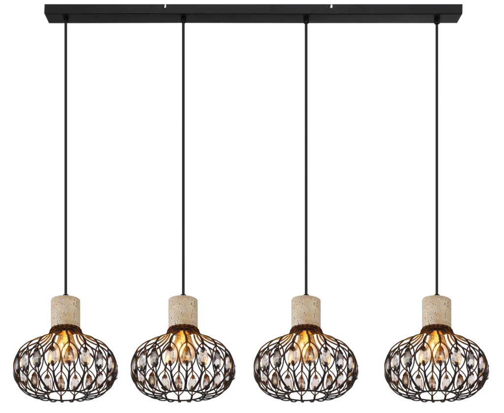 Viseća lampa DORTHY impresionira svojim elegantnim vintage dizajnom i visokokvalitetnom izradom. Četiri okrugla kišobrana su skladno raspoređena na ravnoj metalnoj šini u mat crnoj boji, impresionirajući svojim jasnim dizajnom i elegantnim detaljima. Telo je stilski upotpunjeno elementima napravljenim od sivog travertina – mešavine materijala koja lampi daje poseban karakter. Abažuri napravljeni od crnog, mat metala ukrašeni su visokokvalitetnim K5 kristalima u dimljenim i bistrim bojama, koji pružaju blistave svetlosne akcente i prijatnu atmosferu. Opremljena sa četiri E27 grla (bez sijalica), DORTHY nudi fleksibilnost u izboru izvora svetlosti – bilo da je to toplo svetlo za prijatne sate ili jarko svetlo za rad. Idealna za trpezariju, kuhinju ili izdužene dnevne sobe, ova lampa postavlja stilske akcente. DORTHY kombinuje klasičan, vintage šarm sa modernim materijalima – pravi vrhunac za vaš dom.