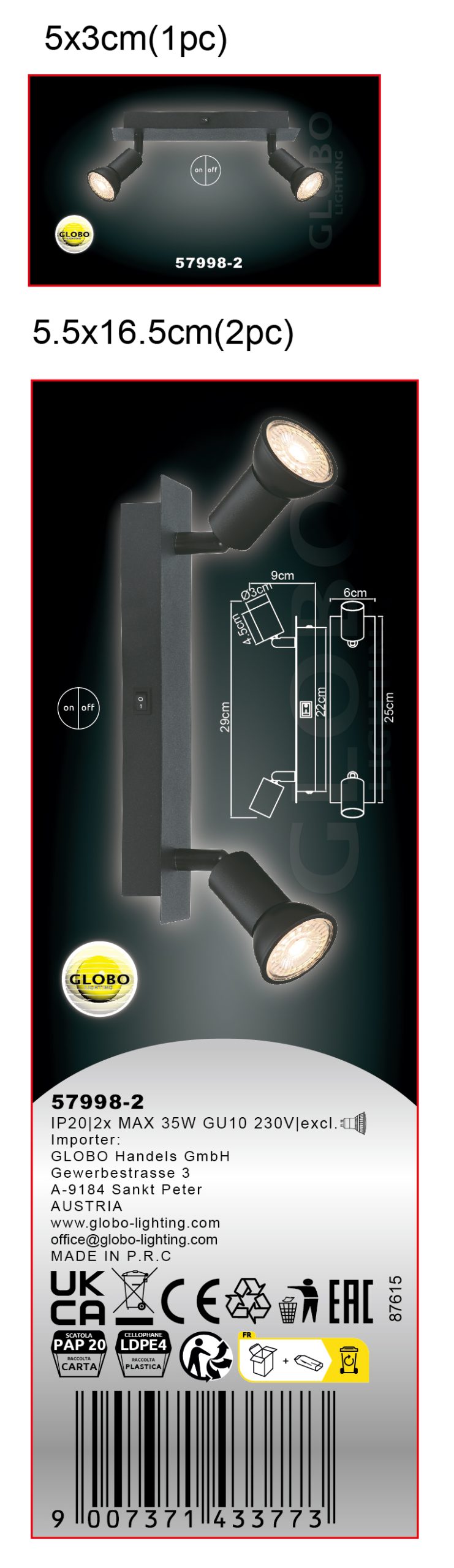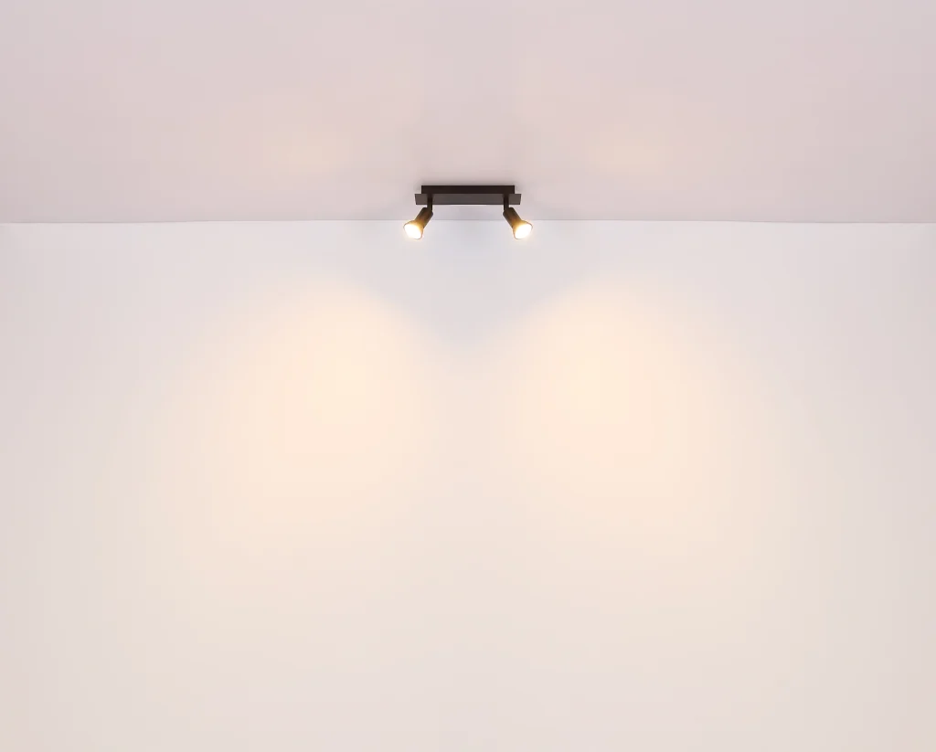 Ovaj jednostavni plafonski reflektor iz serije Dru impresionira svojim plemenitim dizajnom. Okretni reflektor napravljen od metala u crnoj boji opremljen je sa dva GU10 grla i ima dužinu od 25 cm. Slobodnim izborom izvora svetlosti možete odrediti sopstvenu boju i jačinu svetlosti do maksimalne snage od 35 vati. Zbog njihove uštede energije i dugotrajnosti, preporučujemo LED lampe.