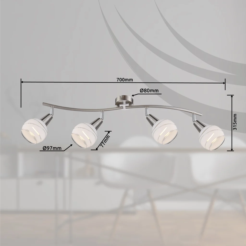 Ova prelepa lampa impresionira diskretnim, elegantnim dizajnom. Staklo je satenirano i ispresecano linijama providnog stakla. Topla bela svetlost obezbeđuje prijatnu atmosferu u prostoriji. 4 LED sijalice, koje ćete naravno dobiti uključene, takođe su veoma štedljive. Unesite dašak svežeg vazduha u svoj dom pomoću ove svetiljke.