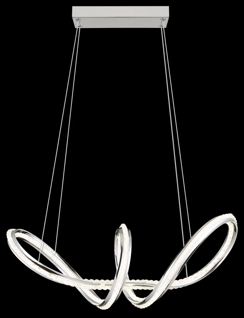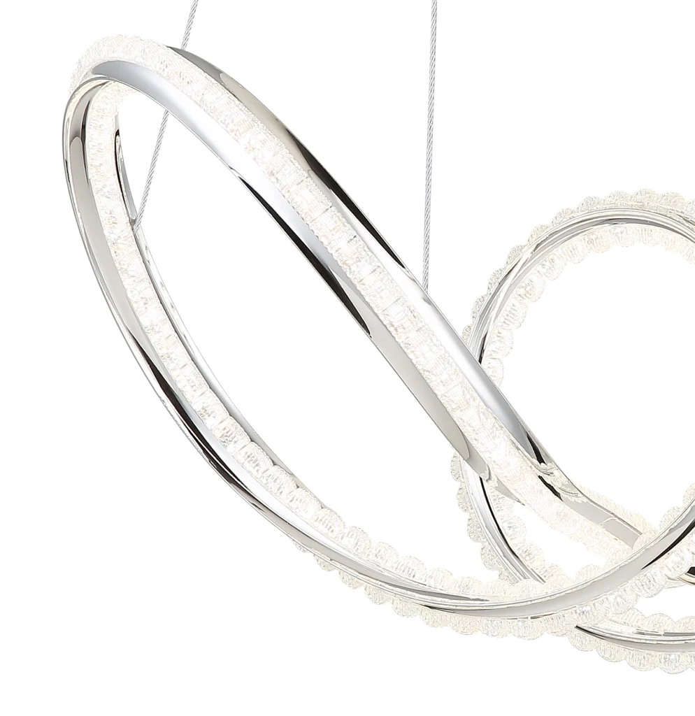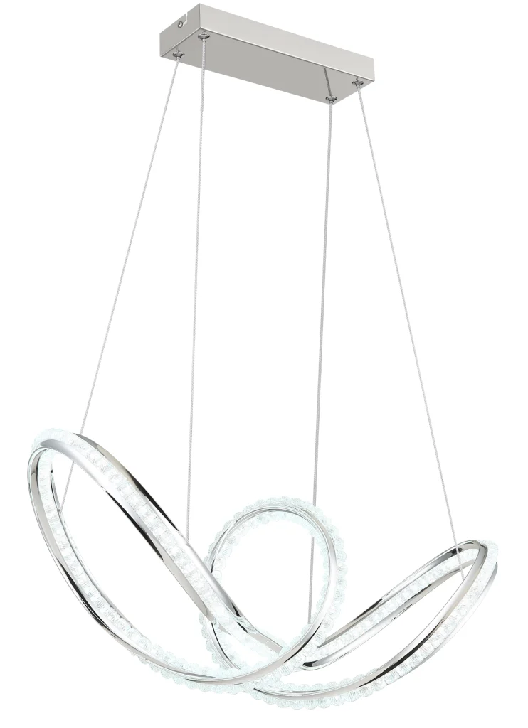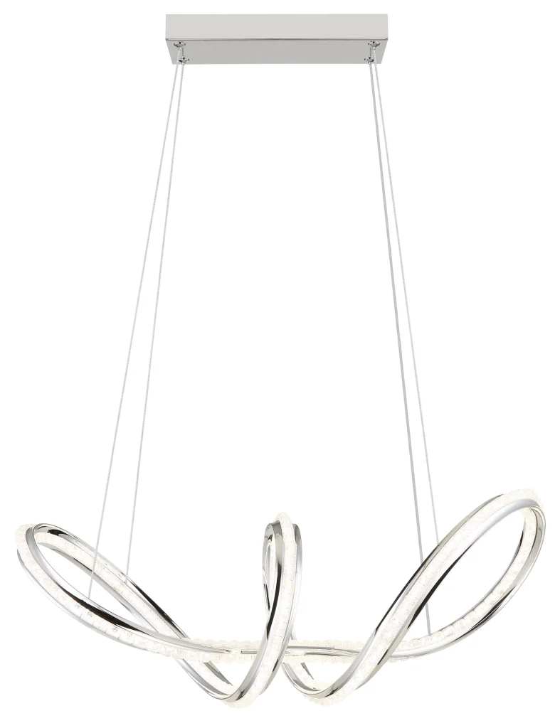 Zakrivljena viseća lampa impresionira svojim modernim dizajnom sa elegantnim petljama i čvorovima. Hromirano metalno kućište daje lampi visokokvalitetan, sjajan izgled, dok hromirani aluminijumski abažur u kombinaciji sa providnim akrilom obezbeđuje ravnomernu i stilsku raspodelu svetlosti. Sa dužinom od 600 mm i širinom od 260 mm, ova lampa je idealna za trpezarije, dnevne prostore ili hodnike. Viseća lampa uključuje integrisanu LED diodu (uključenu) koja isporučuje 2250 lumena sa podesivom temperaturom boje od 2700 K do 6000 K. Sa daljinskim upravljačem, funkcijom prigušivanja, fiksnim bojama i funkcijom memorije, nudi maksimalnu fleksibilnost i udobnost. Integrisano noćno svetlo upotpunjuje njenu funkcionalnost. Ova lampa kombinuje moderan dizajn, inovativnu LED tehnologiju i vrhunske materijale kako bi stvorila pravi centralni deo.
