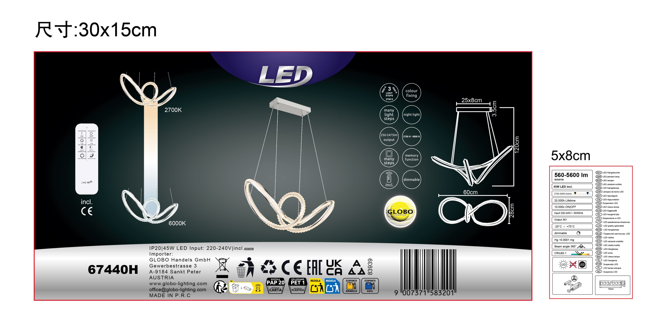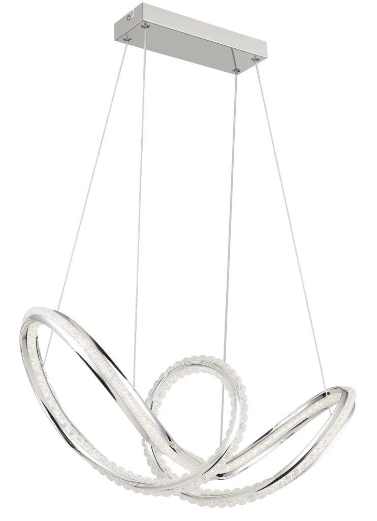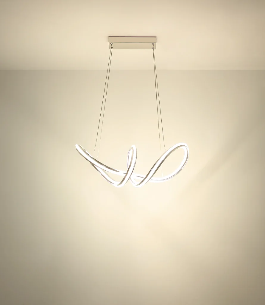 Zakrivljena viseća lampa impresionira svojim modernim dizajnom sa elegantnim petljama i čvorovima. Hromirano metalno kućište daje lampi visokokvalitetan, sjajan izgled, dok hromirani aluminijumski abažur u kombinaciji sa providnim akrilom obezbeđuje ravnomernu i stilsku raspodelu svetlosti. Sa dužinom od 600 mm i širinom od 260 mm, ova lampa je idealna za trpezarije, dnevne prostore ili hodnike. Viseća lampa uključuje integrisanu LED diodu (uključenu) koja isporučuje 2250 lumena sa podesivom temperaturom boje od 2700 K do 6000 K. Sa daljinskim upravljačem, funkcijom prigušivanja, fiksnim bojama i funkcijom memorije, nudi maksimalnu fleksibilnost i udobnost. Integrisano noćno svetlo upotpunjuje njenu funkcionalnost. Ova lampa kombinuje moderan dizajn, inovativnu LED tehnologiju i vrhunske materijale kako bi stvorila pravi centralni deo.
