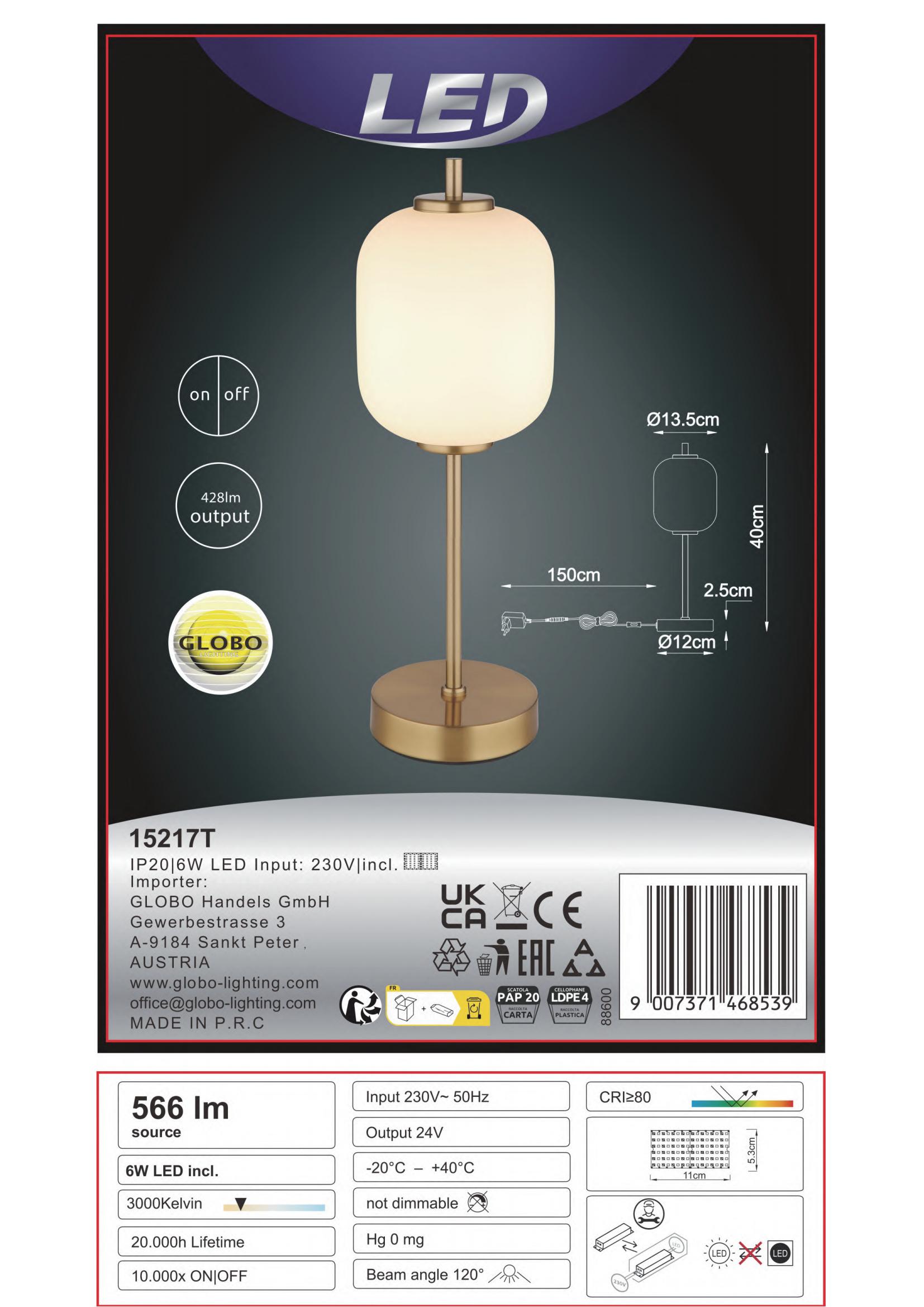 Stona lampa EWALD impresionira svojim okruglim dizajnom sa ravnom cevčicom i lukovičastim staklenim abažurom u opal beloj boji. Telo napravljeno od metala boje mesinga daje lampi dašak elegancije i savršeno se uklapa u moderne ili klasične stilove enterijera. Stona lampa EWALD je idealna za upotrebu kao akcentno osvetljenje na bočnom stočiću, noćnom stočiću ili polici. Sa svojim toplim belim svetlom (3000K), stvara ugodnu atmosferu i prijatno raspoloženje. Prekidač na kablu vam omogućava da lako uključite i isključite svetlo. EWALD se takođe može koristiti u kombinaciji sa drugim visećim lampama kako bi se stvorio harmoničan dizajn osvetljenja u prostoriji. Ova stona lampa nije samo funkcionalna, već je i dekorativni element koji dodaje stilski dodir svakoj prostoriji.