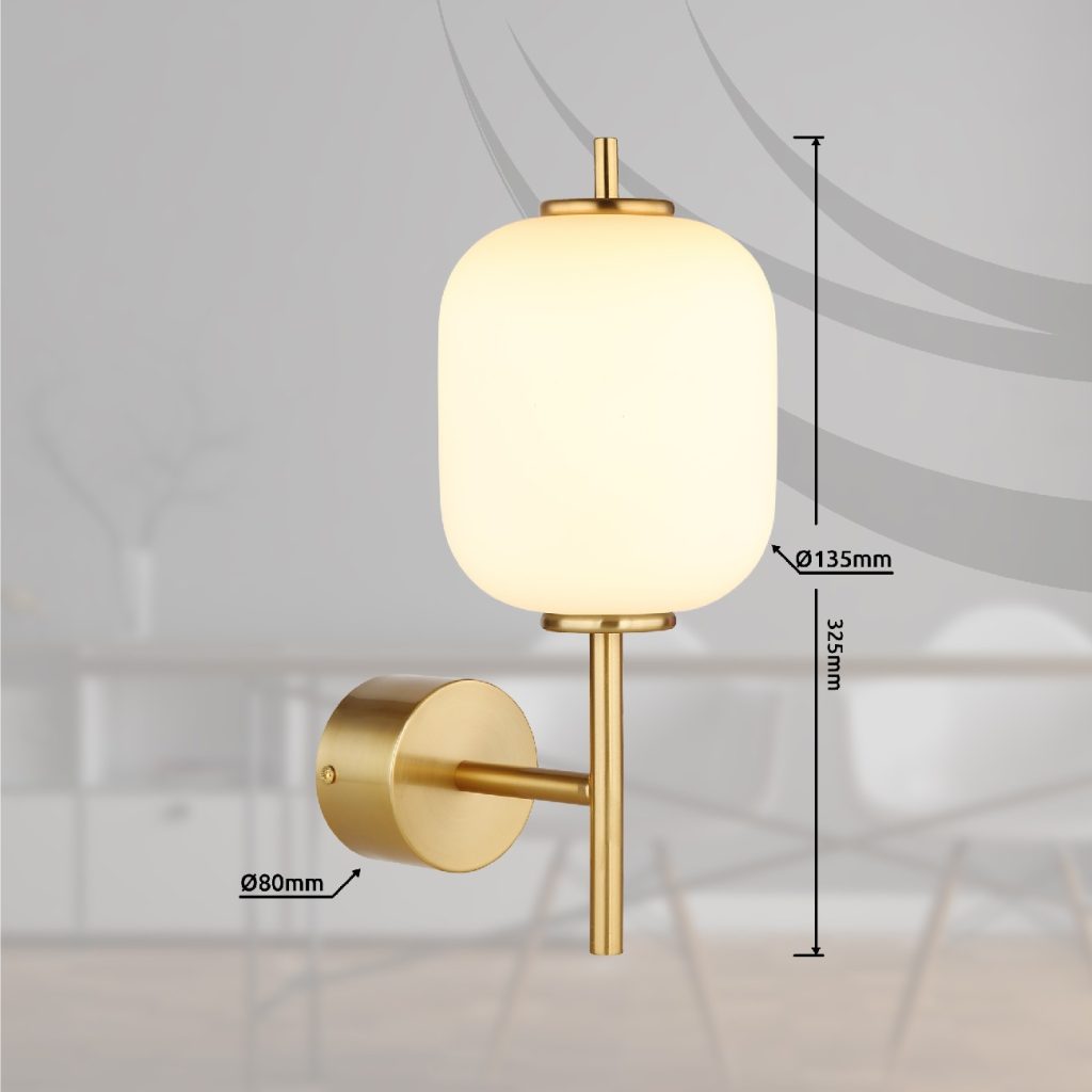Zidna lampa serije EWALD ističe se po svom elegantnom izgledu i kvalitetnoj izradi. Napravljena je od metala boje mesinga i oplanog stakla. Sjaj svetlosti je usmeren na gore i stvara prijatnu atmosferu u svakoj prostoriji. Lampa je opremljena sijalicom snage od 6W. Izvor svetlosti ima osvetljenost od 600 lumena izvora i izlaznu svetlost od 360 lumena pri temperatupi boje od 3000K. Savršena je za dnevnu sobu, hodnik ili spavaću sobu. Dimenzije: širina 135 mm, visina 290 mm i udaljenost od zida 190 mm.