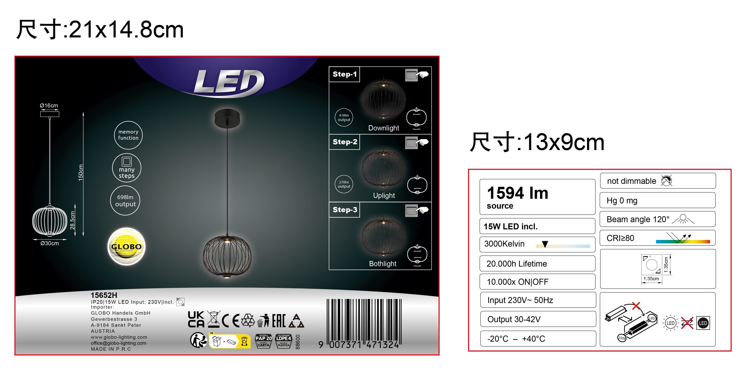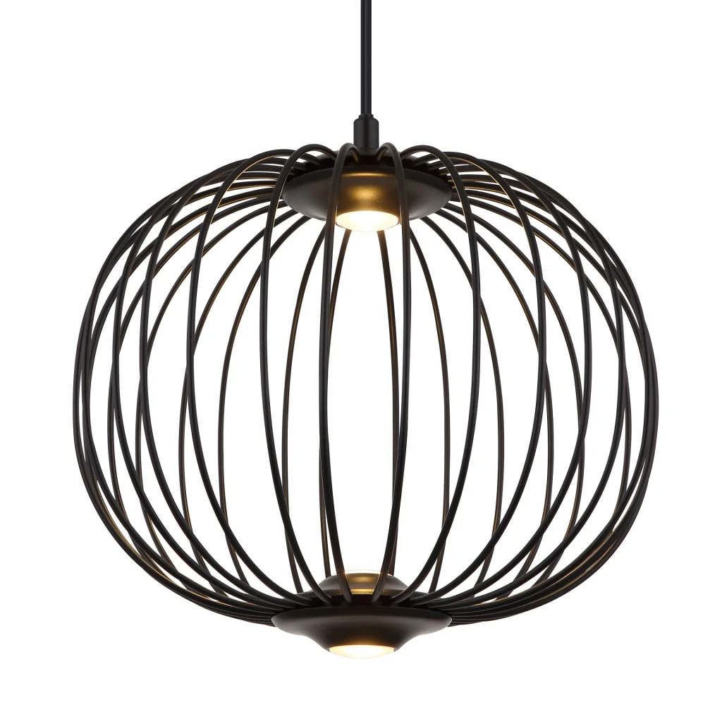 Dajte svojoj sobi elegantan ambijent uz viseću lampu PENDANT LAMP GALWAY METAL BLACK MATT. Ova okrugla lampa sa abažurom napravljenim od metalnih šipki nudi jedinstven izgled. Telo je napravljeno od crnog mat lakiranog metala, dok je sam abažur crn, mat lakiran i napravljen od aluminijuma. Svetiljka prečnika ø: 300 mm ima LED tehnologiju i nudi emisiju od 450 lumena. Može se koristiti u tri faze: 1 glavno svetlo, 2 donja svetla ili 3 oba zajedno. Zbog svog okruglog oblika i posebnog dizajnerskog izgleda, ova viseća lampa izgleda kao jedinstvena dekoracija u vašoj sobi. Sa svojom mat crnom završnom obradom, nudi elegantan dodir koji će ulepšati vaš dom.