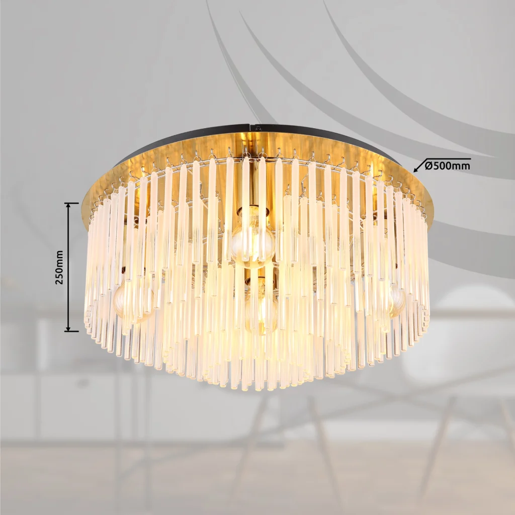 Okrugla plafonska lampa GORLEY uverava svojim jedinstvenim dizajnom i stvara posebnu atmosferu u vašem domu. Viseće lampe su završene kućištem od mat, zlatnog metala i crnog metala. Abažur je napravljen od opalnih, providnih staklenih šipki koje stvaraju prelep svetlosni efekat i glatko se okreću. Sa prečnikom od 500 mm, plafonska lampa GORLEY je prava atrakcija u svakoj prostoriji. Pruža prijatno osvetljenje i dodaje elegantan dodir vašem domu. Instalacija plafonske lampe GORLEY je jednostavna i laka. Zahvaljujući priloženom materijalu za montažu, svetiljku možete brzo i bezbedno pričvrstiti. Visokokvalitetna izrada i robustan materijal obećavaju dug vek trajanja. Sa plafonskom lampom GORLEY možete ostaviti utisak u svom domu i stvoriti jedinstvenu atmosferu.
