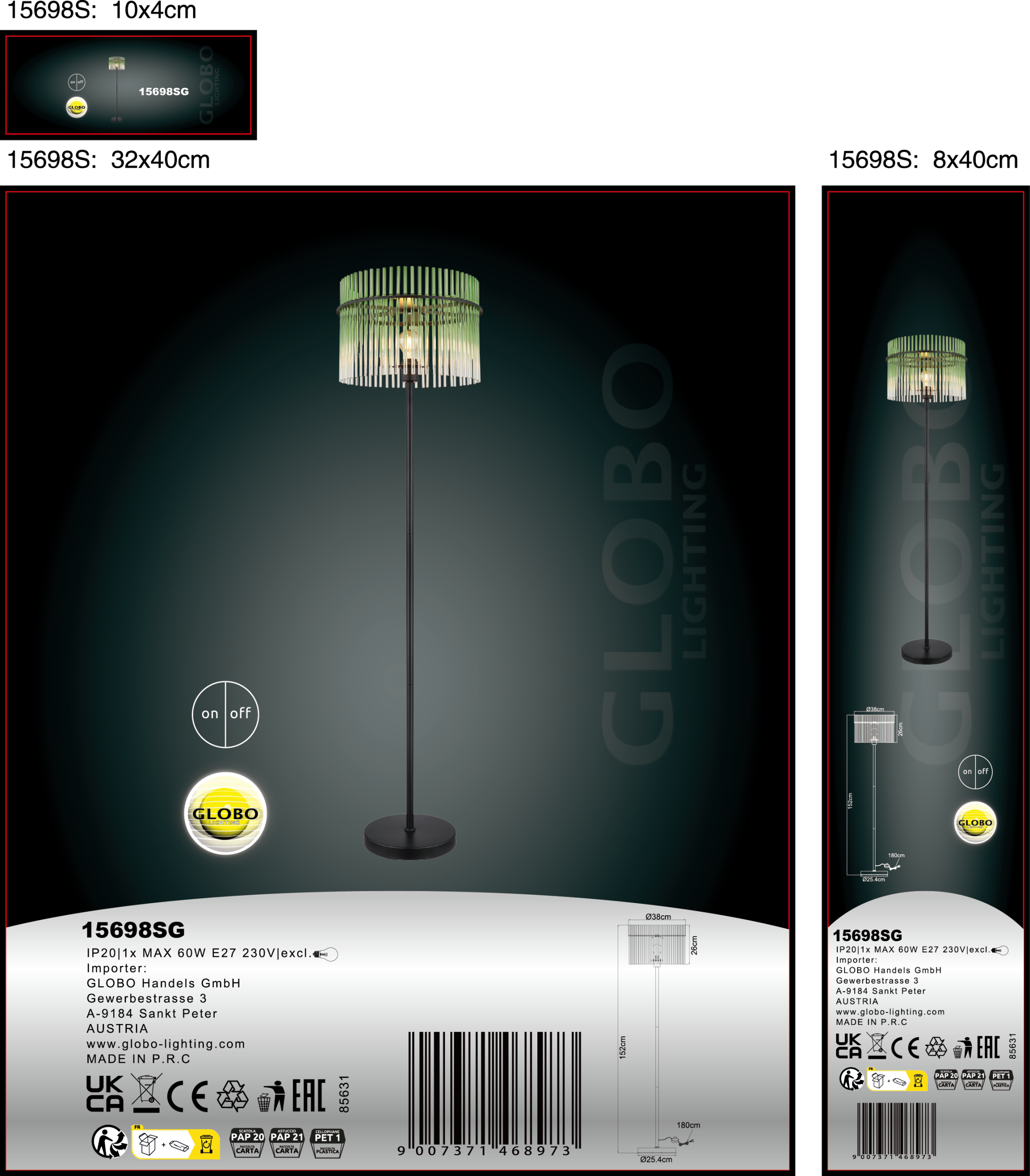 Podna lampa GORLEY impresionira svojim modernim i elegantnim dizajnom. Njeno okruglo telo od mat crnog metala nosi podjednako okrugli abažur napravljen od zelenih staklenih šipki, koje su jasno i umetnički raspoređene. Ovaj dizajn stvara fascinantnu igru svetlosti i stvara prijatnu atmosferu u prostoriji. Sa prečnikom od 380 mm, podna lampa GORLEY je idealna za različite koncepte prostorija i postavlja stilske akcente u dnevnim sobama, spavaćim sobama ili kancelarijama. Nožni prekidač na kablu omogućava praktično rukovanje i čini podnu lampu posebno jednostavnom za korišćenje. Zahvaljujući visokokvalitetnoj izradi i dobro osmišljenom dizajnu, podna lampa GORLEY nije samo efikasan izvor svetlosti, već i dekorativni element koji ulepšava prostoriju i obogaćuje ambijent. Harmonično se uklapa u moderne stilove nameštaja i dodaje savremeni dodir svakoj prostoriji.
