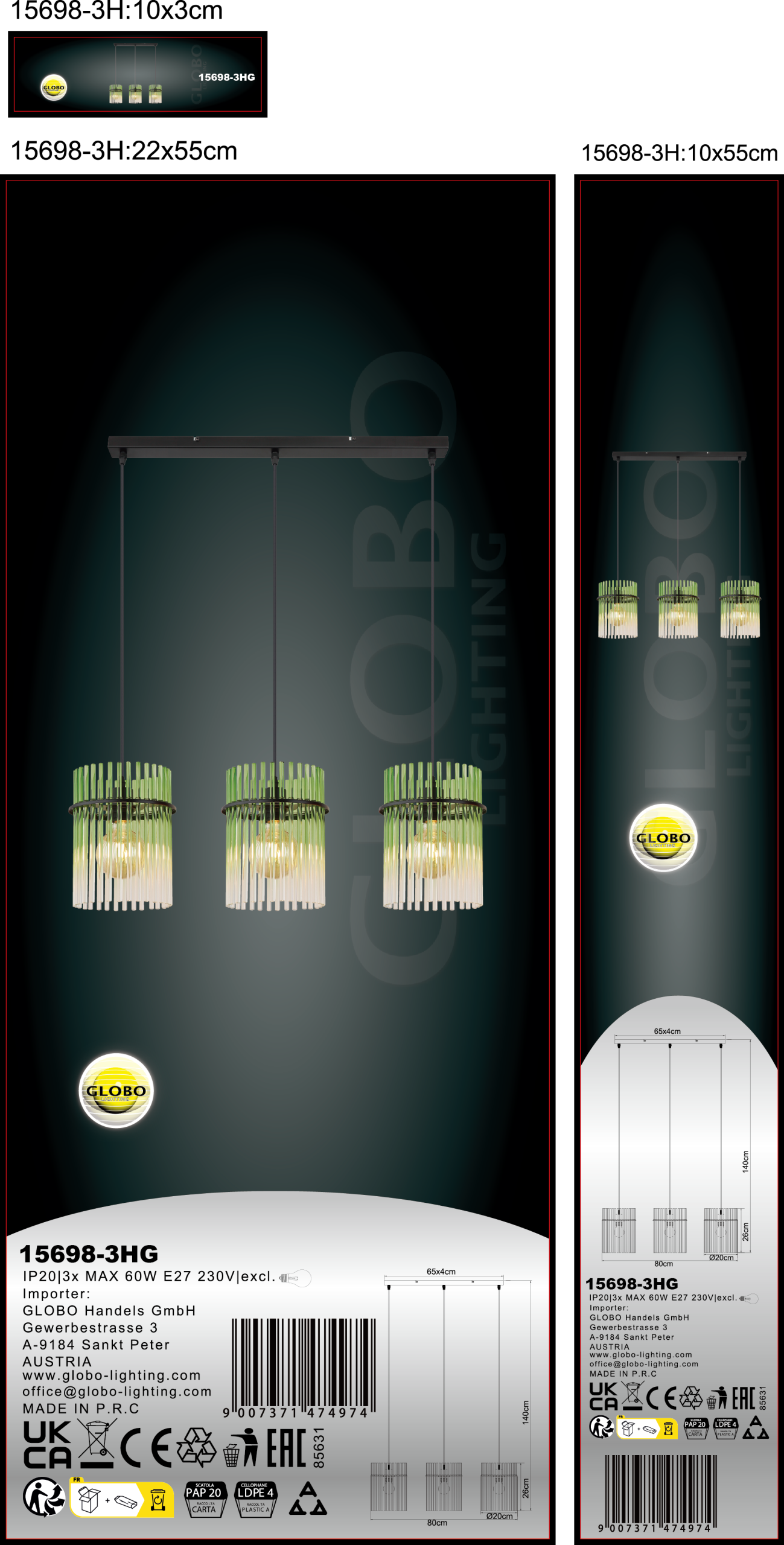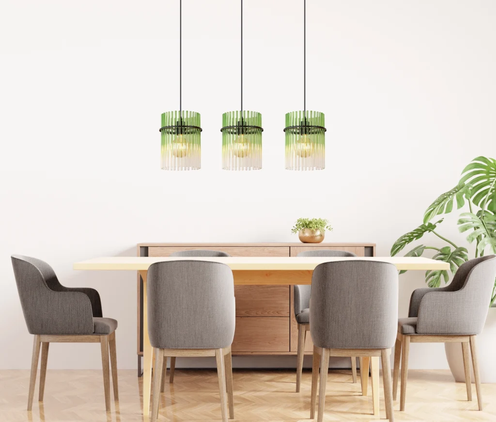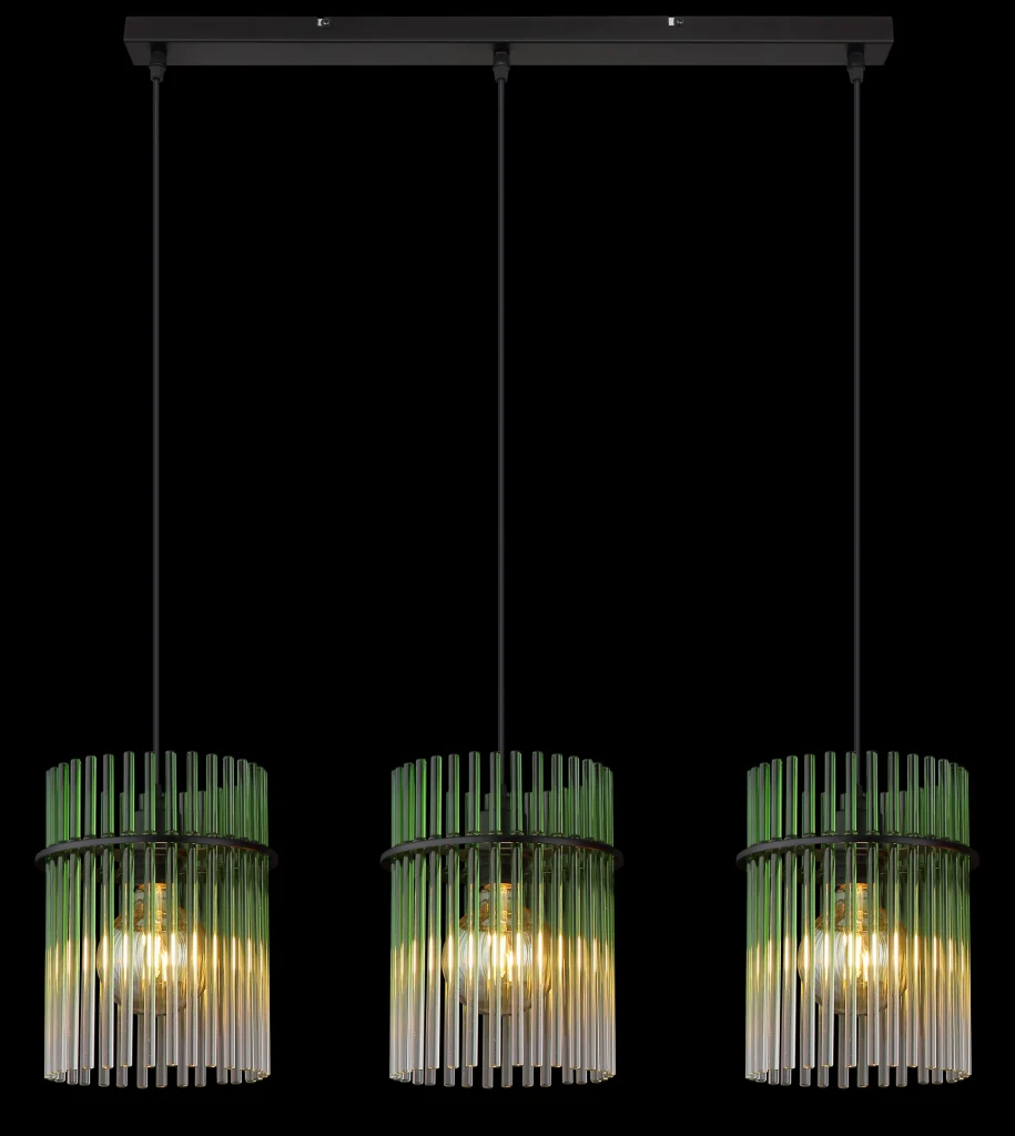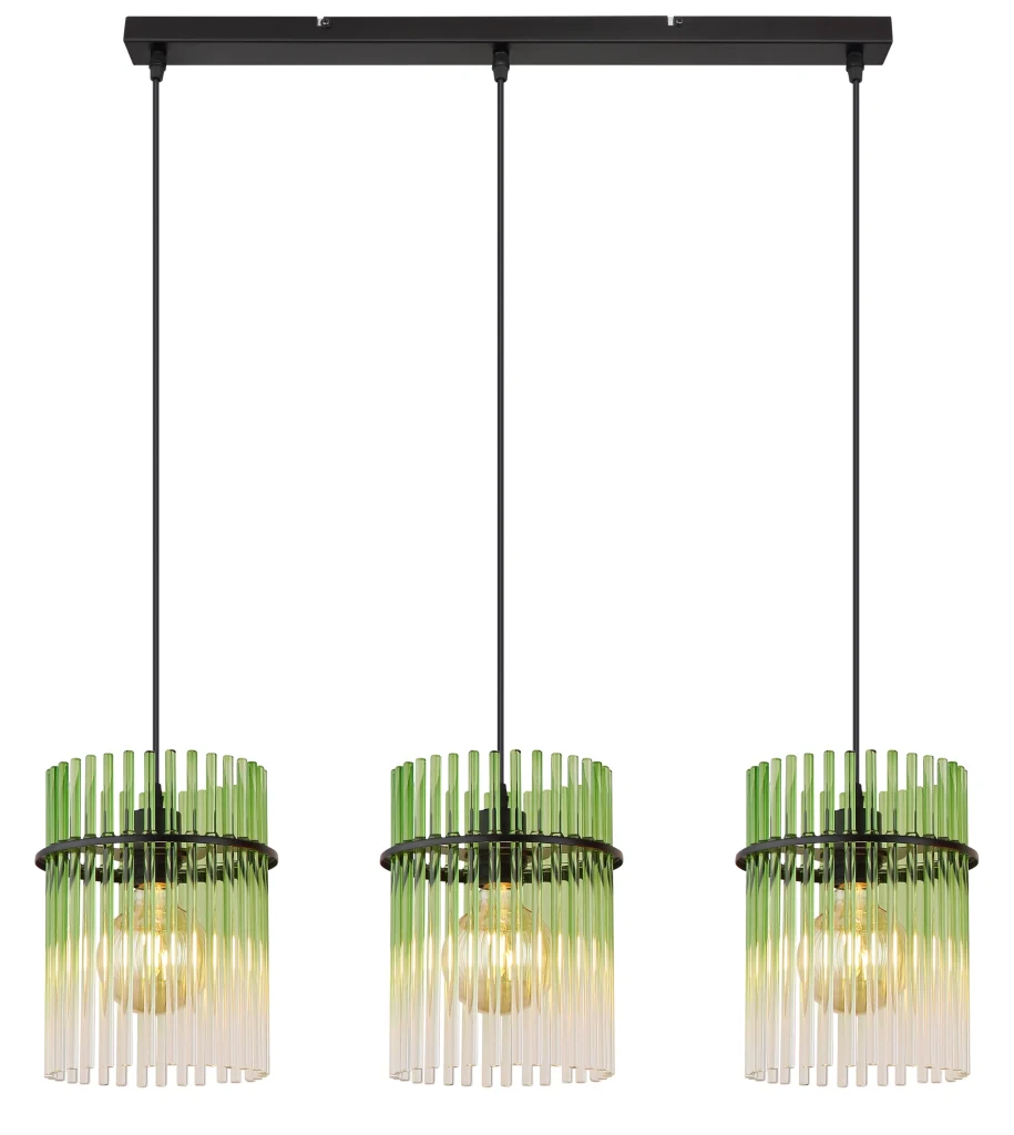 Viseća lampa GORLEY kombinuje moderan dizajn sa elegantnom funkcionalnošću. Ova stilska viseća lampa ima ravnu šinu na koju su pričvršćena tri vešalice. Svaka vešalica je opremljena okruglim kišobranom napravljenim od staklenih šipki. Staklene šipke su dizajnirane u fascinantnoj zelenoj, prozirnoj i gradijentnoj boji, stvarajući jedinstvenu igru svetlosti. Izduženi oblik lampe je idealan za upotrebu iznad trpezarijskih stolova, u dnevnim boravcima ili iznad pultova i harmonično se uklapa u različite stilove opremanja. Telo viseće lampe je napravljeno od mat crnog metala, što joj daje moderan i istovremeno bezvremenski izgled. Sa visećom lampom GORLEY, unosite vrhunac u svoj dom, koji ne samo da uverava svojim atraktivnim izgledom, već i visokokvalitetnom izradom. Kombinacija metala i stakla čini ovu lampu posebnim faktorom koji ulepšava svaku prostoriju i pruža prijatno osvetljenje.
