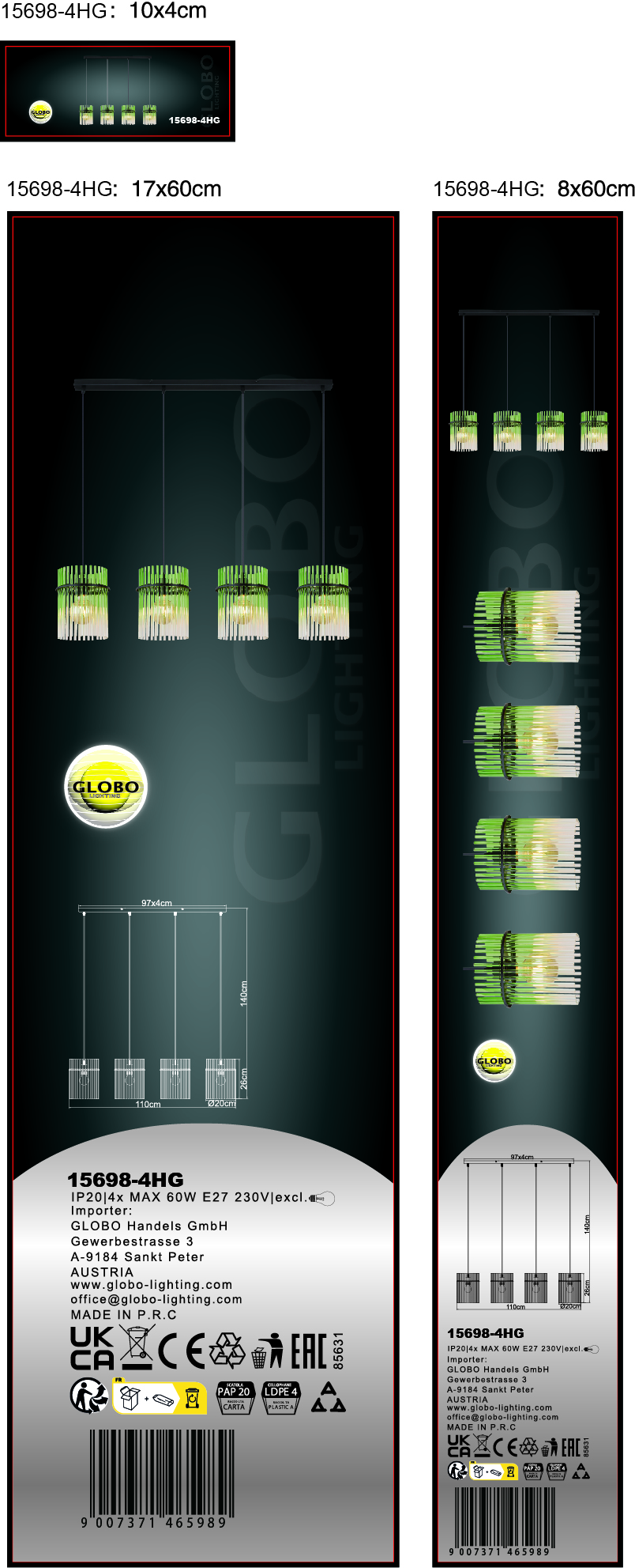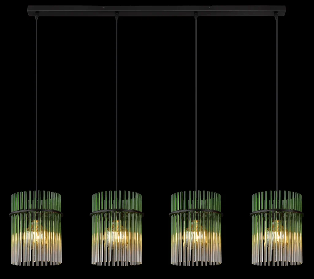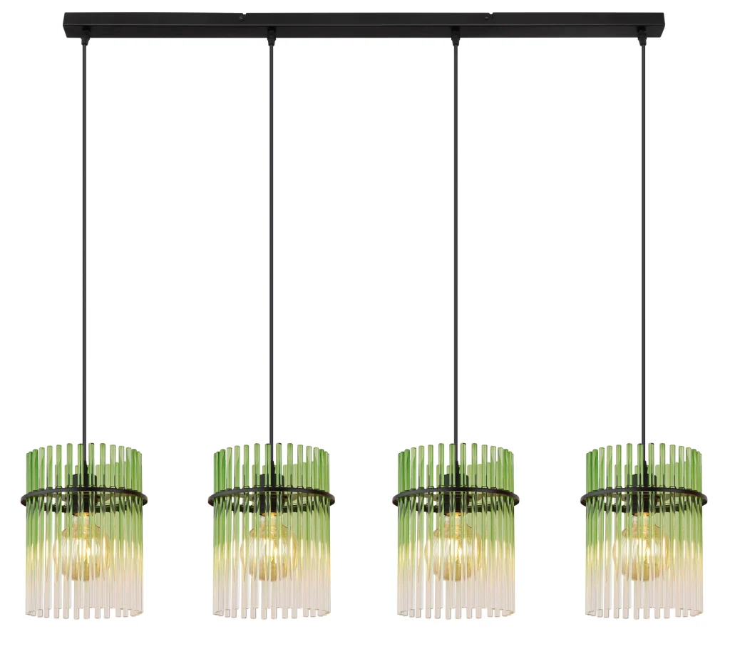 Viseća lampa GORLEY kombinuje bezvremenski dizajn sa upečatljivom estetikom. Četiri vešalice su pričvršćene za ravnu šinu, svaka opremljena okruglim suncobranima napravljenim od zelenih staklenih šipki. Ove staklene šipke su providne i stvaraju jedinstvenu igru svetlosti koja stvara toplu atmosferu u prostoriji. Izduženi oblik viseće lampe čini je idealnom za upotrebu iznad trpezarijskih stolova, u dnevnim boravcima ili iznad pultova. Mat, crno metalno kućište daje visećoj lampi GORLEY modernu eleganciju i čini je stilskim elementom u svakoj prostoriji. Ova viseća lampa nije samo dekorativni element, već je i funkcionalna zahvaljujući visokokvalitetnoj izradi i prijatnoj svetlosti koju širi. Sa visećom lampom GORLEY, možete se osloniti na kvalitet i stil koji će na poseban način obogatiti vaše životne prostore i učiniti ih privlačnim.