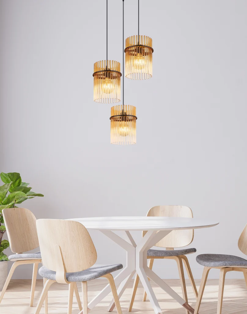 Viseća lampa GORLEY kombinuje moderan dizajn sa elegantnom funkcionalnošću. Ova stilska viseća lampa ima tri vešalice pričvršćene za okruglu šinu. Svaka vešalica je opremljena okruglim kišobranom napravljenim od staklenih štapića. Ove staklene štapiće su ćilibarne boje i providne, stvarajući fascinantnu igru svetlosti. Okrugli oblik lampe se harmonično uklapa u različite koncepte prostorija i postavlja stilske akcente iznad trpezarijskih stolova, u dnevnim boravcima ili iznad pultova. Telo viseće lampe je napravljeno od mat crnog metala, što joj daje moderan i istovremeno bezvremenski izgled. Viseća lampa GORLEY nije samo vizuelni vrhunac, već ubeđuje i svojom visokokvalitetnom izradom. Kombinacija metala i stakla čini ovu lampu posebnim detaljem koji ulepšava svaku prostoriju i pruža prijatno osvetljenje. Sa visećom lampom GORLEY možete uneti pravi dizajnerski vrhunac u svoj dom.