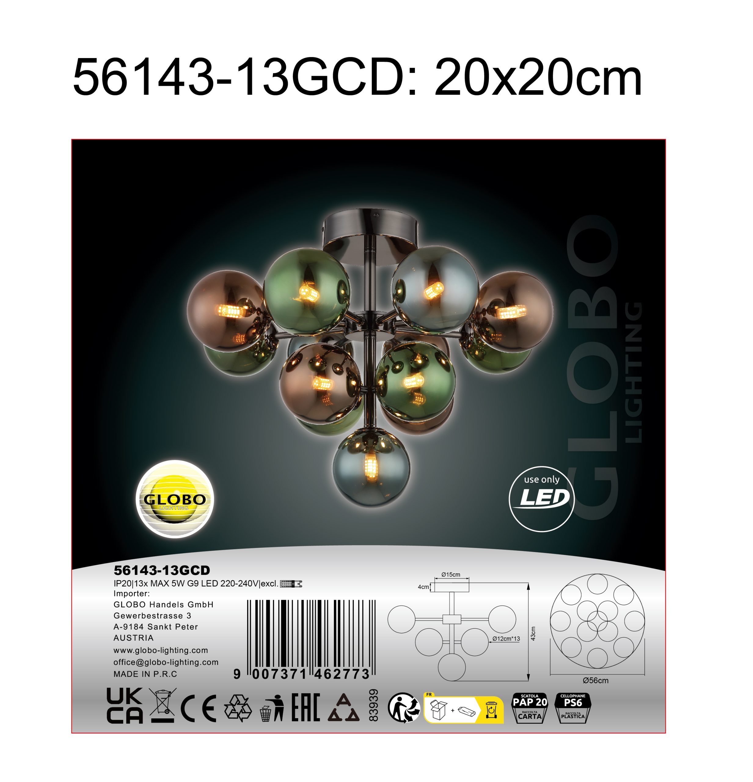 Plafonska lampa GRAPPY predstavlja jedinstven komad sa svojim okruglim dizajnom i obiljem šarenih staklenih kuglica. Njeno crno hromirano metalno kućište daje joj modernu estetiku, dok je abažur sastavljen od mnoštva staklenih sfera u bronzanoj, zelenoj i petrol boji. Sa prečnikom od 560 mm, ova plafonska lampa se savršeno uklapa u različite veličine prostorija i pruža impresivnu igru svetlosti. Svaka od staklenih sfera reflektuje svetlost na svoj način, što doprinosi fascinantnoj igri boja i prijatnoj atmosferi. Plafonska lampa GRAPPY nije pogodna samo za upotrebu u dnevnim sobama, već i za hodnike, trpezarije ili kancelarije, gde dodaje dašak boje i elegancije. Sa svojim bezvremenskim dizajnom i visokokvalitetnom izradom, savršen je izbor za ljubitelje modernih koncepata osvetljenja.