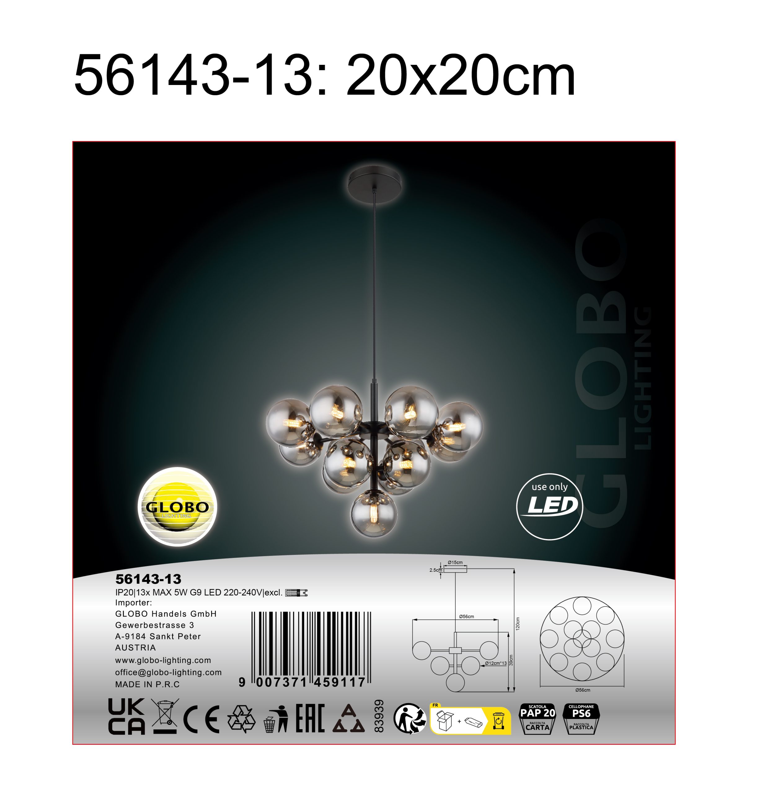 Okrugla viseća lampa PENDANT LAMP METAL BLACK MATT je pravi vrhunac za svaku sobu. Sa svojim modernim dizajnom i mnogim dimljenim staklenim kuglicama, dodaje elegantan dodir svakoj prostoriji. Telo napravljeno od crnog mat lakiranog metala i staklene sfere pružaju atmosfersku igru svetlosti. Sa prečnikom od 560 mm i ukupno 13 G9 LED sijalica, ova viseća lampa nudi snagu od 5W. PENDANT LAMP METAL BLACK MATT nije samo pravi ukras za oči, već i efikasan izvor svetlosti za vaš dnevni boravak ili trpezariju. Postavite stilske akcente ovom visećom lampom i stvorite prijatnu atmosferu u svom domu.
