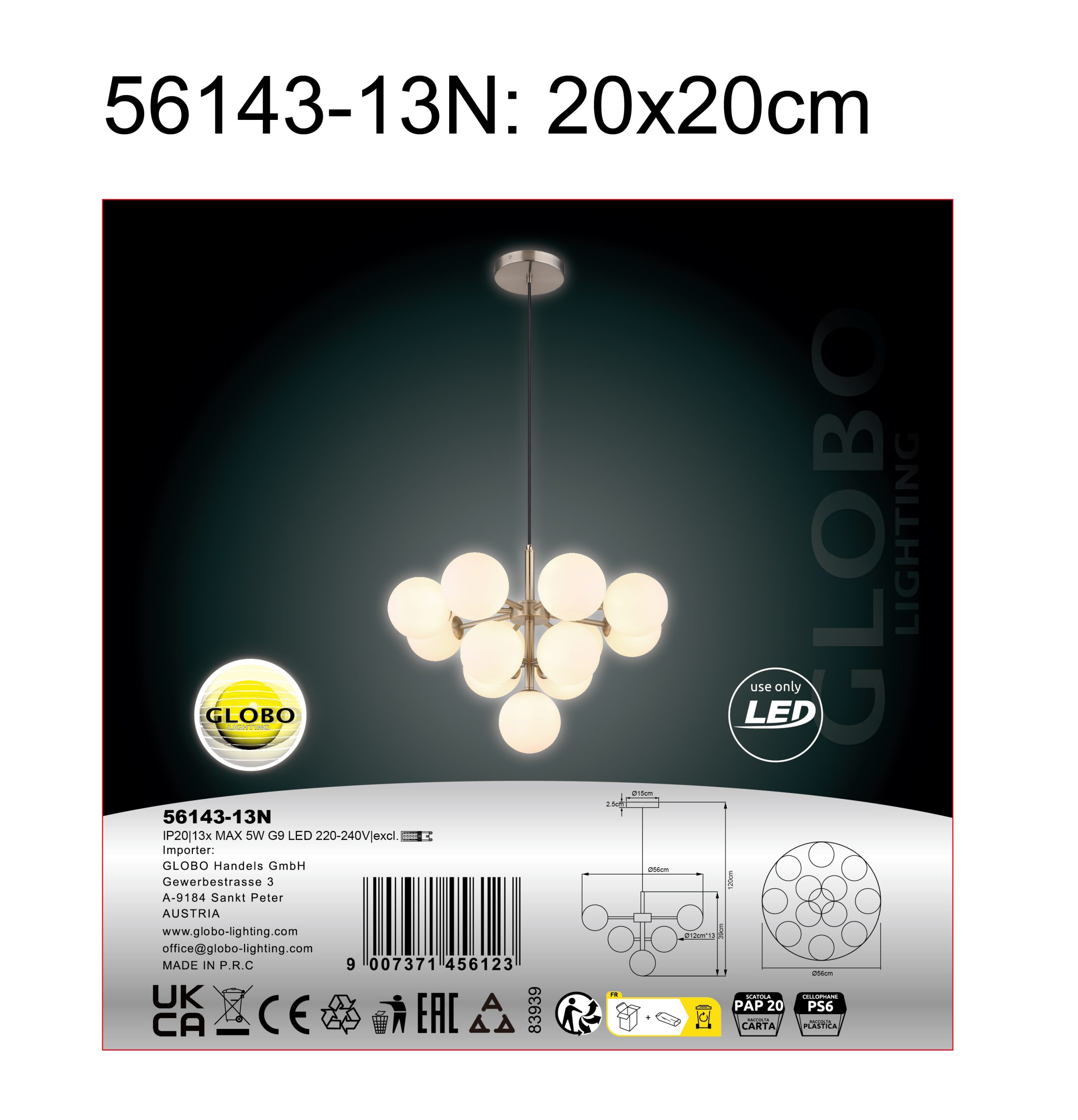 Moderna okrugla viseća lampa GRAPPY kombinuje jednostavnu eleganciju sa dodatkom ekstravagancije. Mat niklovano kućište i opal staklene sfere daju ovoj visećoj lampi stilski i bezvremenski dizajn. Sa prečnikom od 560 mm i ukupno 13 integrisanih G9 LED sijalica, ova viseća lampa pruža prijatno i svetlo osvetljenje u vašem životnom prostoru. Snaga LED dioda od 5 W obezbeđuje efikasno osvetljenje i atmosferski ambijent. GRAPPY nije samo funkcionalni izvor svetlosti, već i dekorativni element koji vizuelno ulepšava vašu sobu. Unesite moderan šarm u svoj dom pomoću ove viseće lampe i postavite stilske akcente u svoj enterijer.