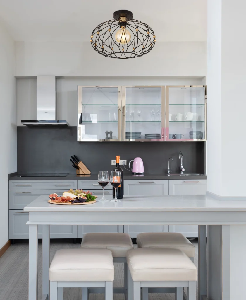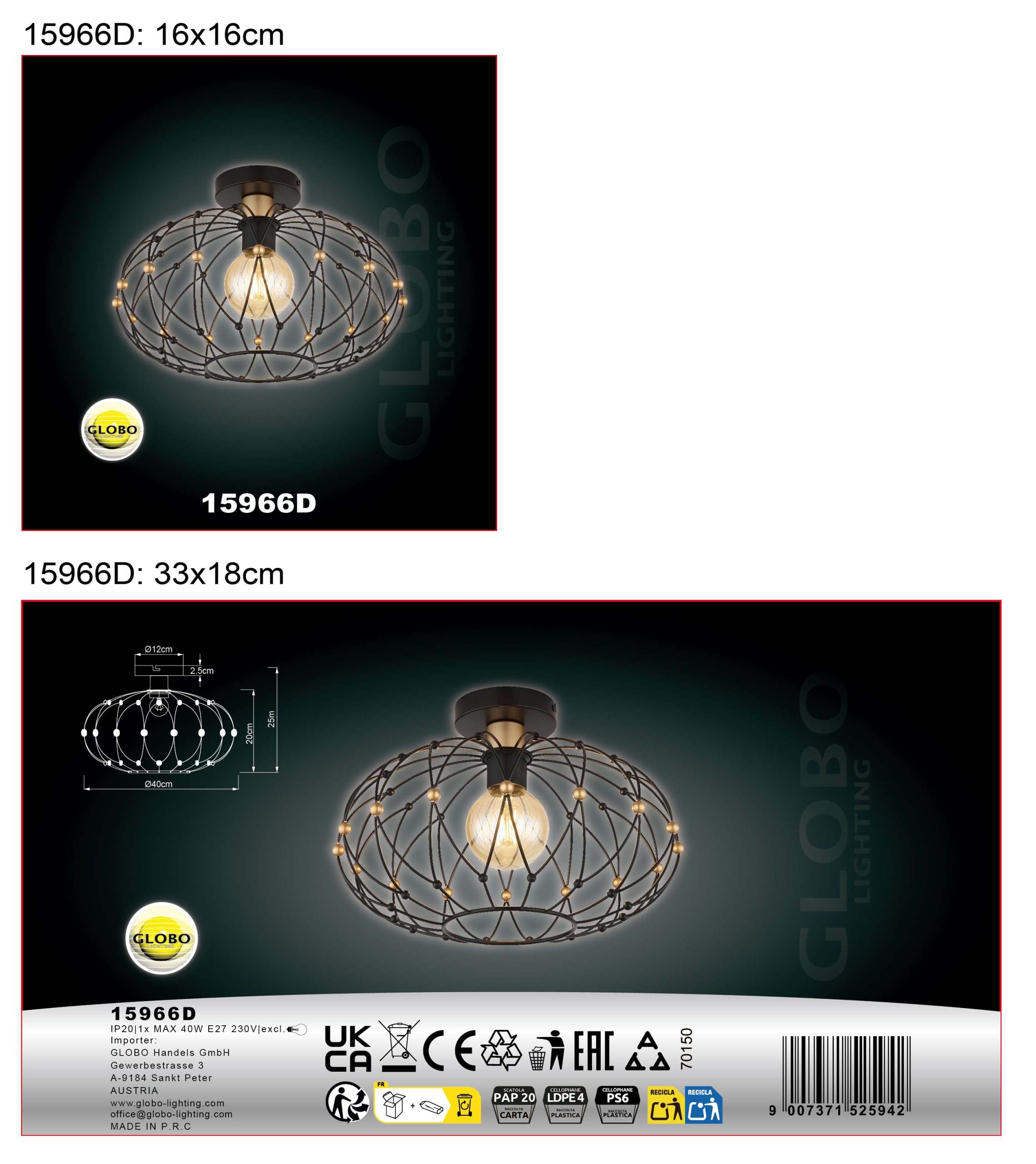 Plafonska lampa GRAYS u vintage stilu postavlja elegantne akcente u vašoj sobi. Okrugli metalni mrežasti abažur u mat crnoj boji obezbeđuje moderan i stilski izgled, dok zlatne dekorativne kuglice zaokružuju dizajn elegantnim dodirom. Telo napravljeno od mat crnog metala savršeno se usklađuje sa sofisticiranim abažurom i daje lampi elegantan izgled. Sa prečnikom od 400 mm, ova lampa je posebno svestrana i idealna je za manje prostorije ili kao dodatni element u većim sobama. Grlo E27 vam daje slobodu da izaberete pravu sijalicu kako biste postigli željeni intenzitet svetlosti. Isporuka bez sijalica E27. Plafonska lampa GREYS kombinuje vintage šik sa modernim dizajnom i daje vašoj sobi toplu, privlačnu atmosferu.