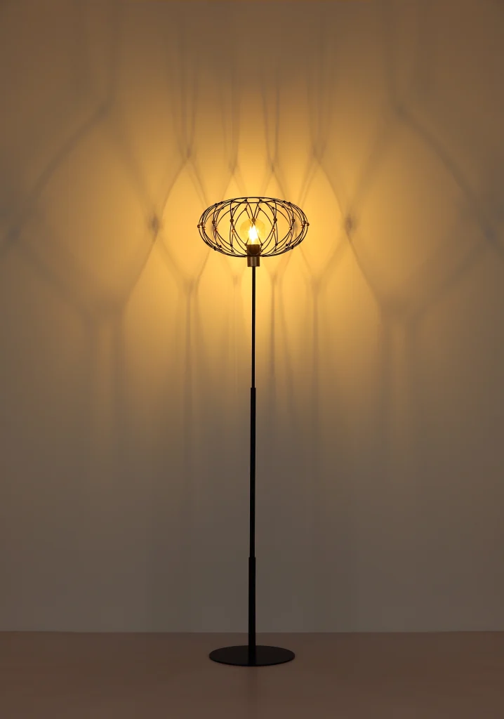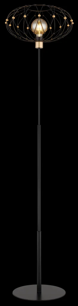 Podna lampa GRAYS u vintage stilu unosi industrijski šarm i luksuzne akcente u vaš dom. Sa svojim okruglim metalnim mrežastim abažurom u mat crnoj boji i elegantnim zlatnim dekorativnim kuglicama, daje vašoj sobi toplu, privlačnu atmosferu. Crno metalno kućište stvara elegantan kontrast sa nežnim detaljima kišobrana, dok nožni prekidač na kablu obezbeđuje praktično uključivanje i isključivanje. Sa prečnikom od 400 mm, podna lampa GRAYS je savršena za dnevne sobe, kutke za čitanje ili hodnike i stvara atmosfersko svetlo. Grlo E27 vam omogućava da izaberete pravu sijalicu prema vašim potrebama i da individualno podesite intenzitet svetlosti. Isporuka bez sijalica E27. Podna lampa GREYS je stilski detalj koji kombinuje vintage retro sa modernim akcentima i savršeno postavlja scenu za vaš dom.