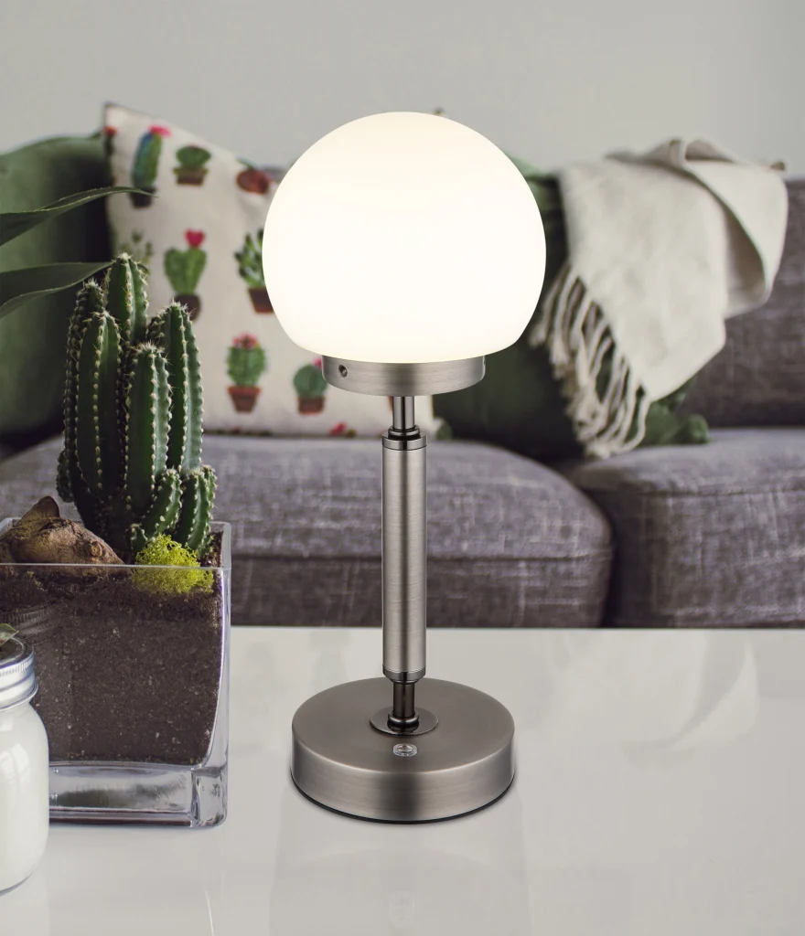 Osvetlite svoje sobe stonom lampom HAKU stilskog dizajna. Njen polukružni abažur od opal stakla daje meko svetlo, uz robusnu metalnu osnovu u antracit mat i sjajnoj boji. Ova stona lampa nudi bezstepeni dodirni dimer za individualna podešavanja osvetljenosti i funkciju memorije za čuvanje željenih podešavanja. Zahvaljujući mehanizmu za uključivanje/isključivanje na dodir, rukovanje je intuitivno. Svetiljka se može dimirati i omogućava podešavanje temperature boje od 2700 K do 4000 K za željeni ambijent. Uključen je USB kabl za punjenje za punjenje punjive baterije u roku od oko 4 sata, dok svetlo svetli tokom punjenja. Stona lampa HAKU nudi 160 lumena izlaza i pruža do 6 sati prijatnog svetla.
