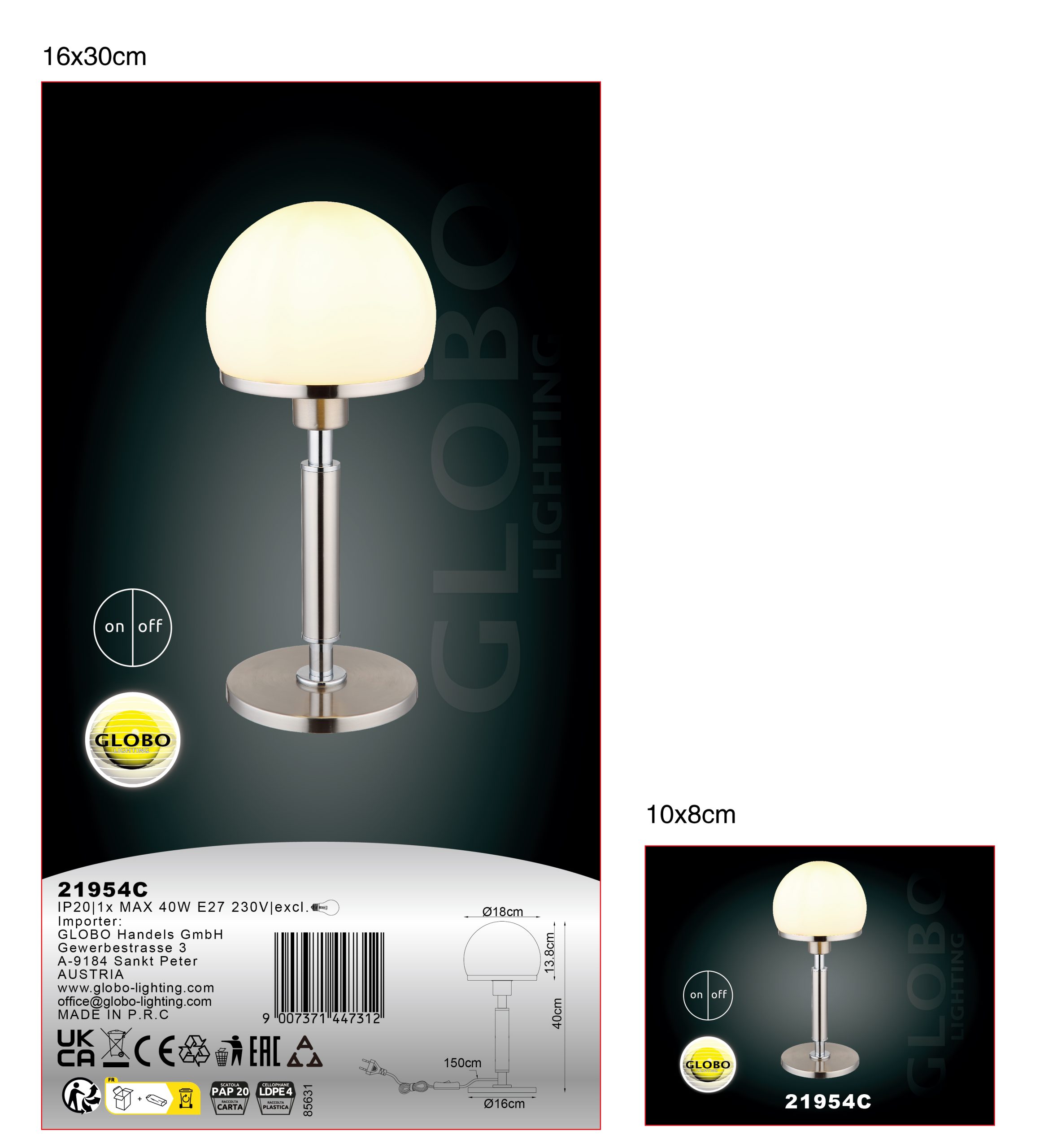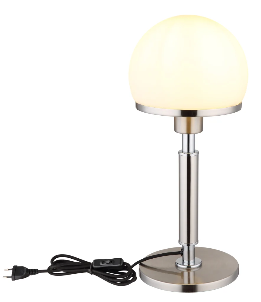 Elegantna stona lampa impresionira svojim modernim dizajnom i visokokvalitetnim materijalima. Polukružni abažur od providnog stakla i postolje od providnog stakla daju lampi plemenit izgled. Hromirano metalno kućište savršeno dopunjuje celokupnu sliku. Sa prečnikom od 180 mm i snagom od 40 W, stona lampa pruža prijatno osvetljenje u svakoj prostoriji. Opremljena grlom E27, nudi širok spektar opcija za individualni dizajn osvetljenja. Prekidač na kablu omogućava praktično rukovanje. Ova stona lampa kombinuje moderan dizajn sa praktičnom funkcionalnošću i postavlja stilske akcente u dnevnim i radnim prostorijama. Sa svojim bezvremenskim izgledom, savršen je izbor za atmosfersko osvetljenje u vašem domu.