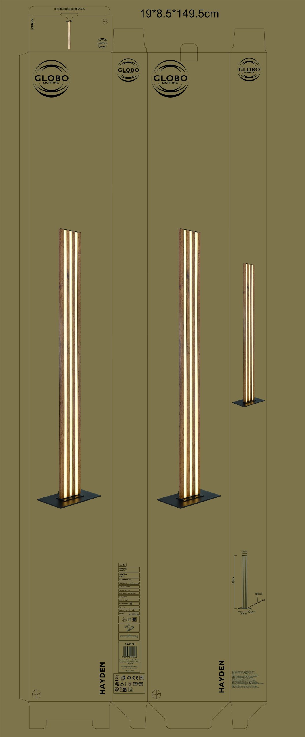 Podna lampa HAYDEN kombinuje moderan dizajn osvetljenja sa funkcionalnom akustičnom udobnošću, što je čini stilskim akcentom u dnevnim i radnim prostorima. Pravougaona akustična ploča sa tamnom MDF aplikacijom pod izgledom drveta ne samo da stvara topao, prirodan izgled, već i pomaže u poboljšanju akustike prostorije. Mat crno metalno kućište naglašava moderan karakter svetiljke, dok difuzor od opal plastike obezbeđuje ravnomernu raspodelu svetlosti bez odsjaja. Sa dužinom od 300 mm i širinom od 180 mm, HAYDEN se harmonično uklapa u različite koncepte enterijera i idealna je za dnevne prostore, kutke za čitanje ili kancelarije. Integrisana LED tehnologija pruža svetlosni izlaz od 1800 lumena na toploj beloj temperaturi boje od 3000 K, stvarajući ugodan i prijatan ambijent. Praktični nožni prekidač u kablu omogućava praktično uključivanje/isključivanje. Energetski efikasan, izdržljiv i zahteva malo održavanja, HAYDEN savršeno kombinuje stilski dizajn, akustične prednosti i funkcionalnu udobnost.
