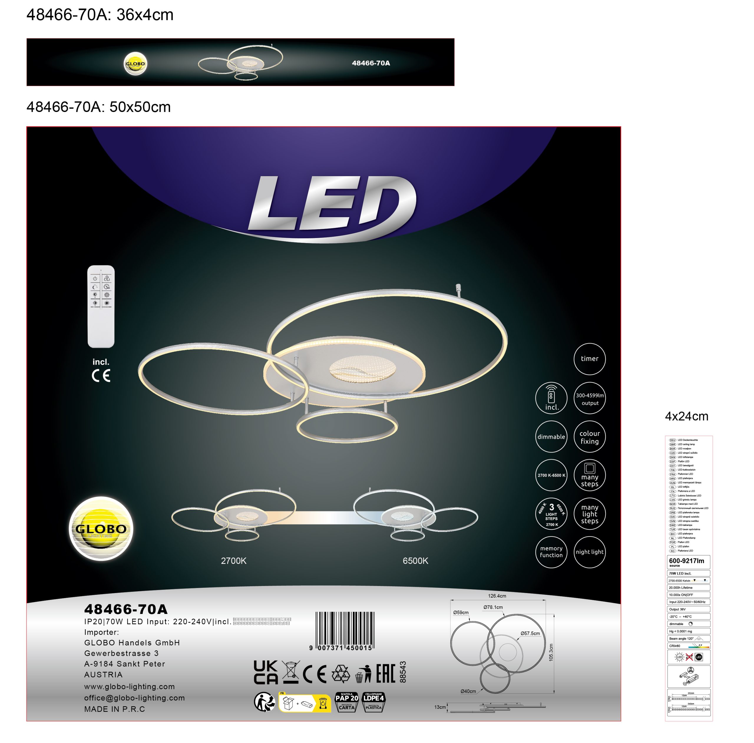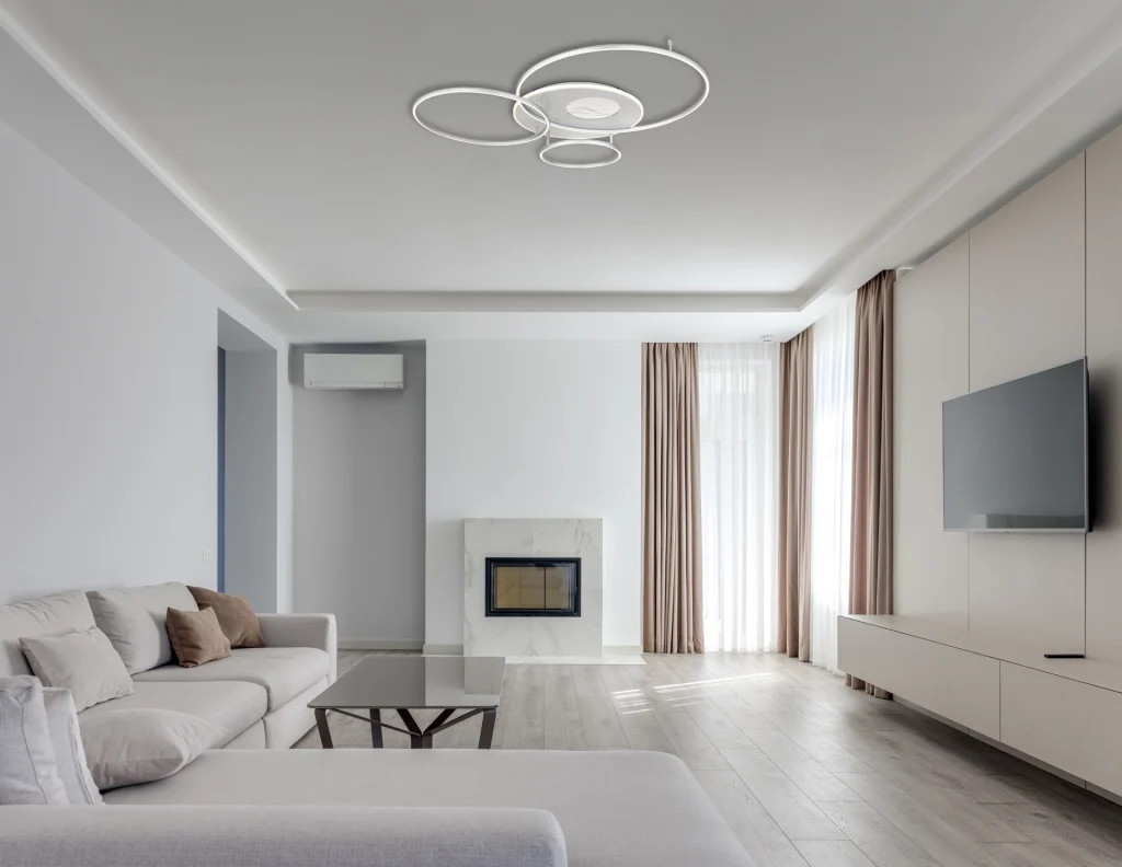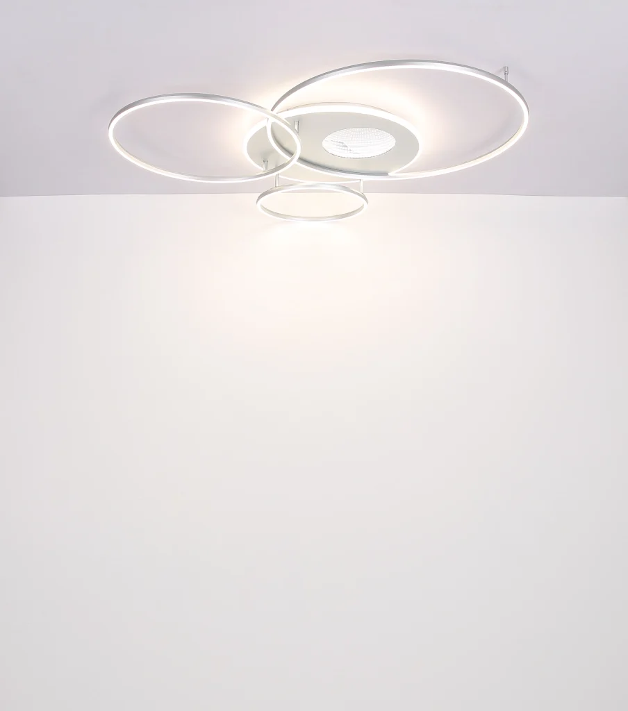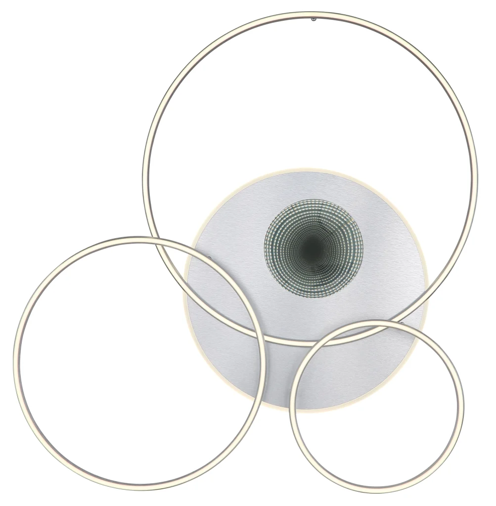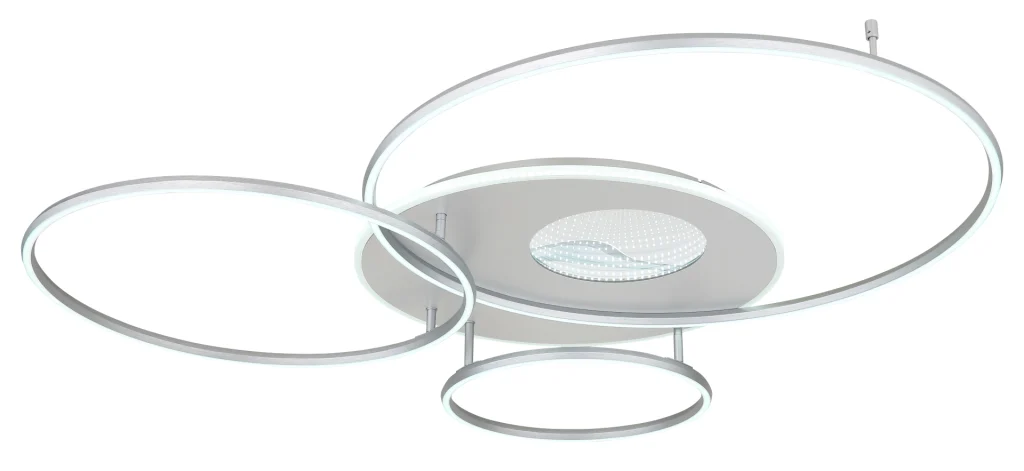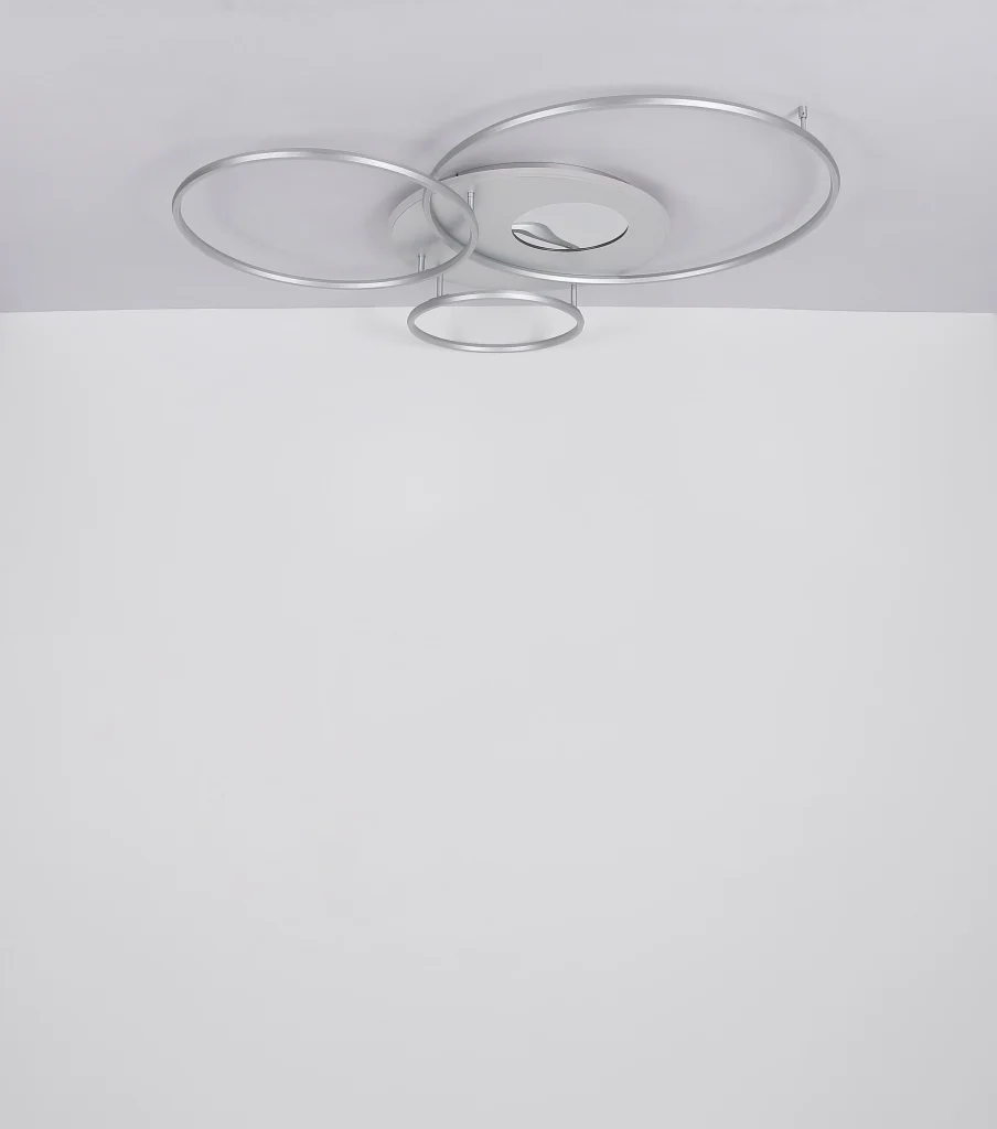 Elegantna plafonska lampa INVERTINA OD BRUŠENOG ALUMINIJUMA, SREBRNE BOJE, impresionira svojim modernim dizajnom sa 4 prstena postavljena jedan pored drugog. Telo napravljeno od mat brušenog srebrnog aluminijuma i opalno akrilno abažur sa 3D efektom ogledala daju ovoj lampi plemenit izgled. Uključeni daljinski upravljač vam omogućava da pojedinačno kontrolišete osvetljenje, svetiljka se može prigušiti i nudi nekoliko nivoa podešavanja osvetljenosti putem zidnog prekidača. Pored toga, boje se mogu fiksirati, a funkcija memorije obezbeđuje željena podešavanja. Režim noćnog svetla upotpunjuje ponudu. Sa dimenzijama od 1264 mm dužine i 1053 mm širine, izlazom od 4599 lumena i podešavanjima CCT od 2700K do 6500K, PLAVONA LAMPA OD BRUŠENOG ALUMINIJUMA, SREBRNE, pruža svetlo i atmosfersko osvetljenje u svakoj prostoriji.