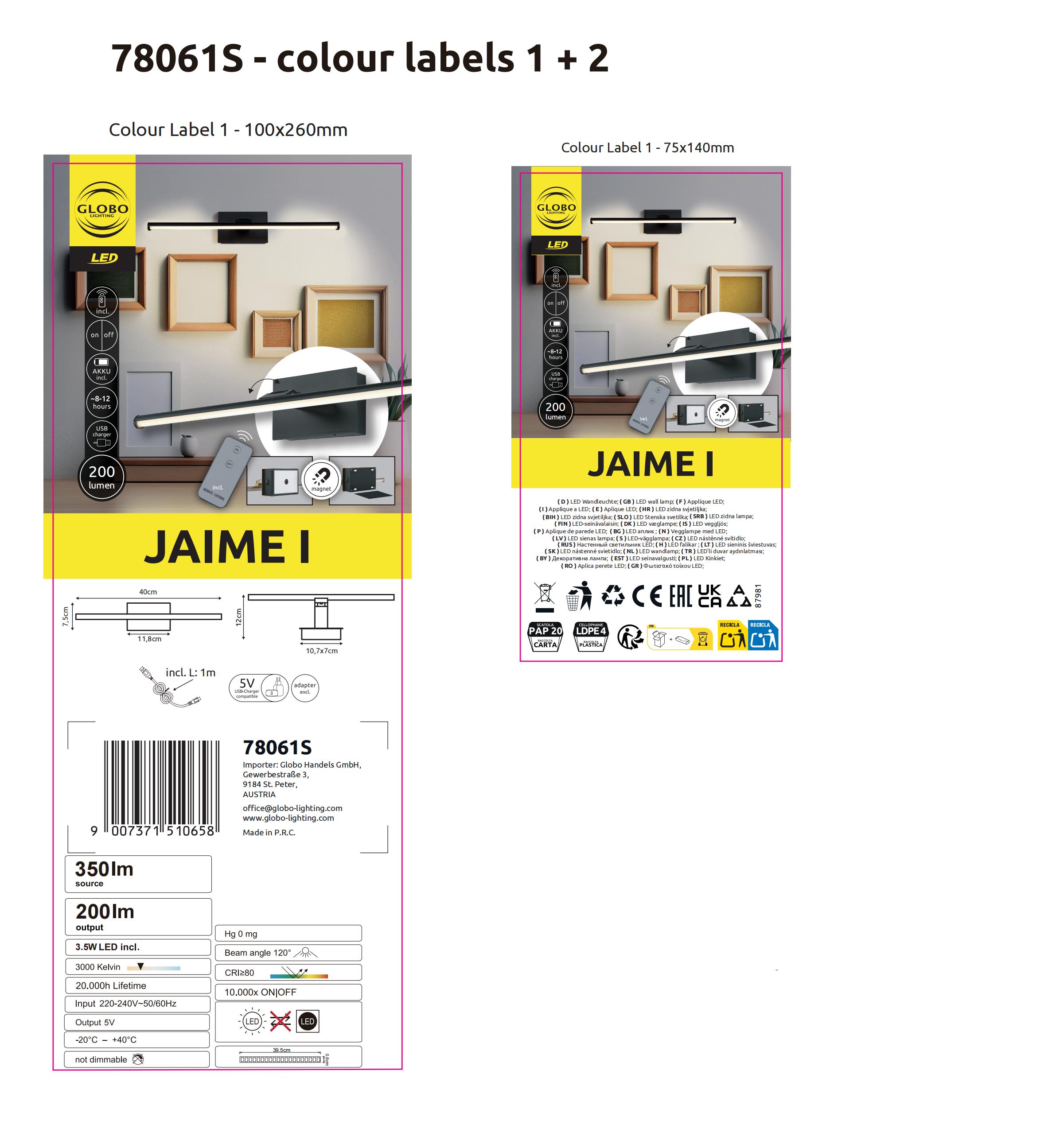 Izložite svoja umetnička dela sa stilom uz JAIME I Picture Light, pravougaonu i pokretnu zidnu lampu koja kombinuje najsavremeniju tehnologiju sa elegantnim dizajnom. Telo napravljeno od mat crnog metala i mat crni aluminijumski abažur se savršeno slažu sa opalnom plastikom, koja pruža ujednačenu svetlost. Zahvaljujući inteligentnom magnetu, svetiljka se može fleksibilno postaviti i podesiti. Sa širinom od 400 mm i visinom od 120 mm, JAIME I proizvodi svetlosni izlaz od 200 lumena i prijatnu temperaturu boje od 3000 K. Zidna lampa dolazi sa praktičnim daljinskim upravljačem sa prekidačem, adapterom i USB kablom za punjenje. Vreme punjenja je oko 6 sati, ali omogućava impresivno vreme rada do 12 sati. JAIME I čak svetli i tokom punjenja. Uživajte u ovom funkcionalnom i stilskom izvoru svetlosti za vaš dom!