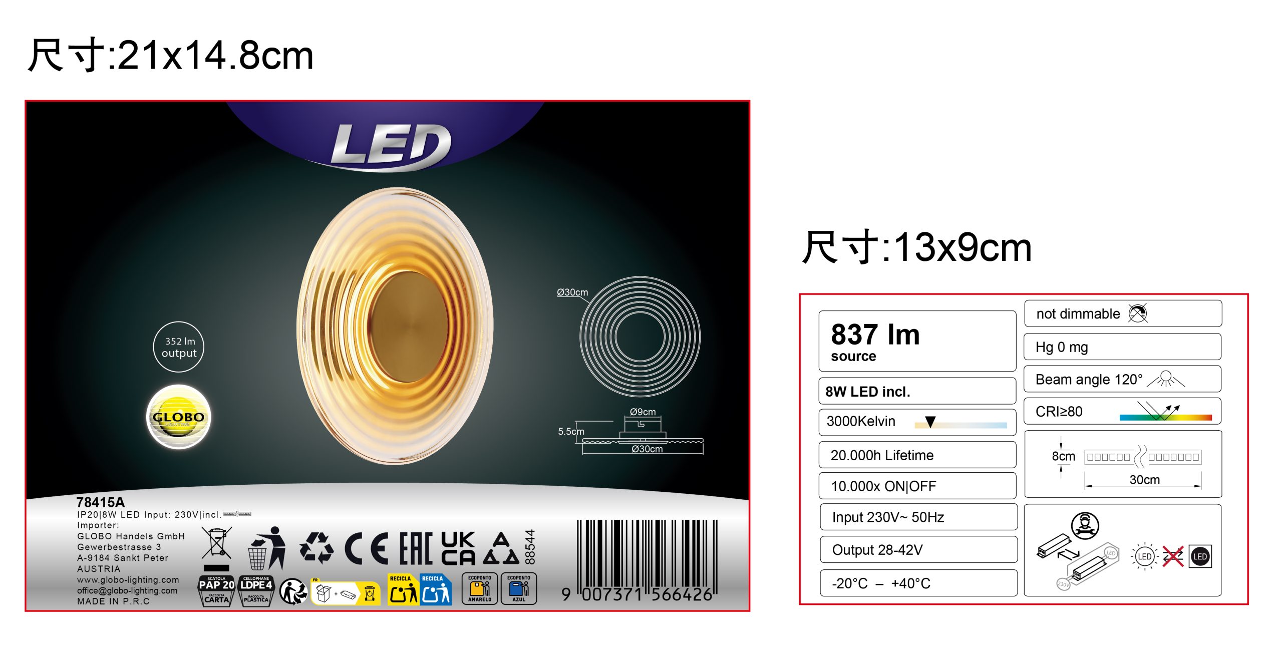 Zidna lampa JANELL daje svakoj prostoriji elegantnu i bezvremensku atmosferu. Okruglo telo napravljeno od metalnog mat metala boje mesinga, u kombinaciji sa abažurom od ćilibarnog stakla obezbeđuje harmoničnu raspodelu svetlosti i topao, privlačan izgled. Ravni disk abažura, ukrašen žlebovima, ne samo da nudi vizuelnu privlačnost, već i efikasno prelamanje svetlosti. Sa lumenskim izlazom od 352 lumena, integrisana LED dioda pruža prijatno toplo belo svetlo od 3000 K. Ova zidna lampa je idealna za dnevne sobe, hodnike ili spavaće sobe i postavlja ciljane akcente na svaki zid. Zahvaljujući integrisanoj LED diodnoj …