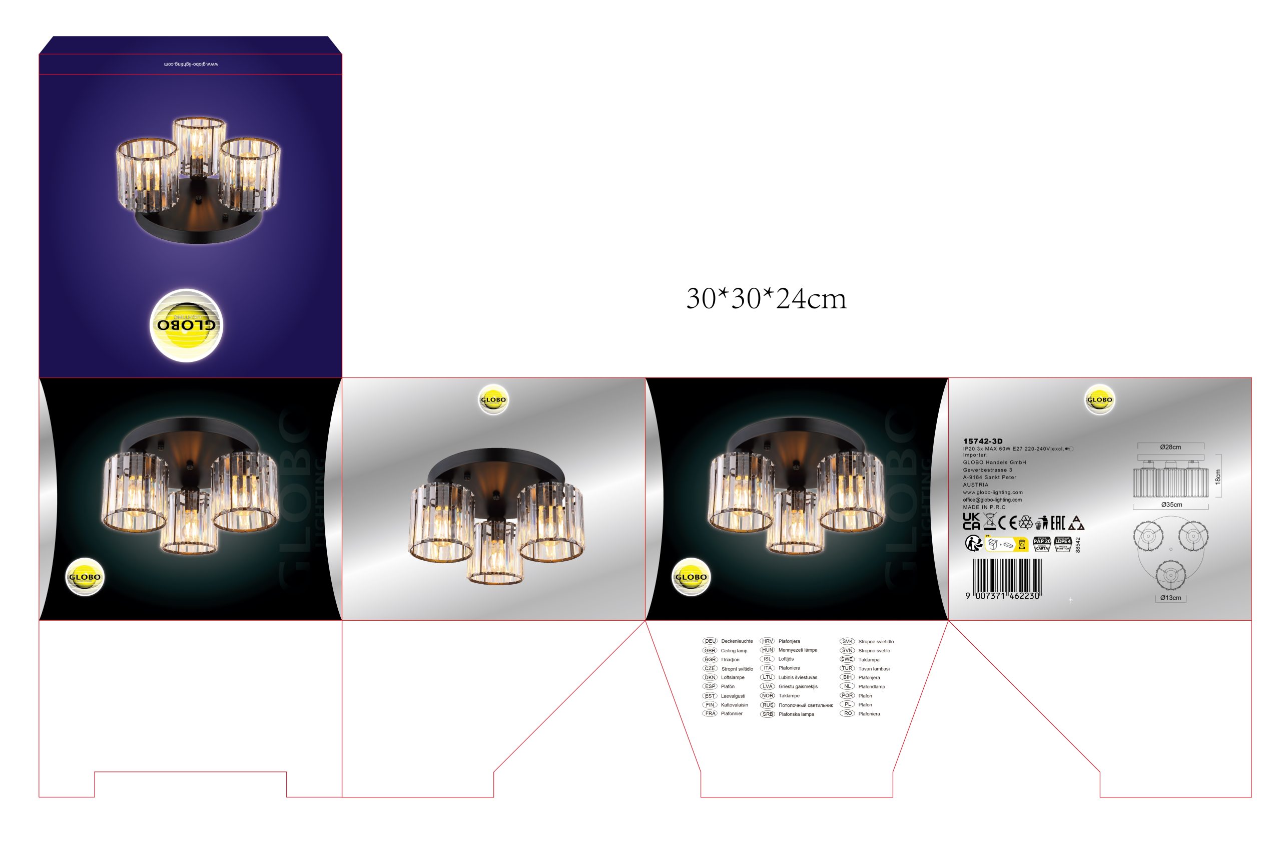 Otkrijte JORDANA, elegantnu viseću lampu koja se ističe svojim providnim akrilnim kristalima i jednostavnim dizajnom. Okrugla lampa se sastoji od tela napravljenog od crnog, mat lakiranog metala, koje može da primi tri abažura. Svaki suncobran je opremljen providnim akrilnim kristalima, koji se elegantno ističu u okruglom obliku. Njen okrugli oblik i providni kristali daju lampi plemenit izgled. Okrugla lampa JORDANA je savršena za dekoraciju plafona ili zidova. Neophodna je za one koji žele da stvore bezvremensku i elegantnu atmosferu u svom domu.