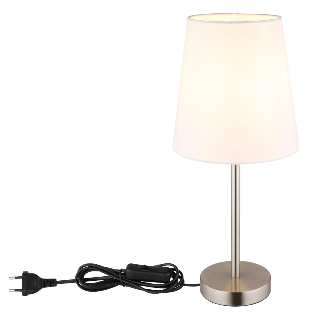 Stona lampa JORIS je stilski dodatak svakoj prostoriji. Napravljena od nikl-mat metala i belog tekstila, zrači elegancijom i modernošću. Sa prečnikom od 200 mm i visinom od 450 mm, kompaktna je i idealna za stolove, noćne stočiće ili radne površine. Prekidač na kablu omogućava lako rukovanje. Dužina kabla od 1500 mm pruža fleksibilnost u postavljanju. Imajte na umu da stona lampa sadrži 1x E14 25W 230V, tako da možete izabrati sijalicu po svom izboru. Stona lampa JORIS ne samo da nudi funkcionalno osvetljenje, već i estetski akcenat u vašem životnom prostoru.